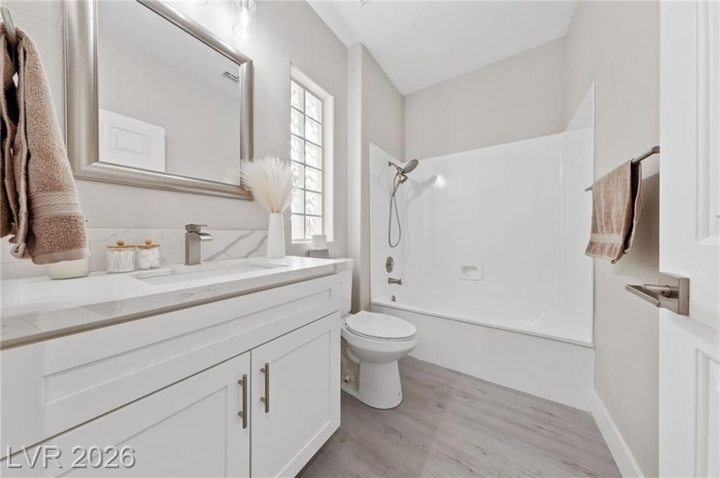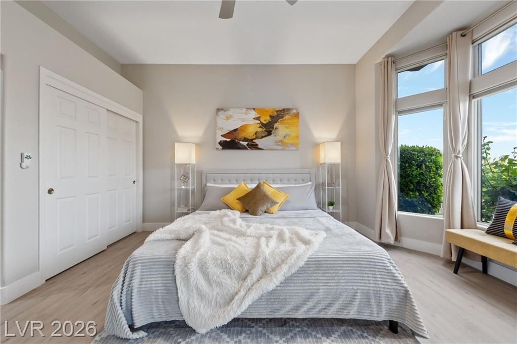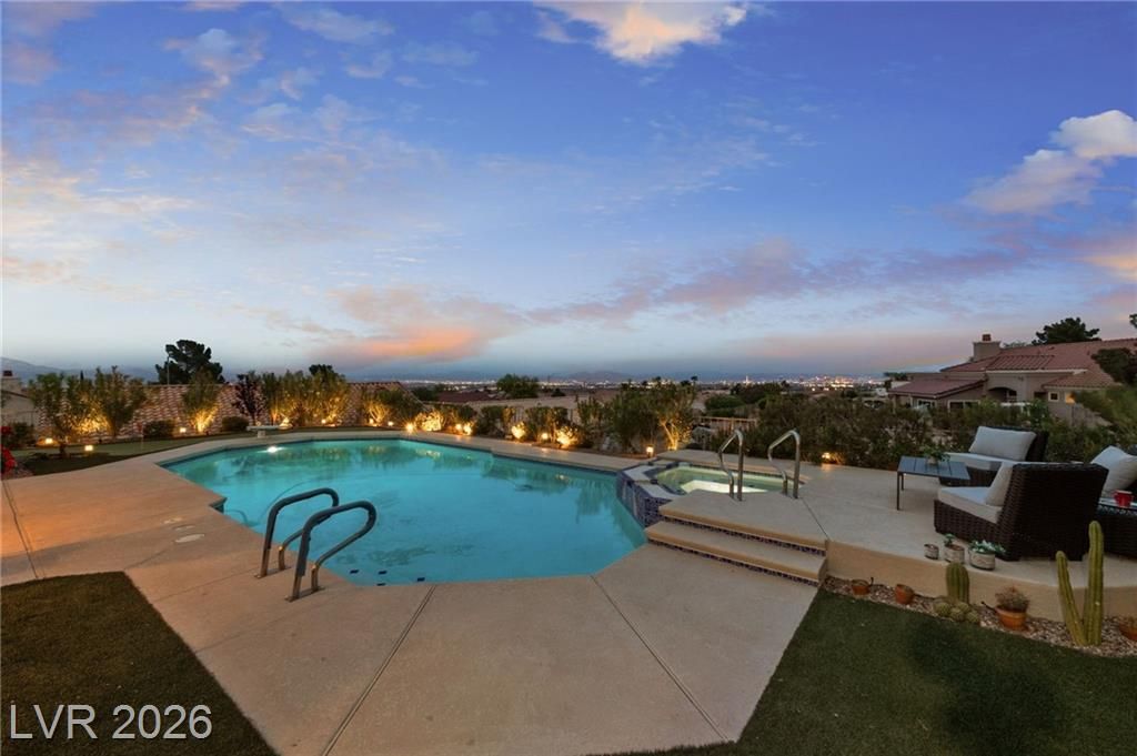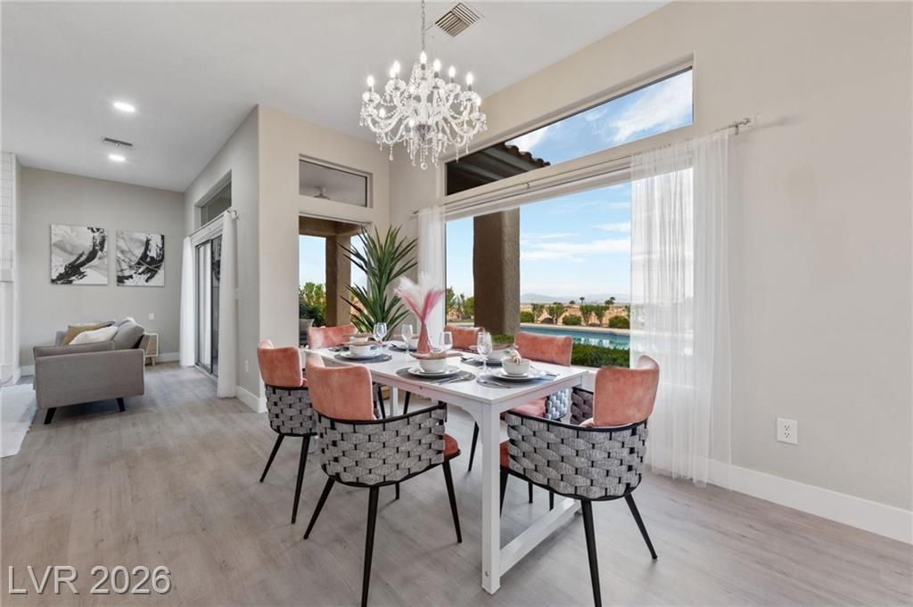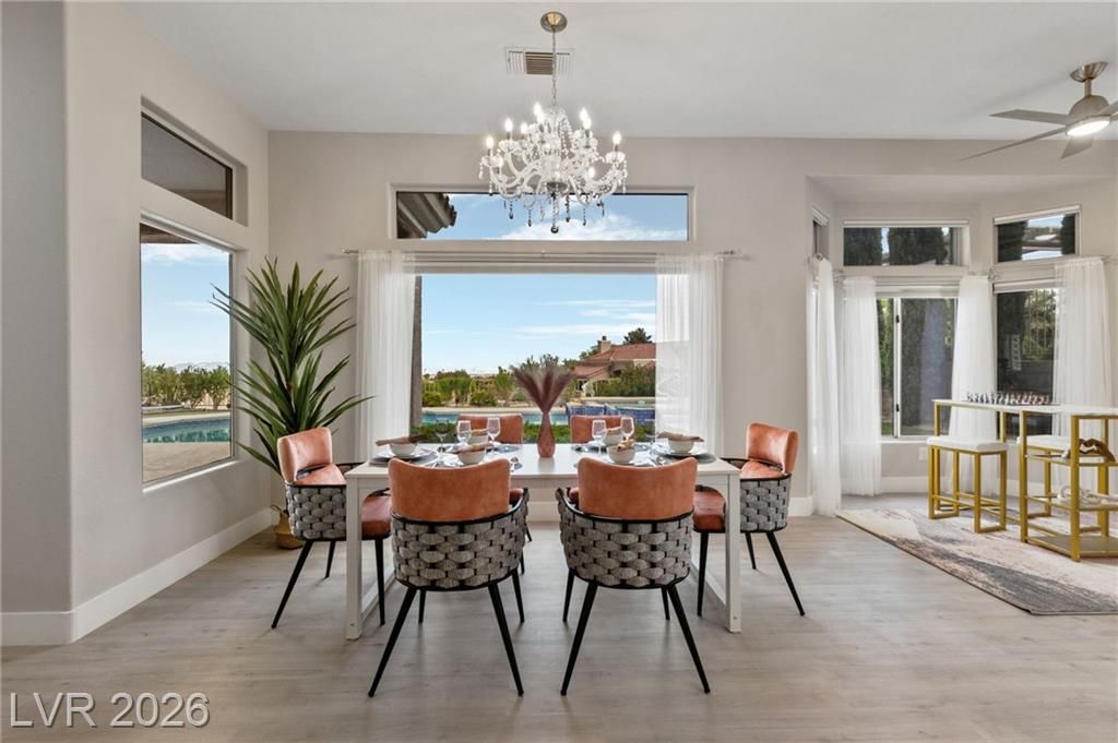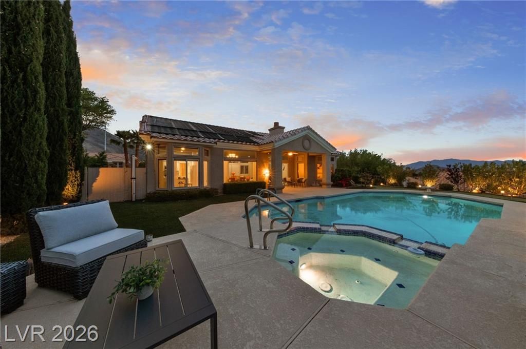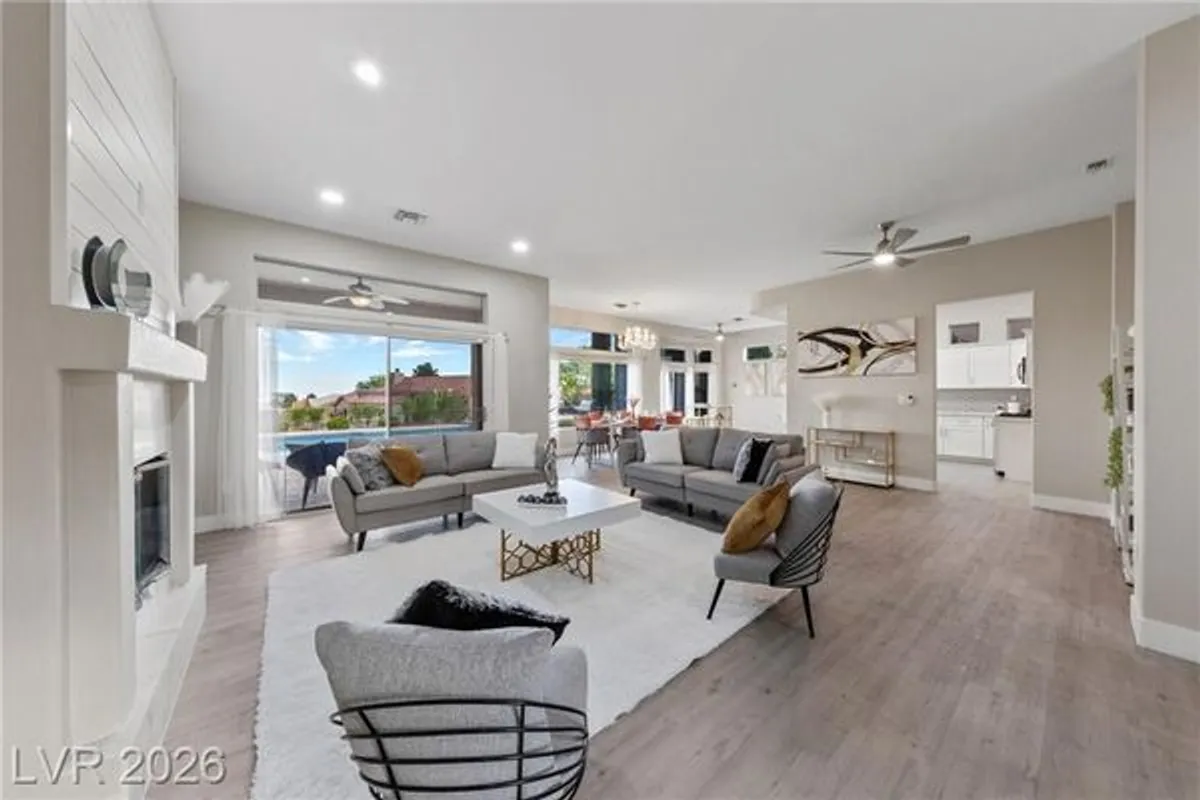 Stunning 1 story home located in the vibrant Sun City Summerlin 55+ community that sits high above with a sweeping 180-degree view of the valley & Strip. The property boasts a solar heated pool & shower, putting green and cover patio, perfect for enjoying a swim while taking in the unobstructed breathtaking Strip view. The home has been upgraded with modern features & finishes, ensuring a comfortable & stylish living experience. Step inside to find an open concept floor plan bathed with ambient natural light, cozy fireplace & luxury flooring that highlights the home's timeless appeal. This home features a designer's kitchen, quartz countertops, white shaker cabinets, stainless steel appliances, updated bathrooms and plenty of storage spaces. It especially showcases large windows that seamlessly blend indoor & outdoor living. This residence is ideal for those seeking a serene & active environment that combines conveniences, elegance & sustainability. **OWNER FINANCE @ negotiable terms**