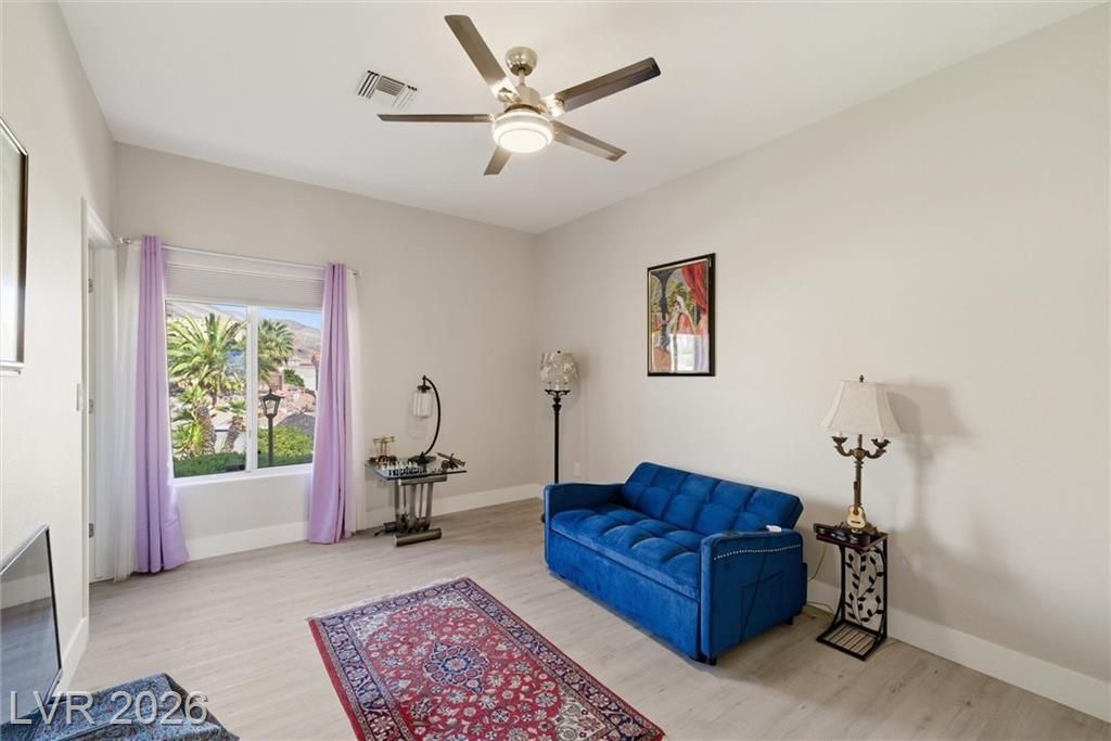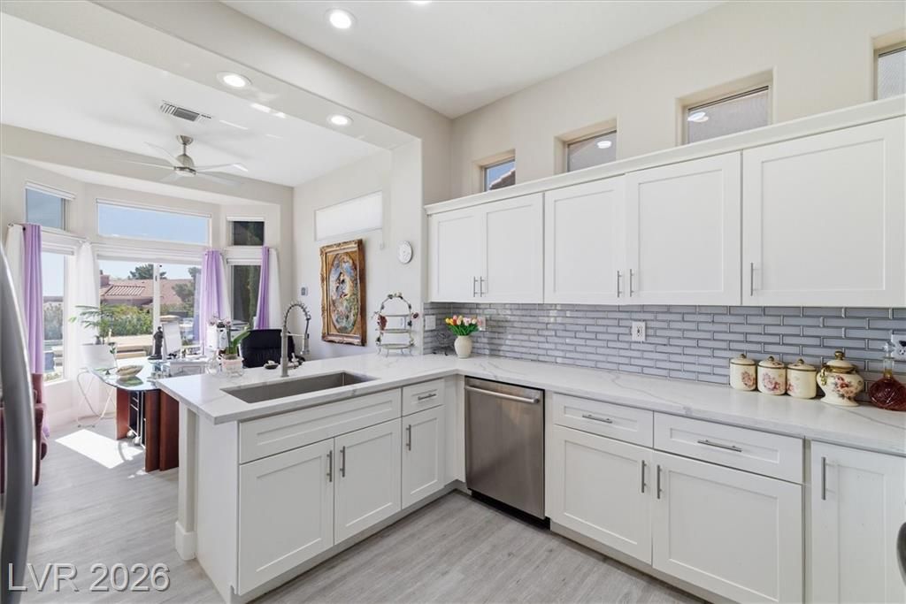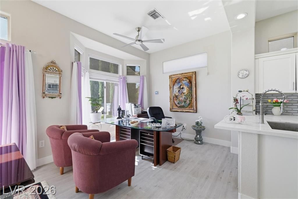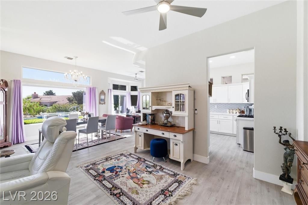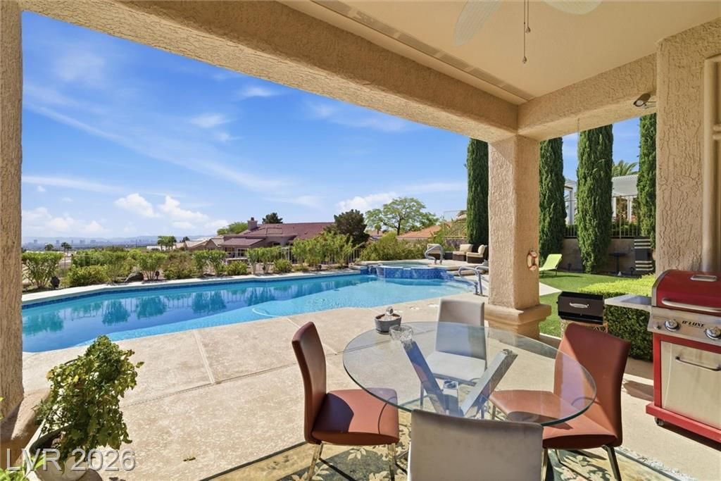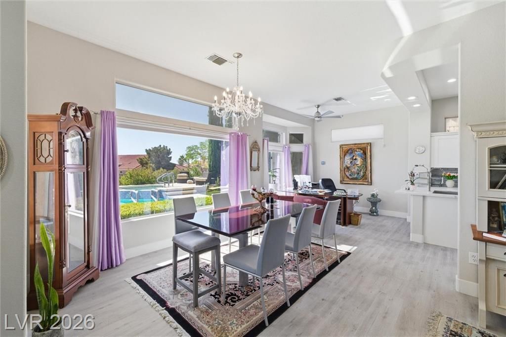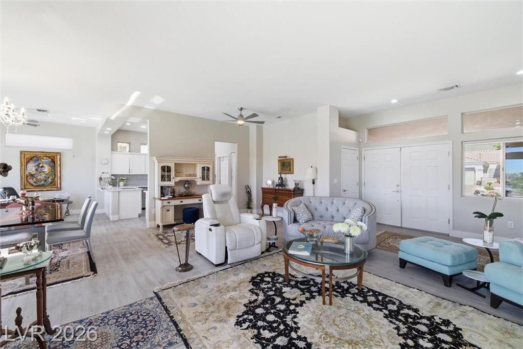 Experience elevated living in this stunning single-story home in Sun City Summerlin, a premier 55+ community. Perched high above the valley, this property captures breathtaking 180-degree views of the Las Vegas Strip and surrounding mountains.This beautifully upgraded home features a solar-heated pool, outdoor shower, private putting green, and covered patio, creating the perfect backyard oasis for relaxing or entertaining while enjoying unobstructed Strip views.Inside, the open-concept floor plan is filled with natural light and enhanced by luxury flooring, a cozy fireplace, and modern finishes throughout. The designer kitchen is equipped with quartz countertops, white shaker cabinets, stainless steel appliances, and ample storage, ideal for both everyday living and hosting guests. Updated bathrooms and thoughtfully designed spaces further elevate comfort and functionality. Large windows throughout the home seamlessly connect indoor and outdoor living, maximizing both light and views.