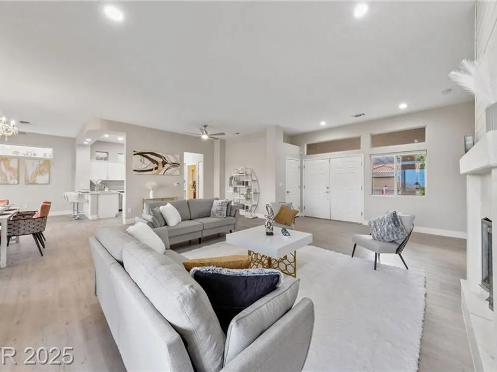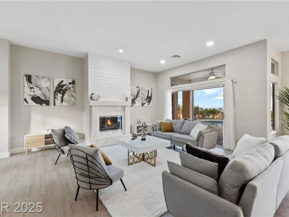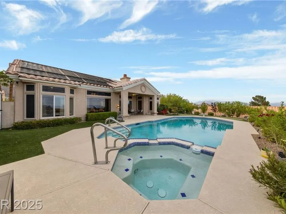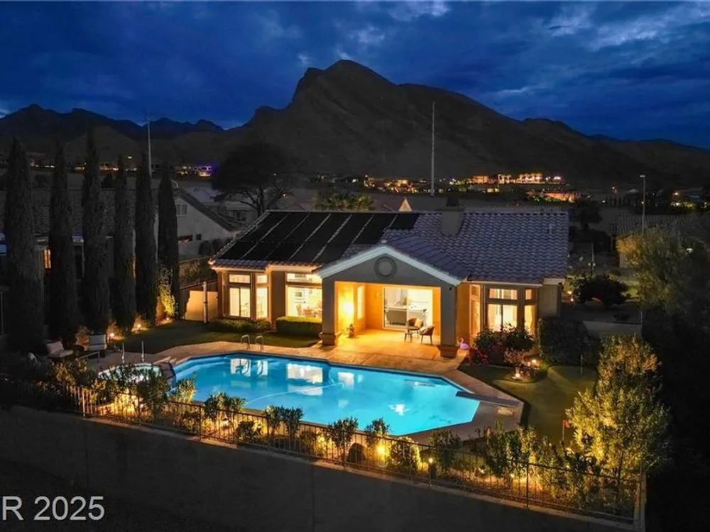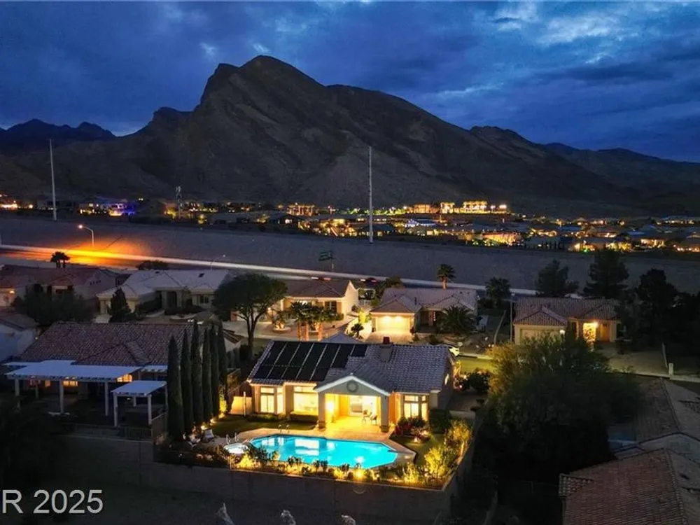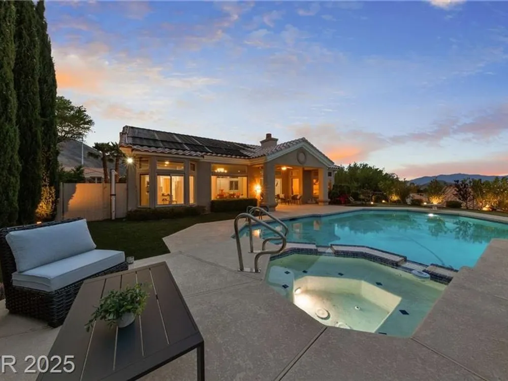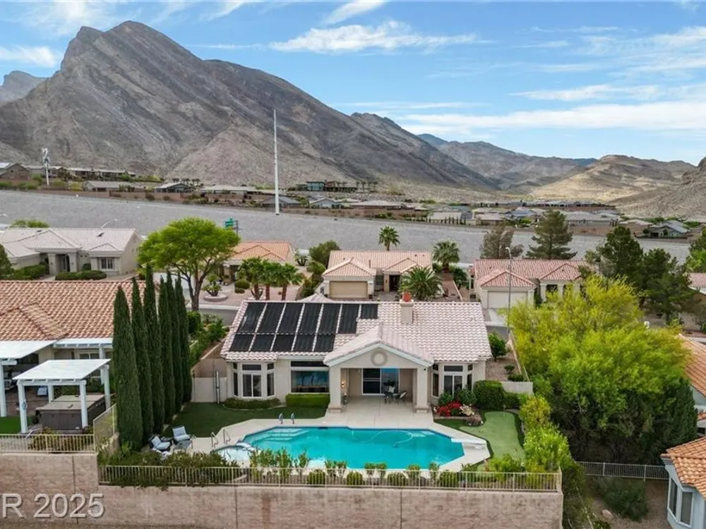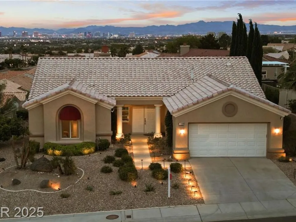 Stunning 1 story home located in the vibrant Sun City Summerlin 55+ community that sits high above with a sweeping 180-degree view of the valley & Strip. The property boasts a solar heated pool & shower, putting green and cover patio, perfect for enjoying a swim while taking in the unobstructed breathtaking Strip view. The home has been upgraded with modern features & finishes, ensuring a comfortable & stylish living experience. Step inside to find an open concept floor plan bathed with ambient natural light, cozy fireplace & luxury flooring that highlights the home's timeless appeal. This home features a designer's kitchen, quartz countertops, white shaker cabinets, stainless steel appliances, updated bathrooms and plenty of storage spaces. It especially showcases large windows that seamlessly blend indoor & outdoor living. This residence is ideal for those seeking a serene & active environment that combines conveniences, elegance & sustainability.