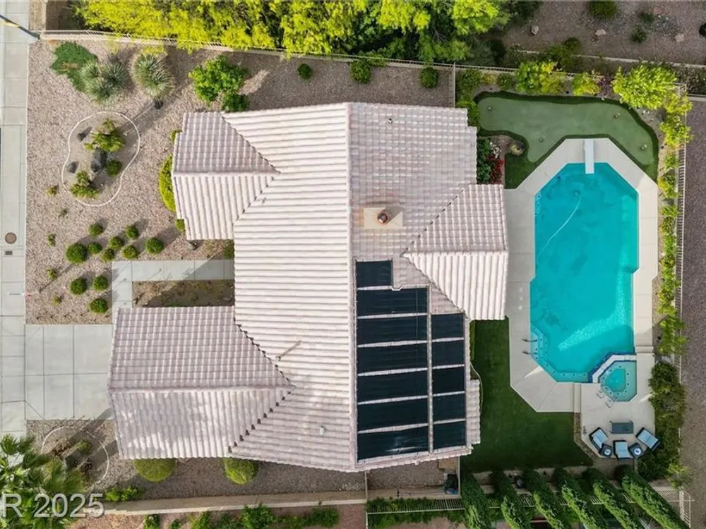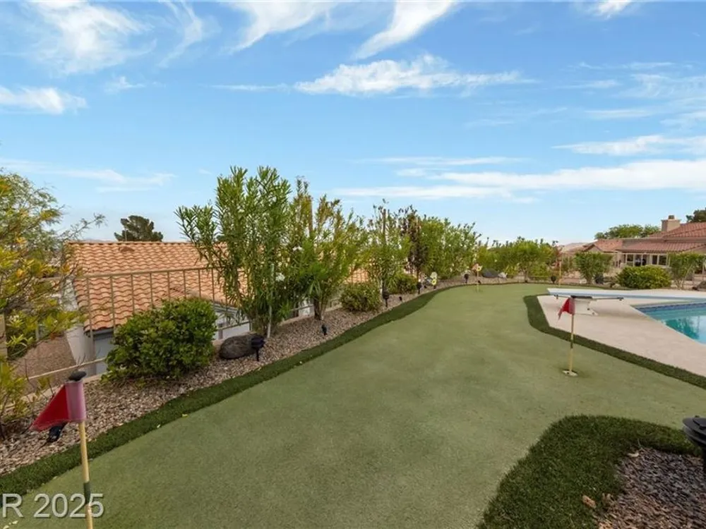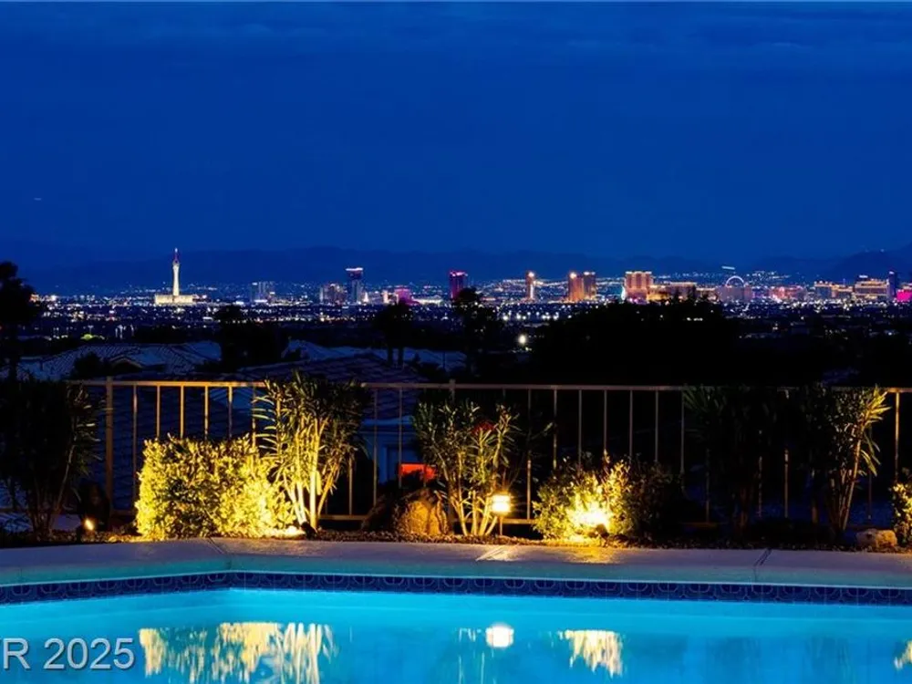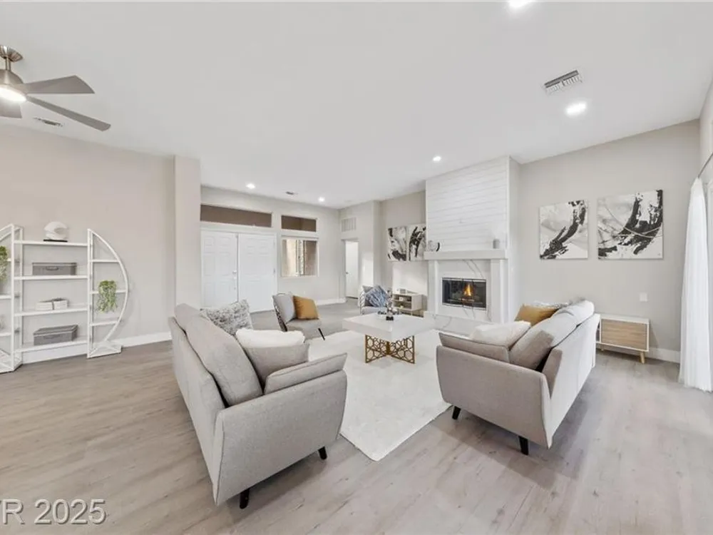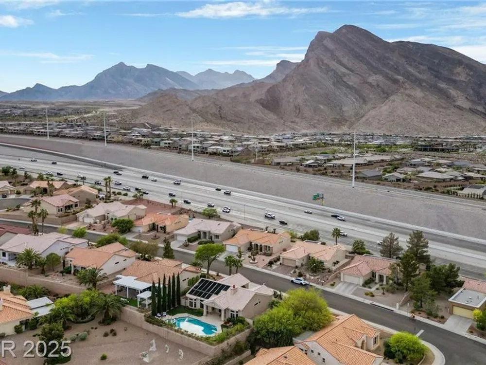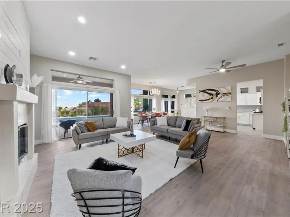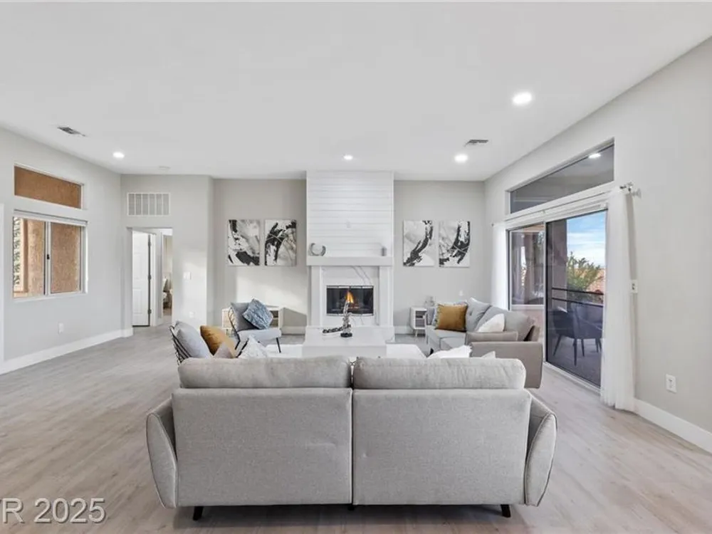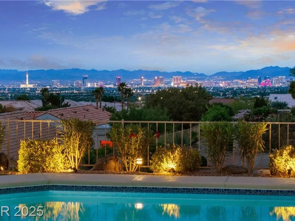 Stunning 1 story home located in the vibrant Sun City Summerlin 55+ community that sits high above with a sweeping 180-degree view of the valley & Strip. The property boasts a solar heated pool & shower, putting green and cover patio, perfect for enjoying a swim while taking in the unobstructed breathtaking Strip view. The home has been upgraded with modern features & finishes, ensuring a comfortable & stylish living experience. Step inside to find an open concept floor plan bathed with ambient natural light, cozy fireplace & luxury flooring that highlights the home's timeless appeal. This home features a designer's kitchen, quartz countertops, white shaker cabinets, stainless steel appliances, updated bathrooms and plenty of storage spaces. It especially showcases large windows that seamlessly blend indoor & outdoor living. This residence is ideal for those seeking a serene & active environment that combines conveniences, elegance & sustainability.