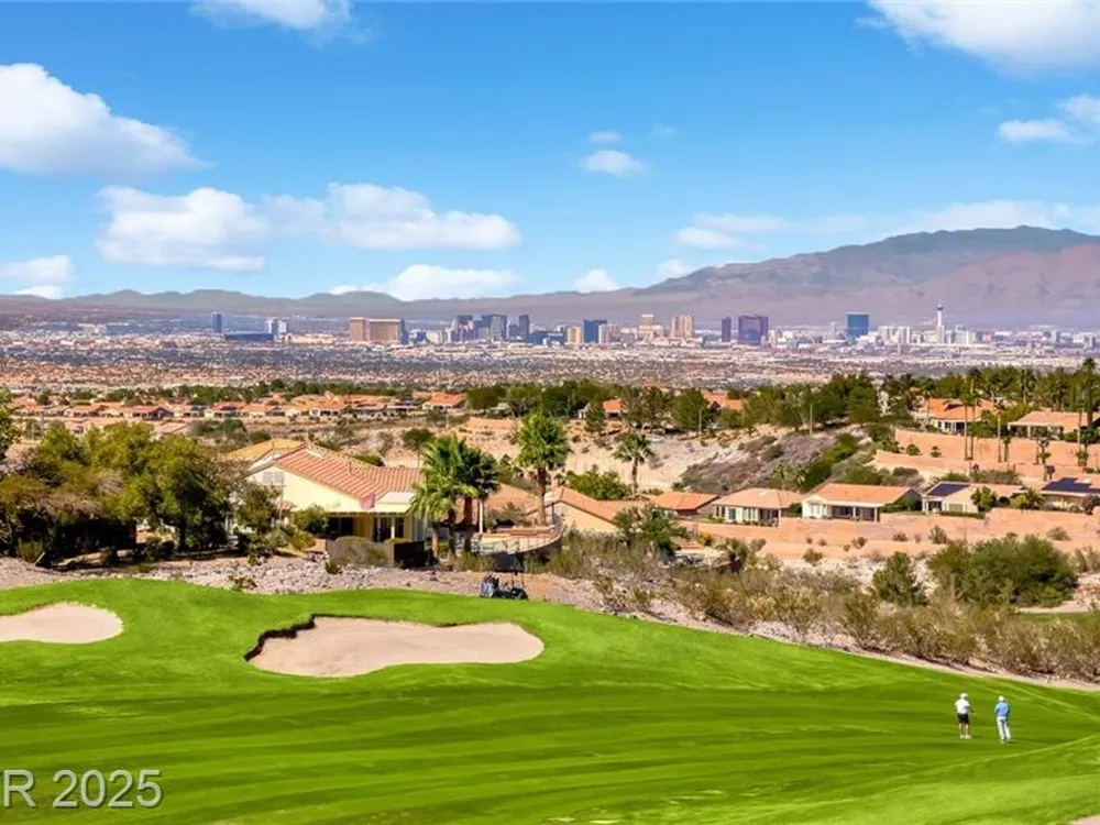 Expanded Anthem model with breathtaking views of the entire Las Vegas Strip, golf course, and mountains. Perched high above the 18 hole of the Concord golf course, this premium view property offers two separate entrances perfect for multigenerational or NextGen living. A grand entry leads to a formal living room with dramatic curved windows, tile flooring, and wet bar ideal for entertaining. The chef’s kitchen features granite counters, large island, stainless appliances, and opens to the family room. The spacious primary suite includes sitting area and spa-like bath with dual vanities, makeup table, and soaking tub. Upgrades include plantation shutters, electric blinds, Rolladen shutters, epoxy garage flooring, and new high efficiency Trane AC units. The low-maintenance backyard features expansive covered patio with panoramic views of the valley and city lights. Located in a Top Rated premier 55+ community with golf, tennis, pickleball, pools, and vibrant social activities.