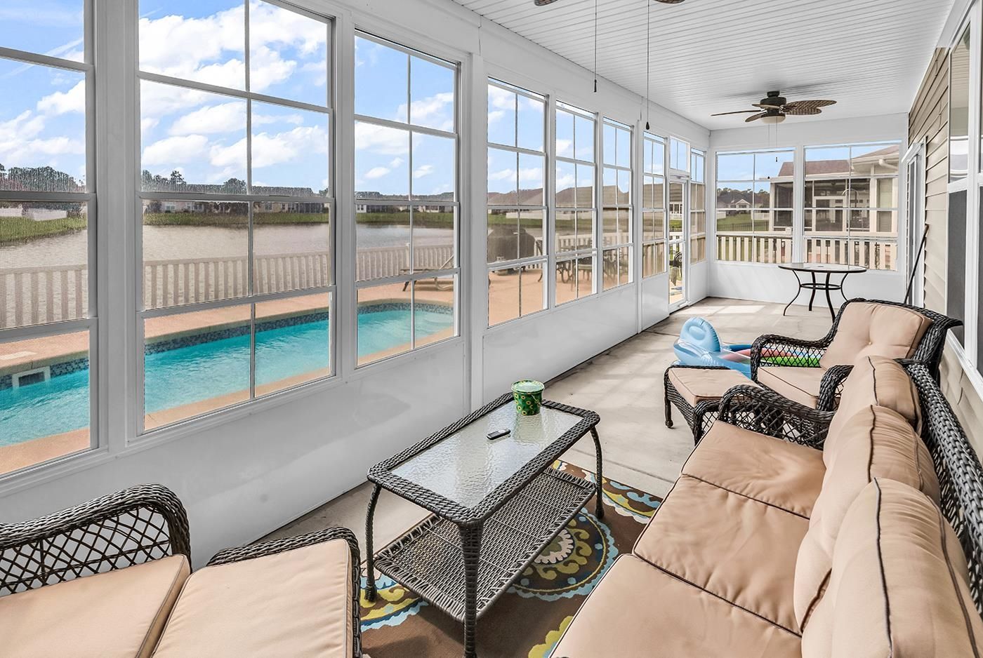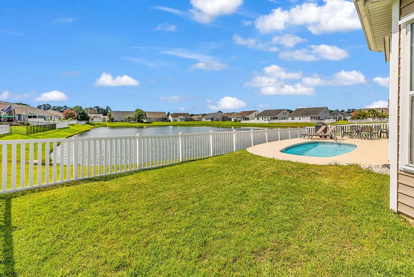 4 Bedroom, 3 baths, water view single level home with a private pool, formal dining room and solar panels!!!! This home has it all. As you walk through the front door, the home welcomes you in with beautiful flooring leading through the home. The large living Room opens into the kitchen with a granite topped Island that also is a breakfast bar and plenty of windows with views of the lake. The kitchen has lots of granite counterspace, a bounty of cabinets, a pantry and plenty of room for a table to eat in the kitchen. If you do not want to eat in the kitchen, the formal dining room welcomes you. The private main bedroom has plenty of room for large furniture, a sitting area and views of the backyard and lake. Off the Main Bedroom is your private main bath with a large walk-in shower, double sink, open space and a large walk-in closet. The other three bedrooms are all comfortably sized rooms with plenty of closet space. The rear screened porch is 39’ x 9” That’s plenty of room and overlooks your private pool, patio and water view. This home is 9 years young, has many upgrades and is in excellent shape. This well-maintained home is in better than new condition and is ready for you to move in. All measurements are approximate and not guaranteed; the buyer is responsible for verification. To sum up: 4 bedrooms, 3 bath, formal dining room, eat-in kitchen, breakfast bar, granite countertops, large private main bedroom/bath/walk-in closet, 2 car garage, Pool, water view, fenced yard and more….. This home has it all.