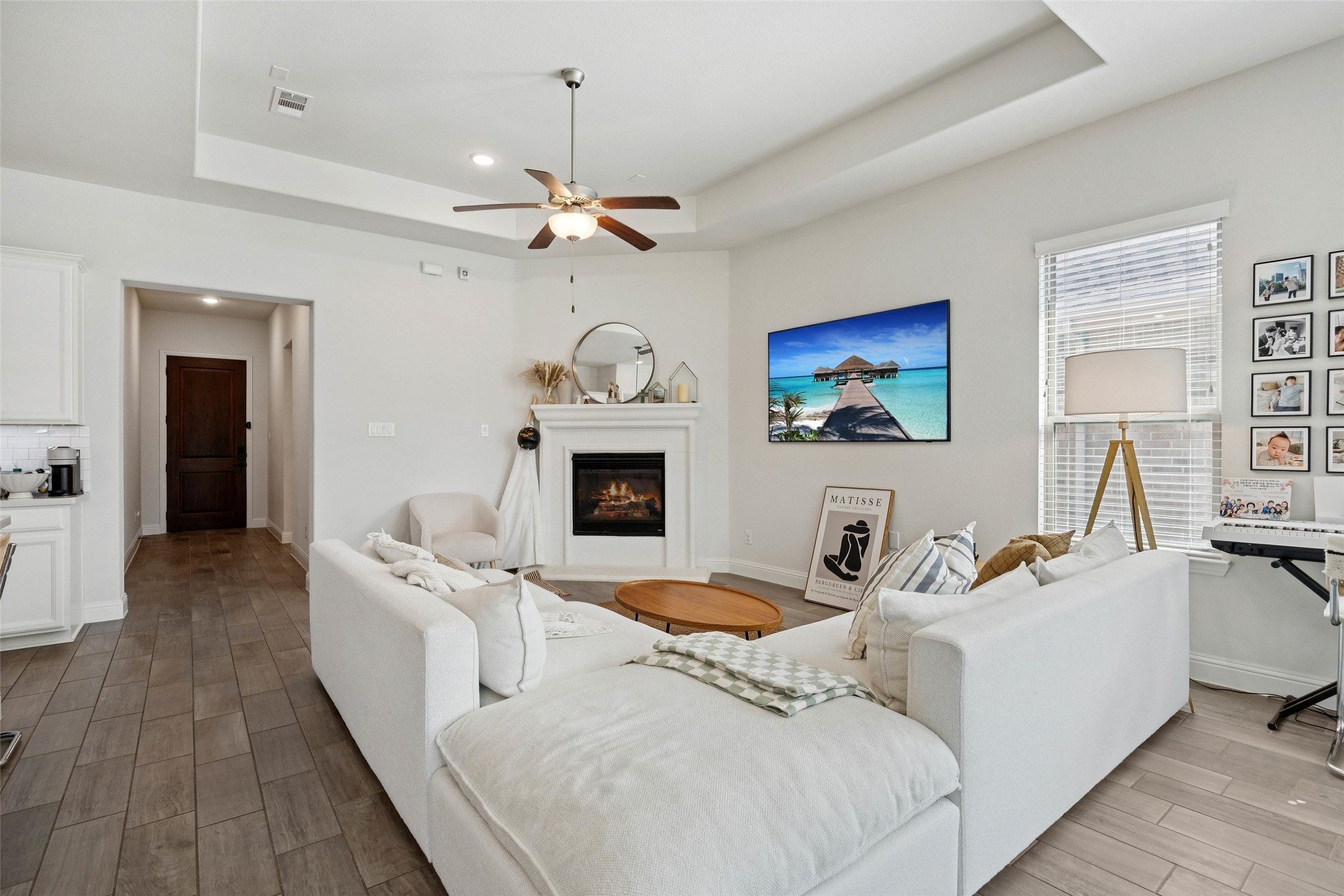 Beautiful, move-in ready one-story home in the quiet, established Waterford Point neighborhood, just a short walk from the scenic shores of Lake Lewisville. This gorgeous property impresses at every turn with an open-concept floorplan that creates a light and airy feel, enhanced by abundant natural light and a fresh, neutral color palette. At the heart of the home is the expansive living room with a cozy corner fireplace, seamlessly connected to the sunlit dining area and stunning gourmet kitchen. The kitchen is a chef’s delight, boasting a large island breakfast bar, abundant crisp white cabinetry, a spacious walk-in pantry, stainless steel appliances including a gas cooktop, and a designer tile backsplash that adds the perfect touch of style. The tranquil primary suite is privately tucked away at the back of the home and features a spa-like bath with soaking tub, oversized walk-in shower, and a large walk-in closet with convenient access to the laundry room. Enjoy the outdoors year-round on the covered patio overlooking the backyard. An attached two-car garage adds security, storage, and everyday convenience. Addes bonus, seller including Samsung Washer & Dryer, Refrigerator and 75-inch TV in the living room with the sale of the home. Don’t miss this rare opportunity to call this Waterford Point gem your home—schedule your private tour today!