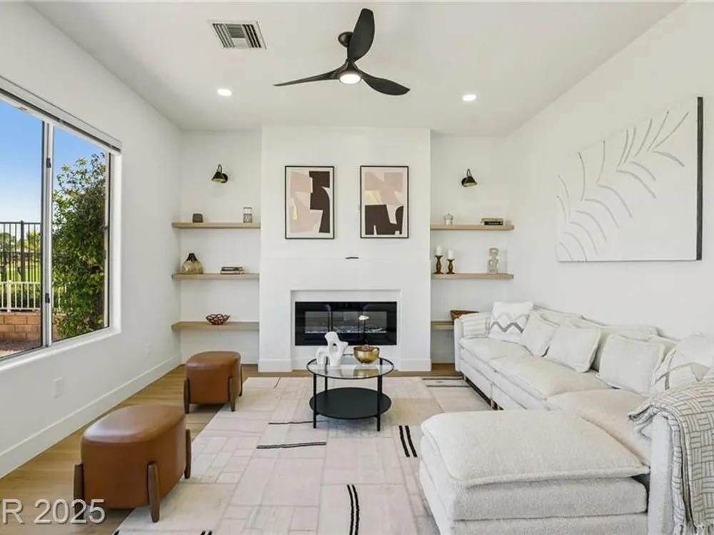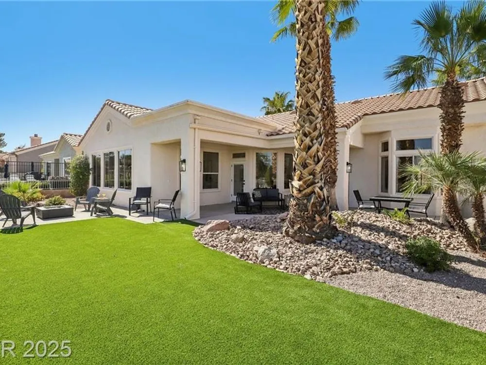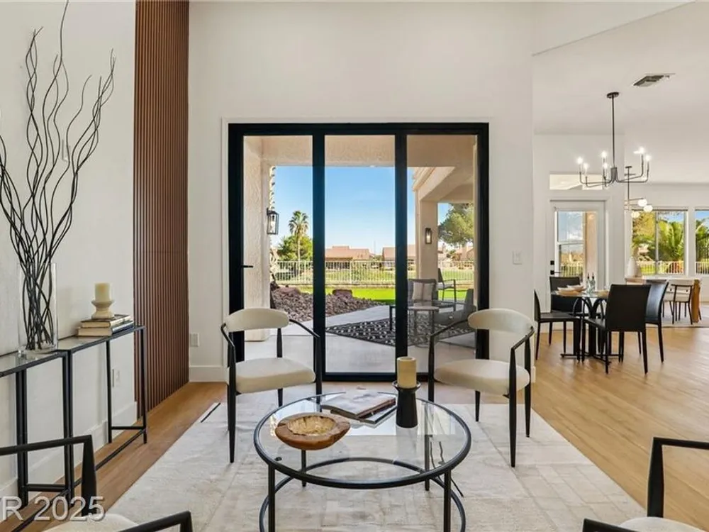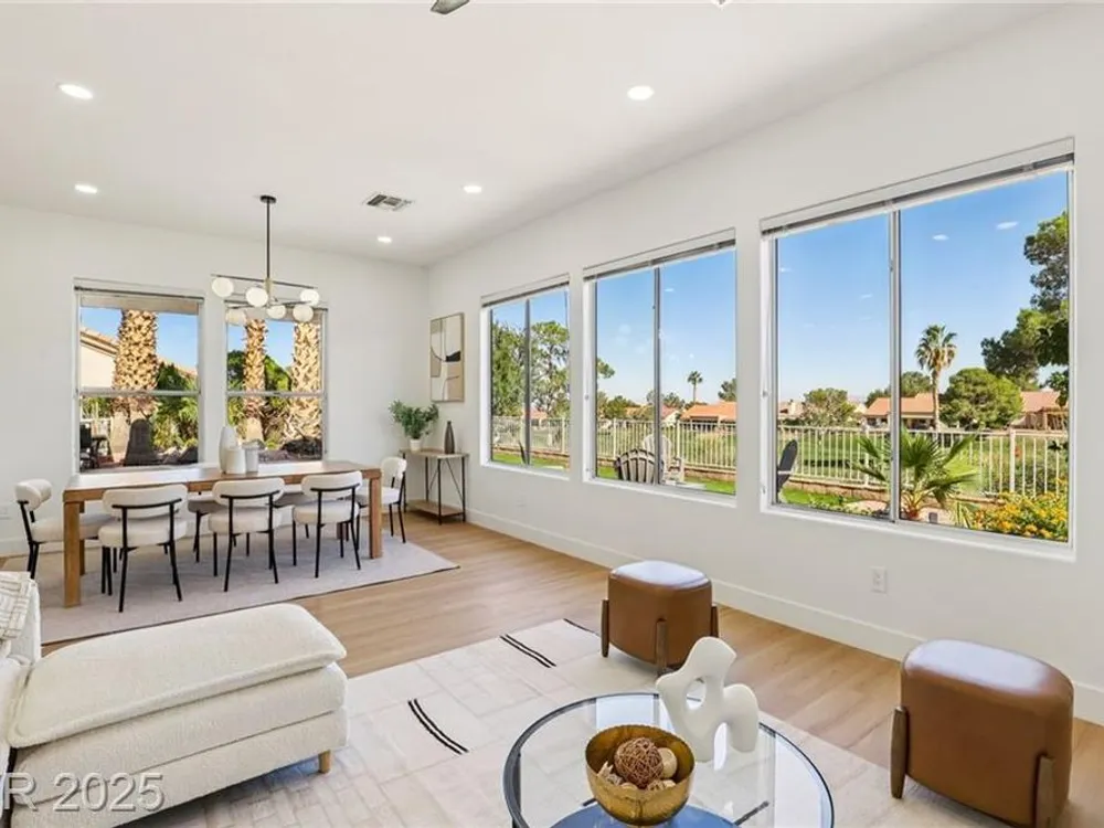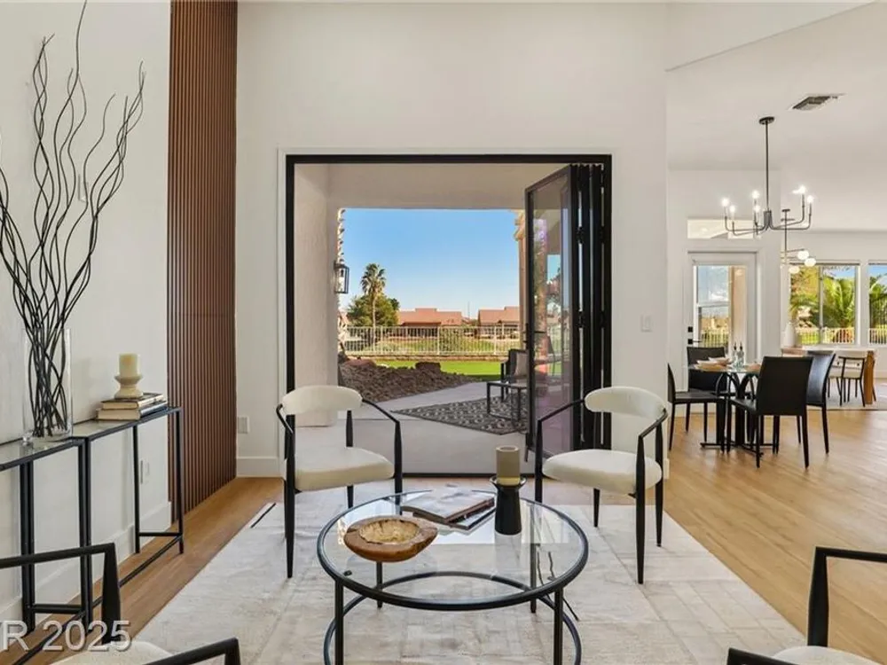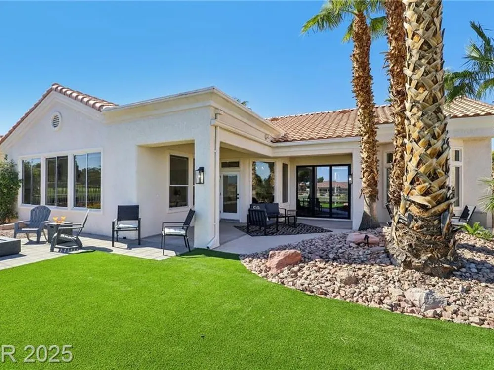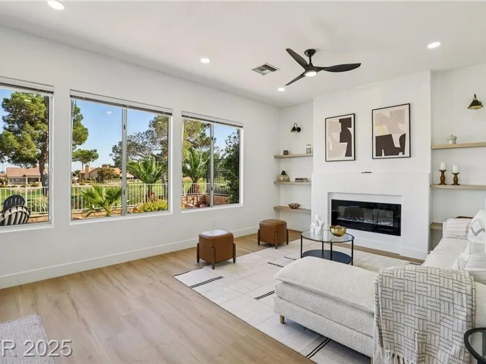 Re-designed 3 BR Regal model updated w/ modern luxury finishes & breathtaking golf course views! Step into an open & airy living space w/ high ceilings, new wide-plank flooring & accordion doors for indoor/outdoor living. An additional family room offers a sleek fireplace framed by floating shelves. Expansive windows fill the home w/ natural light while showcasing serene fairway views. The chef’s kitchen boasts high-end appliances, wine fridge, custom hood, pot-filler, quartz counters w/ waterfall island & 2-tier cabinetry. The primary suite features a spa-inspired bath w/ dual vanities, soaking tub, walk-in shower & built-in closet. Enjoy a fenced backyard w/ new turf, BBQ grill, firepit & room to entertain, all while overlooking Palm Valley Golf Course. Expanded garage w/golfcart space, EV charging outlet & water softener. Sun City Summerlin offers world-class amenities including golf, pools, clubhouses, & more. A truly one-of-a-kind property blending elegance, function, & lifestyle.