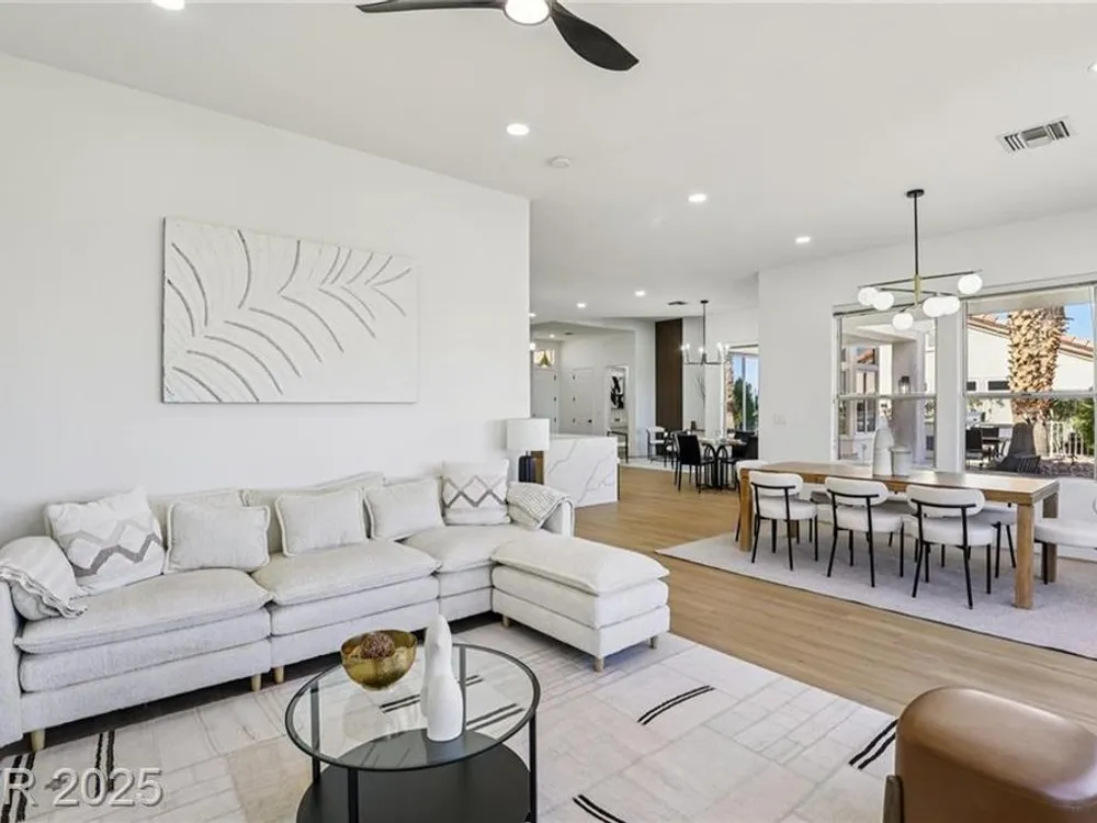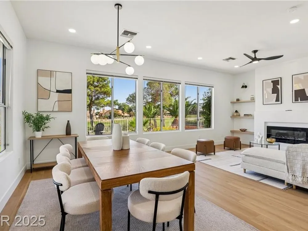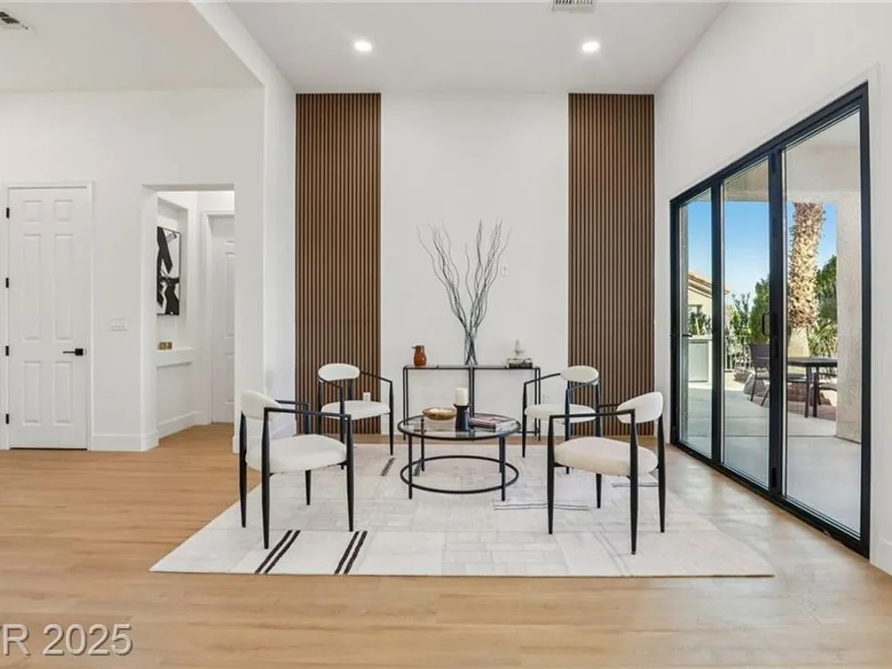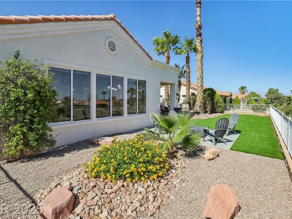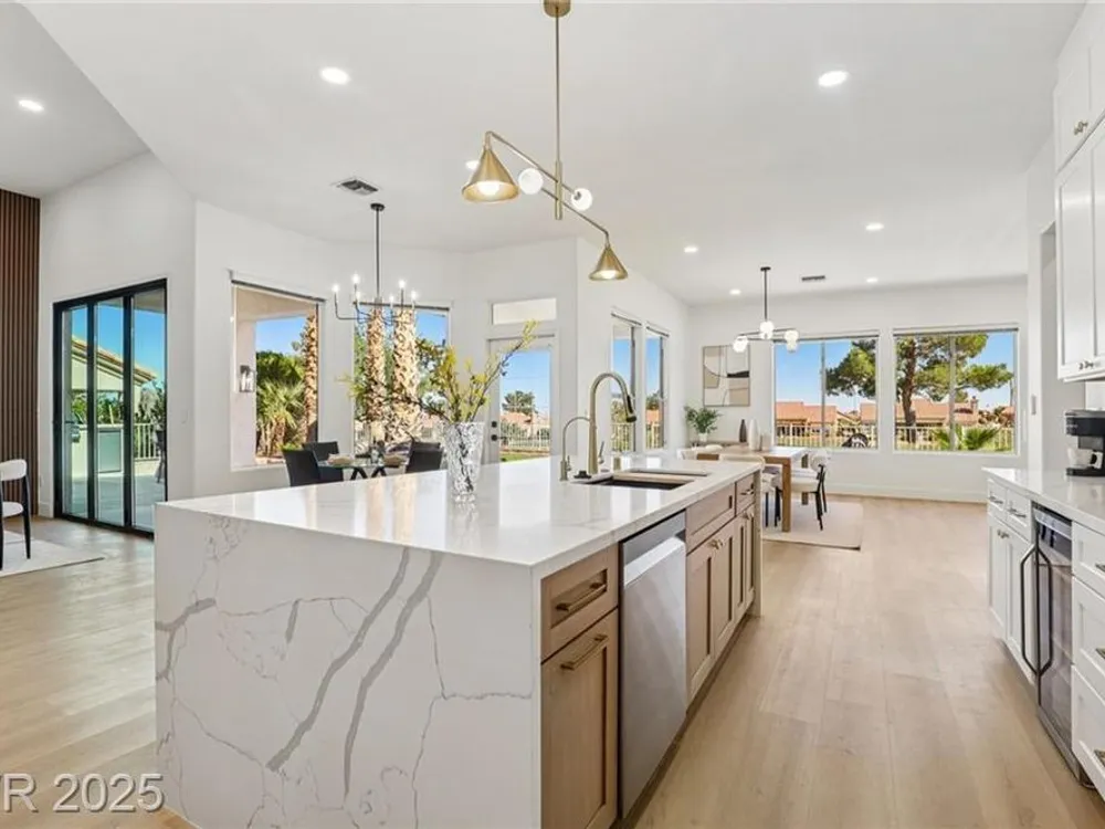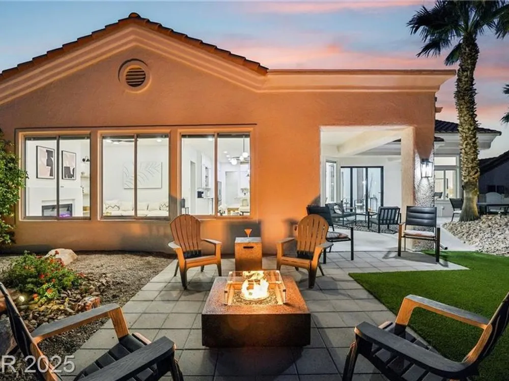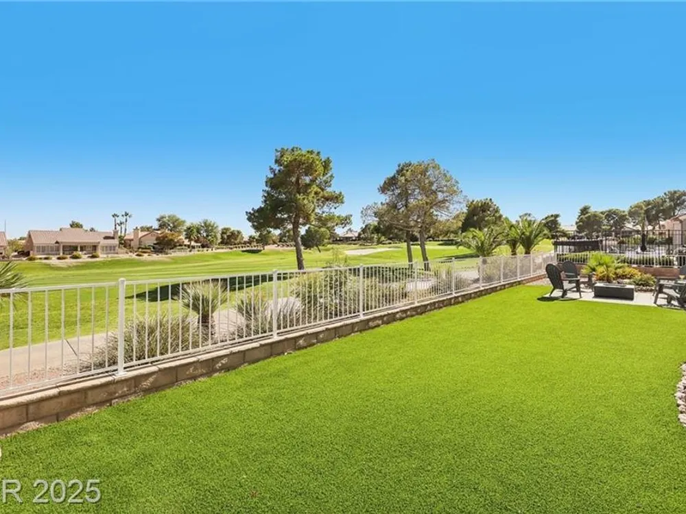 Re-designed 3 BR Regal model updated w/ modern luxury finishes & breathtaking golf course views! Step into an open & airy living space w/ high ceilings, new wide-plank flooring & accordion doors for indoor/outdoor living. An additional family room offers a sleek fireplace framed by floating shelves. Expansive windows fill the home w/ natural light while showcasing serene fairway views. The chef’s kitchen boasts high-end appliances, wine fridge, custom hood, pot-filler, quartz counters w/ waterfall island & 2-tier cabinetry. The primary suite features a spa-inspired bath w/ dual vanities, soaking tub, walk-in shower & built-in closet. Enjoy a fenced backyard w/ new turf, BBQ grill, firepit & room to entertain, all while overlooking Palm Valley Golf Course. Expanded garage w/golfcart space, EV charging outlet & water softener. Sun City Summerlin offers world-class amenities including golf, pools, clubhouses, & more. A truly one-of-a-kind property blending elegance, function, & lifestyle.