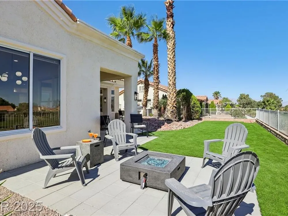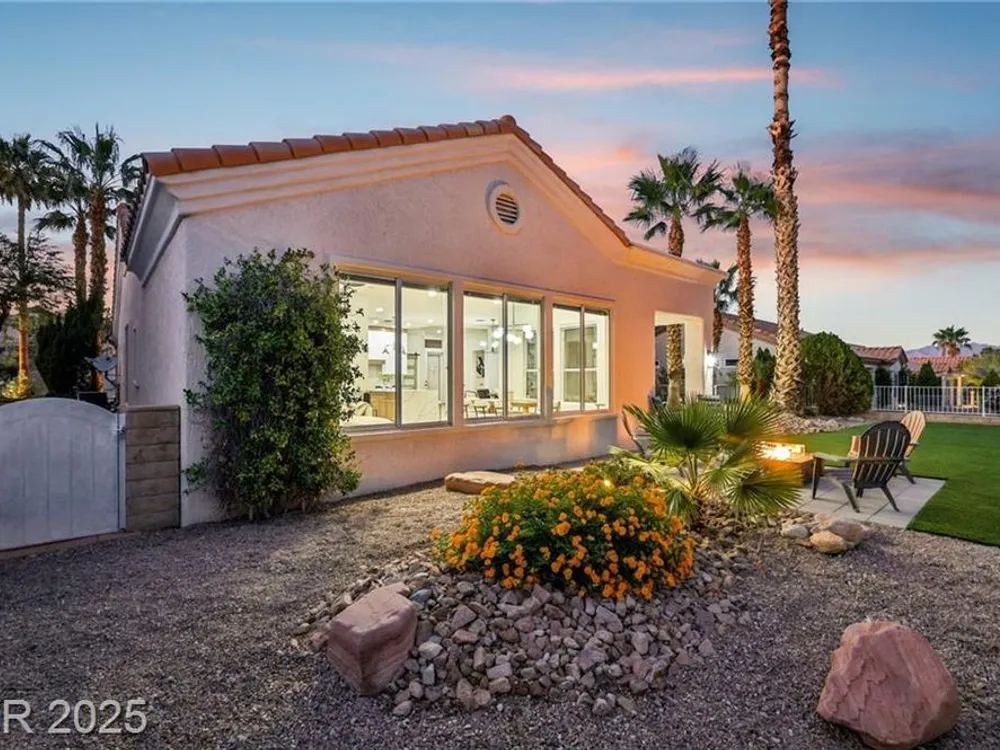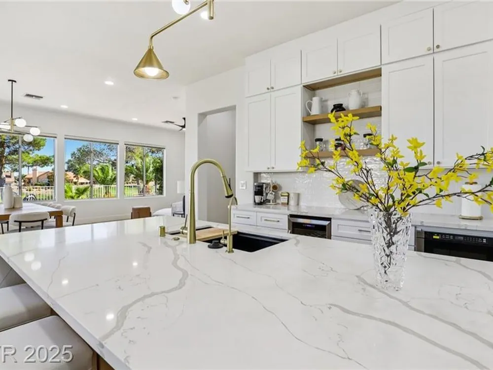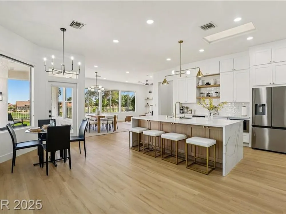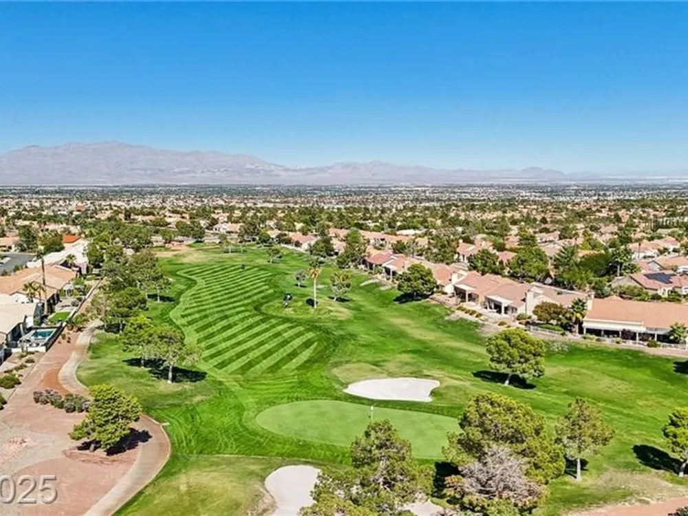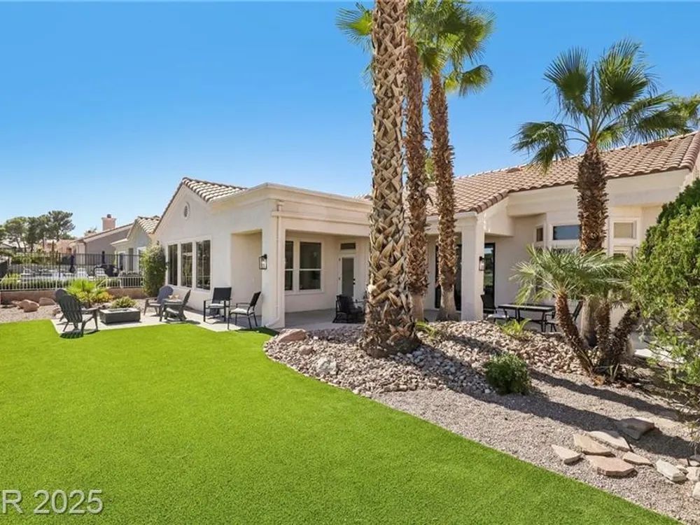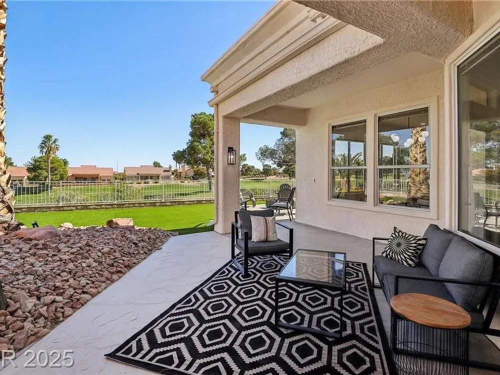 Re-designed 3 BR Regal model updated w/ modern luxury finishes & breathtaking golf course views! Step into an open & airy living space w/ high ceilings, new wide-plank flooring & accordion doors for indoor/outdoor living. An additional family room offers a sleek fireplace framed by floating shelves. Expansive windows fill the home w/ natural light while showcasing serene fairway views. The chef’s kitchen boasts high-end appliances, wine fridge, custom hood, pot-filler, quartz counters w/ waterfall island & 2-tier cabinetry. The primary suite features a spa-inspired bath w/ dual vanities, soaking tub, walk-in shower & built-in closet. Enjoy a fenced backyard w/ new turf, BBQ grill, firepit & room to entertain, all while overlooking Palm Valley Golf Course. Expanded garage w/golfcart space, EV charging outlet & water softener. Sun City Summerlin offers world-class amenities including golf, pools, clubhouses, & more. A truly one-of-a-kind property blending elegance, function, & lifestyle.