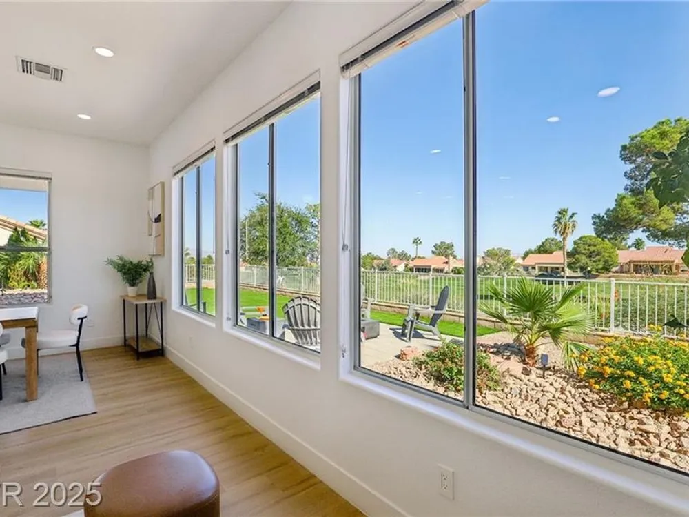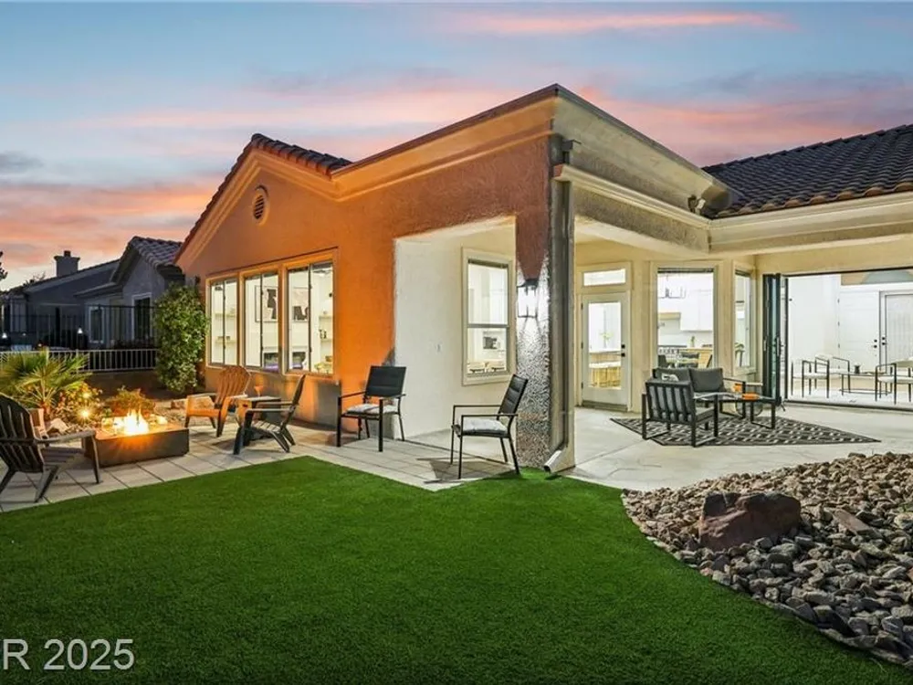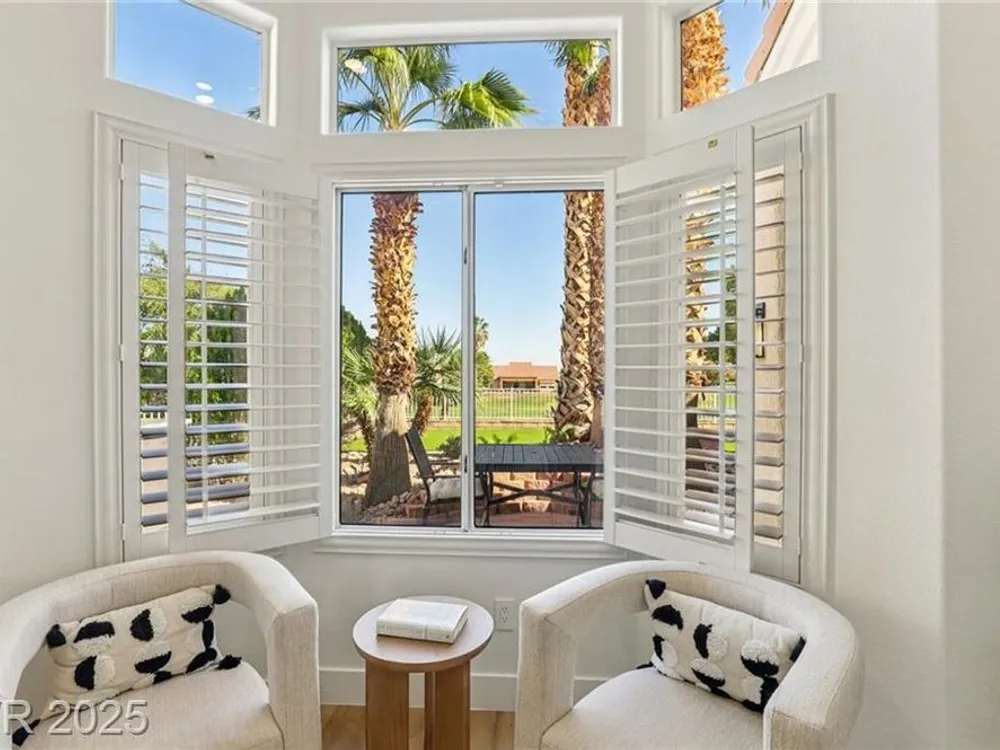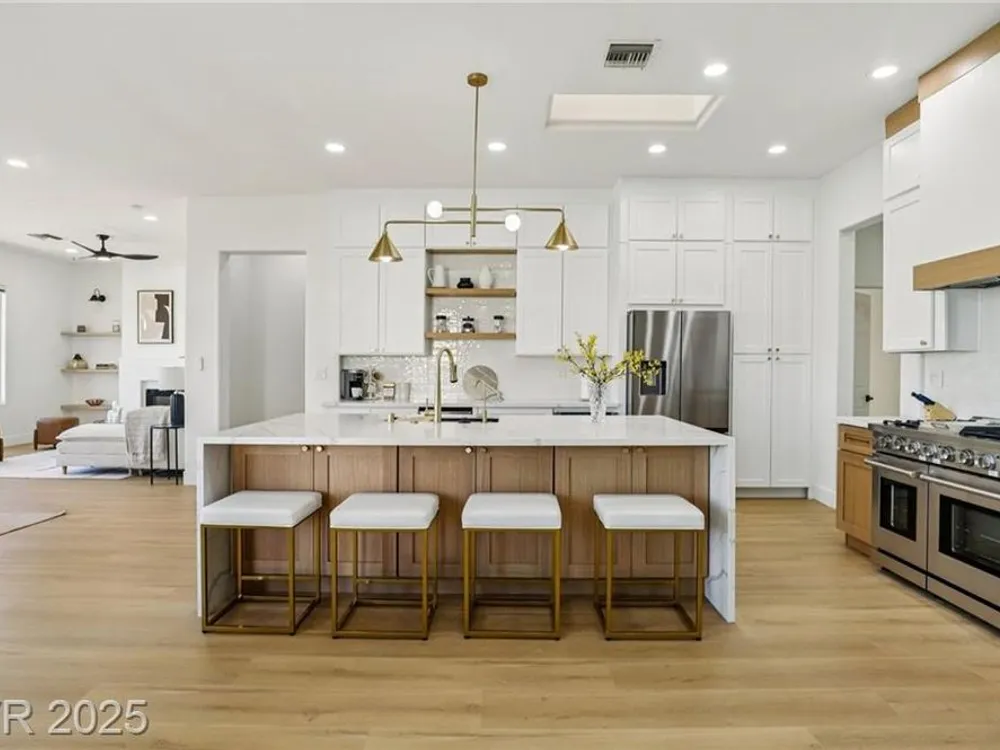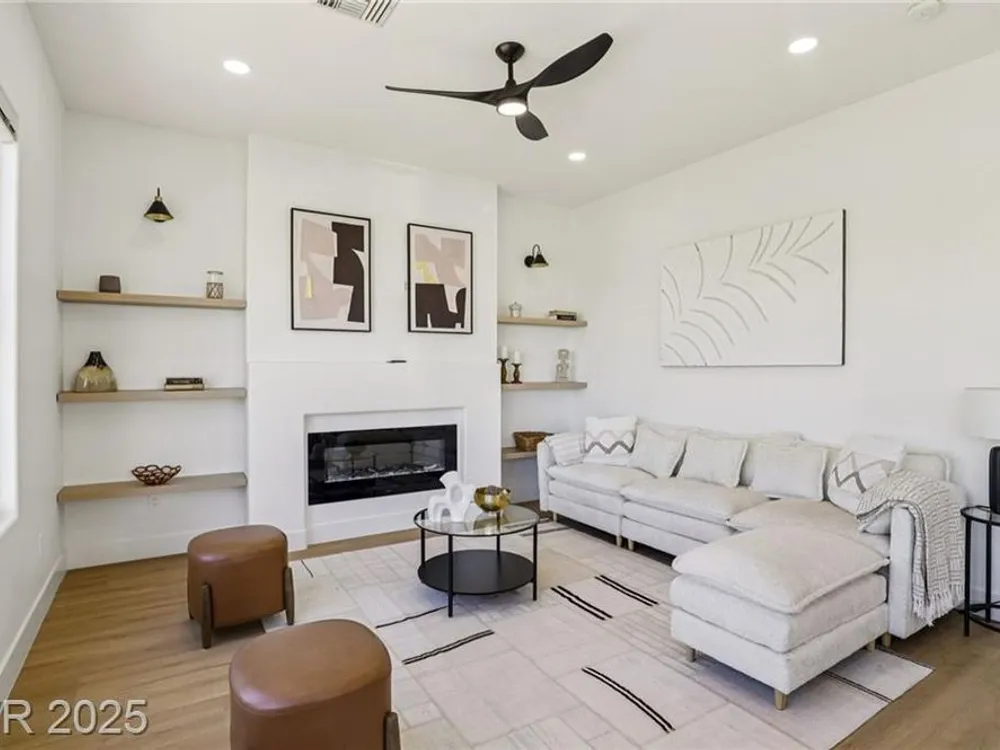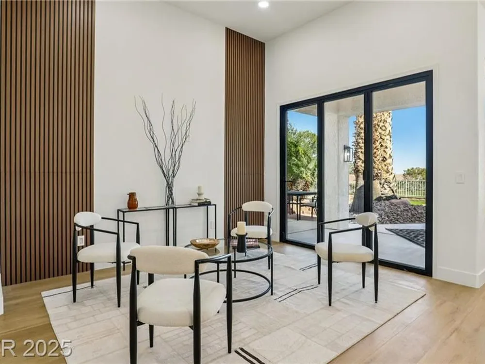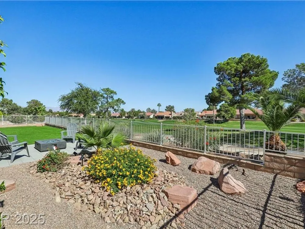 Re-designed 3 BR Regal model updated w/ modern luxury finishes & breathtaking golf course views! Step into an open & airy living space w/ high ceilings, new wide-plank flooring & accordion doors for indoor/outdoor living. An additional family room offers a sleek fireplace framed by floating shelves. Expansive windows fill the home w/ natural light while showcasing serene fairway views. The chef’s kitchen boasts high-end appliances, wine fridge, custom hood, pot-filler, quartz counters w/ waterfall island & 2-tier cabinetry. The primary suite features a spa-inspired bath w/ dual vanities, soaking tub, walk-in shower & built-in closet. Enjoy a fenced backyard w/ new turf, BBQ grill, firepit & room to entertain, all while overlooking Palm Valley Golf Course. Expanded garage w/golfcart space, EV charging outlet & water softener. Sun City Summerlin offers world-class amenities including golf, pools, clubhouses, & more. A truly one-of-a-kind property blending elegance, function, & lifestyle.
