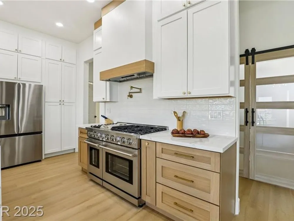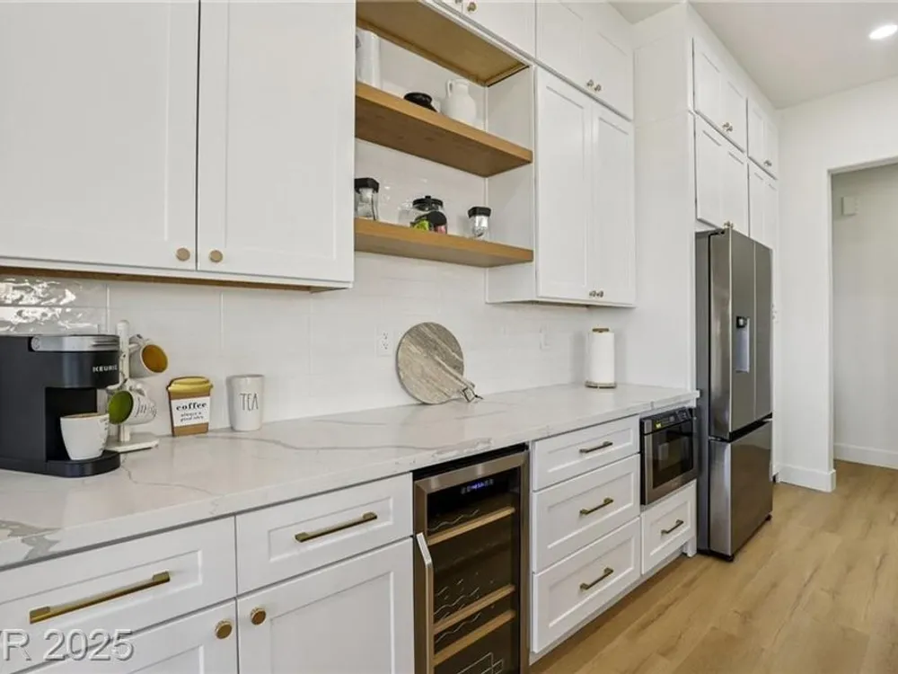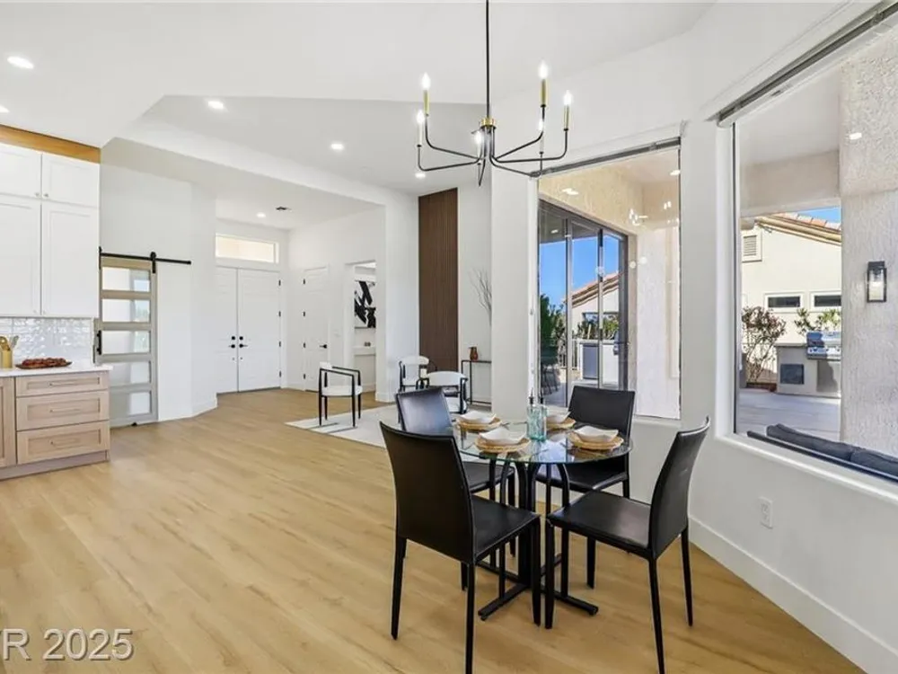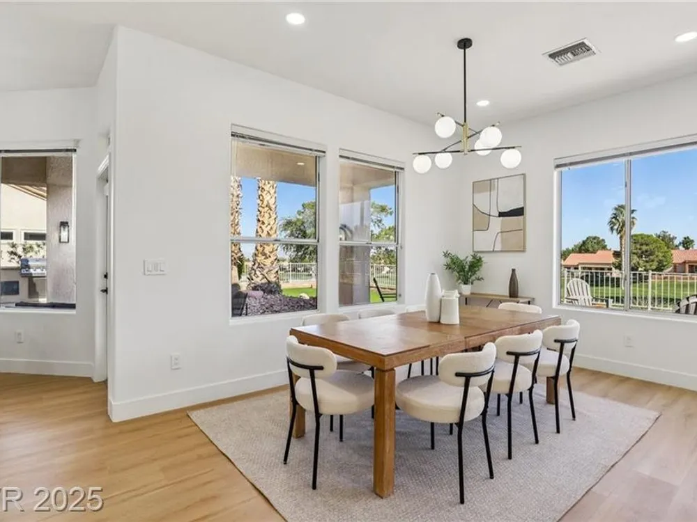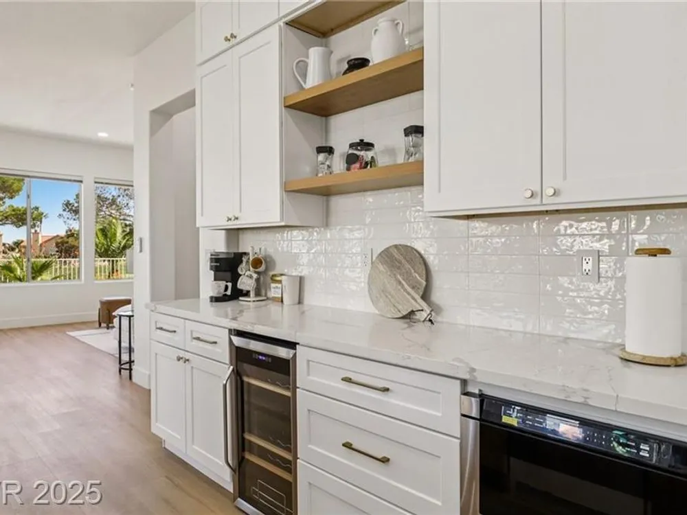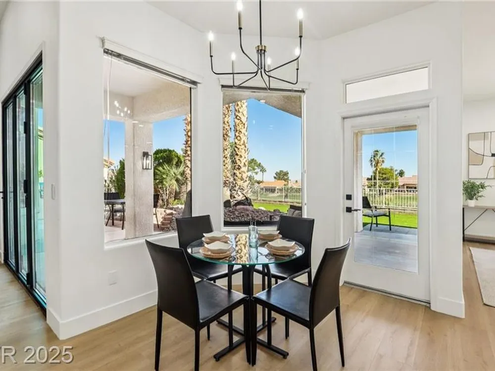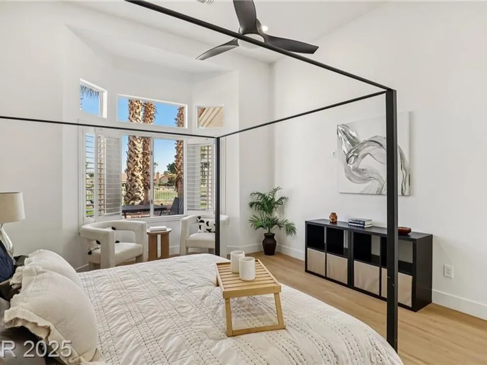 Re-designed 3 BR Regal model updated w/ modern luxury finishes & breathtaking golf course views! Step into an open & airy living space w/ high ceilings, new wide-plank flooring & accordion doors for indoor/outdoor living. An additional family room offers a sleek fireplace framed by floating shelves. Expansive windows fill the home w/ natural light while showcasing serene fairway views. The chef’s kitchen boasts high-end appliances, wine fridge, custom hood, pot-filler, quartz counters w/ waterfall island & 2-tier cabinetry. The primary suite features a spa-inspired bath w/ dual vanities, soaking tub, walk-in shower & built-in closet. Enjoy a fenced backyard w/ new turf, BBQ grill, firepit & room to entertain, all while overlooking Palm Valley Golf Course. Expanded garage w/golfcart space, EV charging outlet & water softener. Sun City Summerlin offers world-class amenities including golf, pools, clubhouses, & more. A truly one-of-a-kind property blending elegance, function, & lifestyle.
