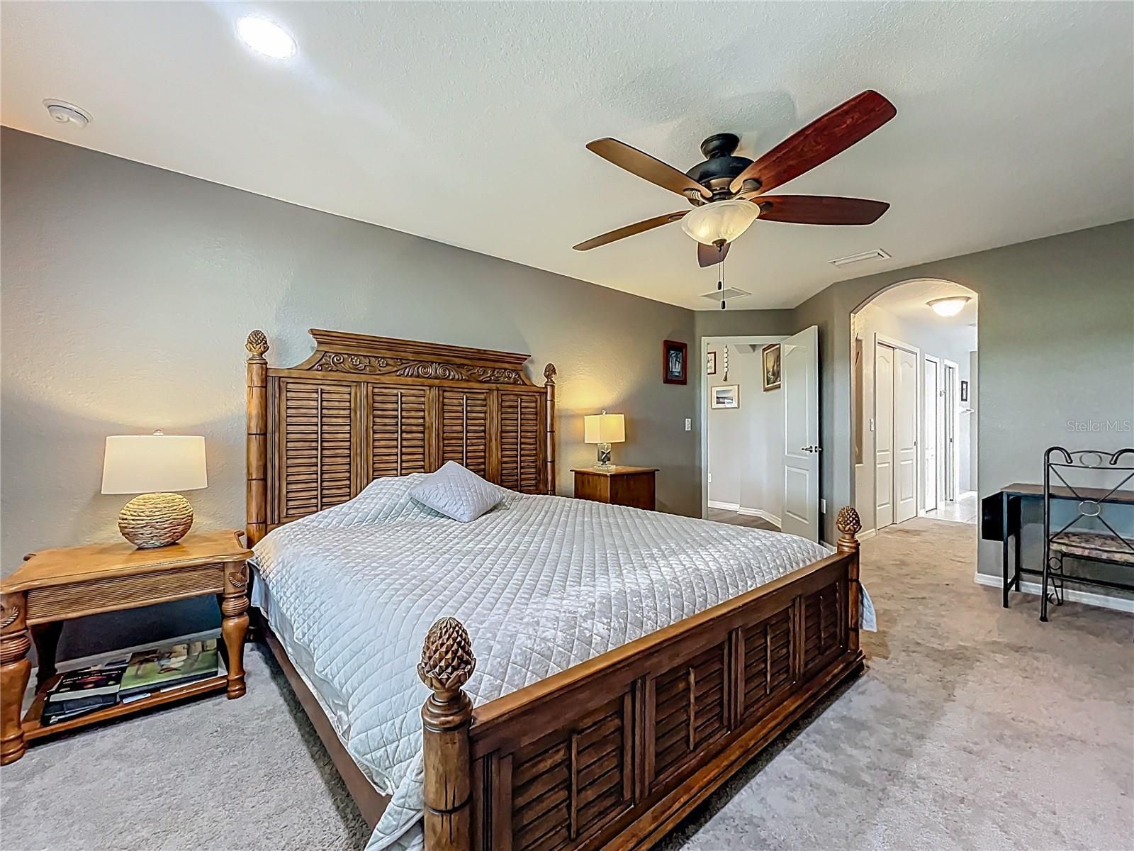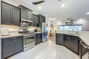 - Ceiling Fan(s), Eat-in Kitchen, Open Floorplan, Main Level Primary, Solid-Wood Cabinets, Split Bedrooms, Stone Counters, Thermostat, Walk-In Closet(s)
