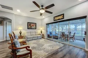 Welcome to this stunning 3-bedroom, 2-bath residence nestled in a vibrant active 55+ community of Arlington Ridge. Boasting a spacious, open concept, split floor plan and breathtaking golf course views overlooking the Green of Hole #1 at Arlington Ridge Golf Course. As you step inside, luxury vinyl flooring flows throughout the living areas and the guest bedroom adjacent to the kitchen, combining style and durability. The kitchen is a chef’s dream, featuring stainless steel appliances including a gas range, elegant quartz countertops, and rich hardwood cabinets with crown molding. Enjoy your morning coffee in the cozy breakfast nook and take advantage of the large pantry for ample storage. The primary suite is thoughtfully positioned away from the other bedrooms for enhanced privacy and includes two generous walk-in closets. The primary bathroom offers a spa-like retreat with a large walk-in shower and dual vanity sinks topped with quartz countertops. Step through the sliding doors into the expansive all-seasons Florida room, filled with natural light thanks to multiple windows, making it the perfect spot to relax year-round. The outdoor space is designed for entertaining, with plenty of seating for friends and family to gather and enjoy the spectacular golf views. Additionally, there’s a dedicated grilling area outside—ideal for barbecues and outdoor dining while soaking in the serene surroundings. This home is the perfect blend of comfort, style, and scenic beauty. The Arlington Ridge community offers excellent dining choices, a championship 18 hole Golf Course, Resort style beach and lap pools and spa, Fitness Center, Pickleball Tennis and Bocce ball courts, Movie Theater, Crafts and Card rooms, Billiards, a library stocked with books as well as DVDs, Walking and Golf cart paths, a 24 hour Gated Guard entry, and so much more! Schedule your viewing of this amazing home today and let your retirement dreams begin!