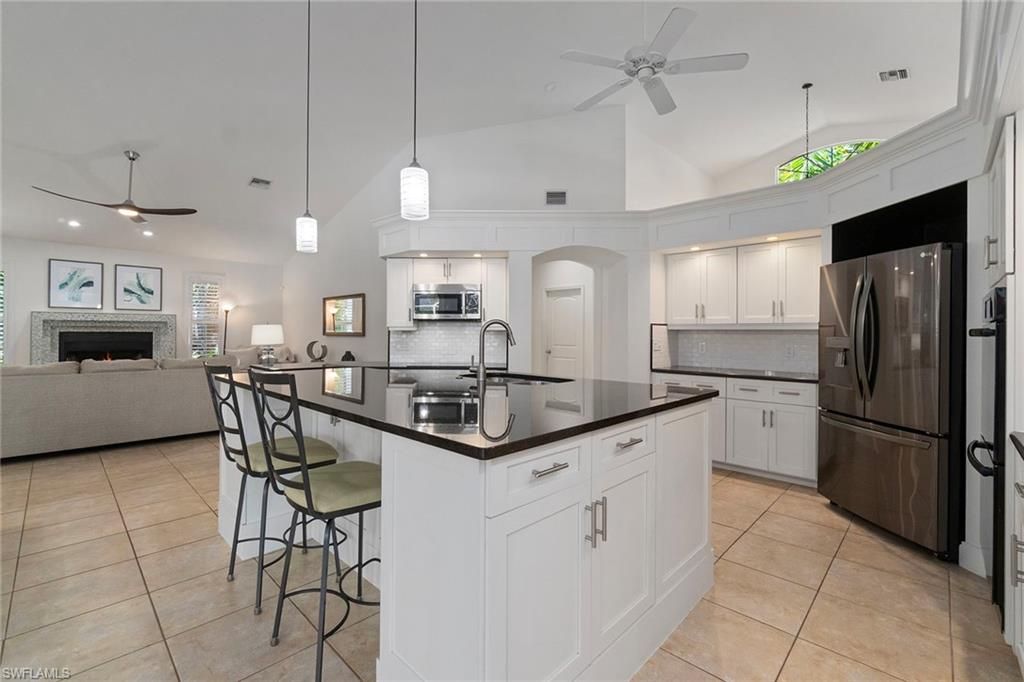 Set on an impressive 0.61-acre lot, this expansive and thoughtfully designed residence offers exceptional flexibility with generous indoor and outdoor living spaces.Inside, two separate living areas, a formal dining room, and a private den with closet provide versatility for everyday living or entertaining. Plantation shutters, crown molding throughout, and French front doors add a refined touch, while large sliding glass doors in the primary suite, main living areas, kitchen, and secondary suite bring in natural light and open to the lanai.The kitchen features black granite countertops, an electric cooktop, dual wall ovens, updated refrigerator and microwave, a large island with sink, soft-close cabinetry, and a walk-in pantry. It opens to an eat-in area and main living space with a real wood-burning fireplace and large windows. A built-in bar area with sink and soft-close cabinetry enhances the layout.The primary suite is privately situated in its own enclosed wing with sliding doors to the patio, a walk-in closet with built-ins, and a spacious bathroom with dual granite sinks, soaking tub, walk-in tile shower with dual shower heads, and an enclosed water closet.A secondary suite offers its own bathroom with quartz countertops, walk-in shower with frosted glass door, linen storage, and a spacious layout with seating area, large sliding doors to the lanai, and pool views.Additional features include vinyl plank flooring in guest bedrooms, built-in closet systems, a laundry room with washer and dryer, quartz countertops, utility sink, and storage, plus a 3-car garage with built-ins, automatic doors, epoxy flooring, and a refrigerator.Major updates include the roof, AC units, water heater, and pool pump. The lanai includes three remote-controlled storm screens.Residents of Bonita Bay enjoy access to a private Gulf-front beach park, miles of recreational and biking trails, a full-service marina, optional golf memberships, and a vibrant community centered around wellness, dining, and social connection.