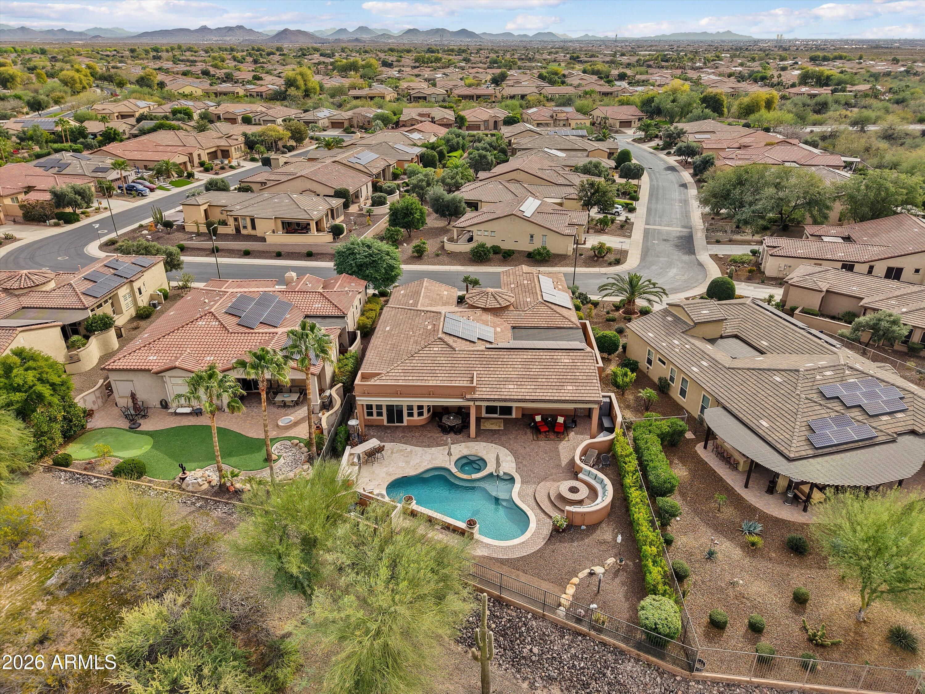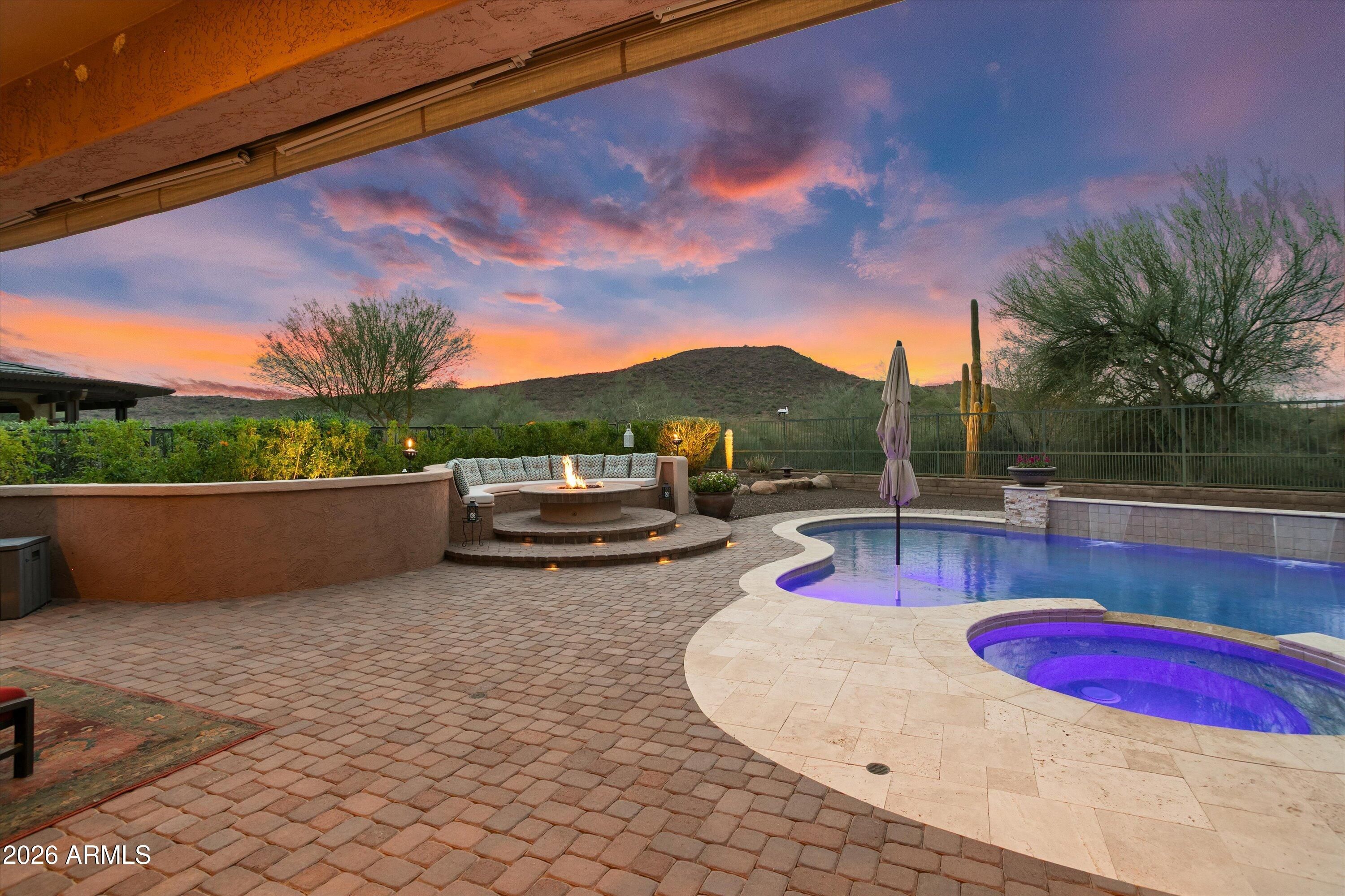 Stunning 'Stellare' on quarter-acre WASH lot! The RESORT-LIKE BACKYARD OASIS HAD A SENSATIONAL $180,000 REMAKE in 2024 when the HEATED POOL WITH SPILLOVER SPA & water sheers, OUTDOOR KITCHEN with bar seating, & extensive TRAVERTINE PAVERS were added. More backyard features include a built-in elevated GAS FIREPIT with circular seating, decorative privacy walls on both sides of yard, huge covered patio, wrought iron view fence, & custom landscaping w/lighting, all overlooking magnificent mountain & dramatic sunset views! This backyard retreat has it all! The OPEN CONCEPT floorplan features majestic 12' ceilings. The ELEGANT GOURMET KITCHEN with premium granite slab countertops & large center island, Built-In GE Monogram Stainless Appliances, features 5-burner Induction cooktop-2025, double ovens-2023, plus spacious morning room with VIEWS! EXPANSIVE GREAT ROOM features built-in GAS fireplace with mantel, media center, dining area (pool table), & WET BAR with staggered cabinets and granite slab countertop. All overlook the resort backyard for indoor/outdoor entertaining. With three bedrooms, each with ensuite bath, and a half bath - plenty of space for houseguests. PRIMARY SUITE with sliding glass door to side courtyard has a luxurious bath and a huge walk-in closet with custom built-in cabinetry. IMMACULATE CURB APPEAL with stacked stone front, stunning lush landscape with lighting, hardscape, faux grass! THREE-CAR GARAGE with built-in cabinets, epoxy floors and pedestrian door. OTHER IMPORTANT FEATURES INCLUDE: LEASED SOLAR SYSTEM-9.36kW WITH AVERAGE ELECTRIC BILL OF $87/MONTH. Two HVAC units-2020, PVC drip system-2024. Located in award-winning gated, 55+ Trilogy at Vistancia with 5-star-resort style amenities at the 35,000 SF Kiva Club with heated indoor & outdoor pools, fitness center, day spa, cafe, billiards, meeting rooms, library, tennis courts, pickle ball, bocce ball, events & a plethora of activities to choose from. Outstanding Gary Panks-designed golf course is woven throughout the neighborhood. The Mita Club has additional community amenities. Easy access from Trilogy to the 303, shopping, restaurants, entertainment, Lake Pleasant & Paloma Park.