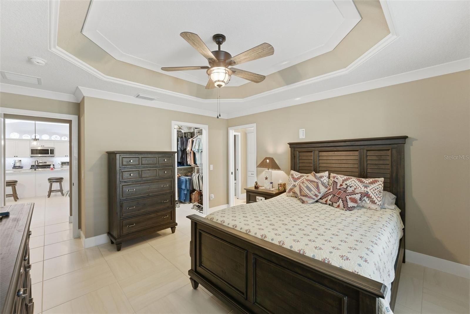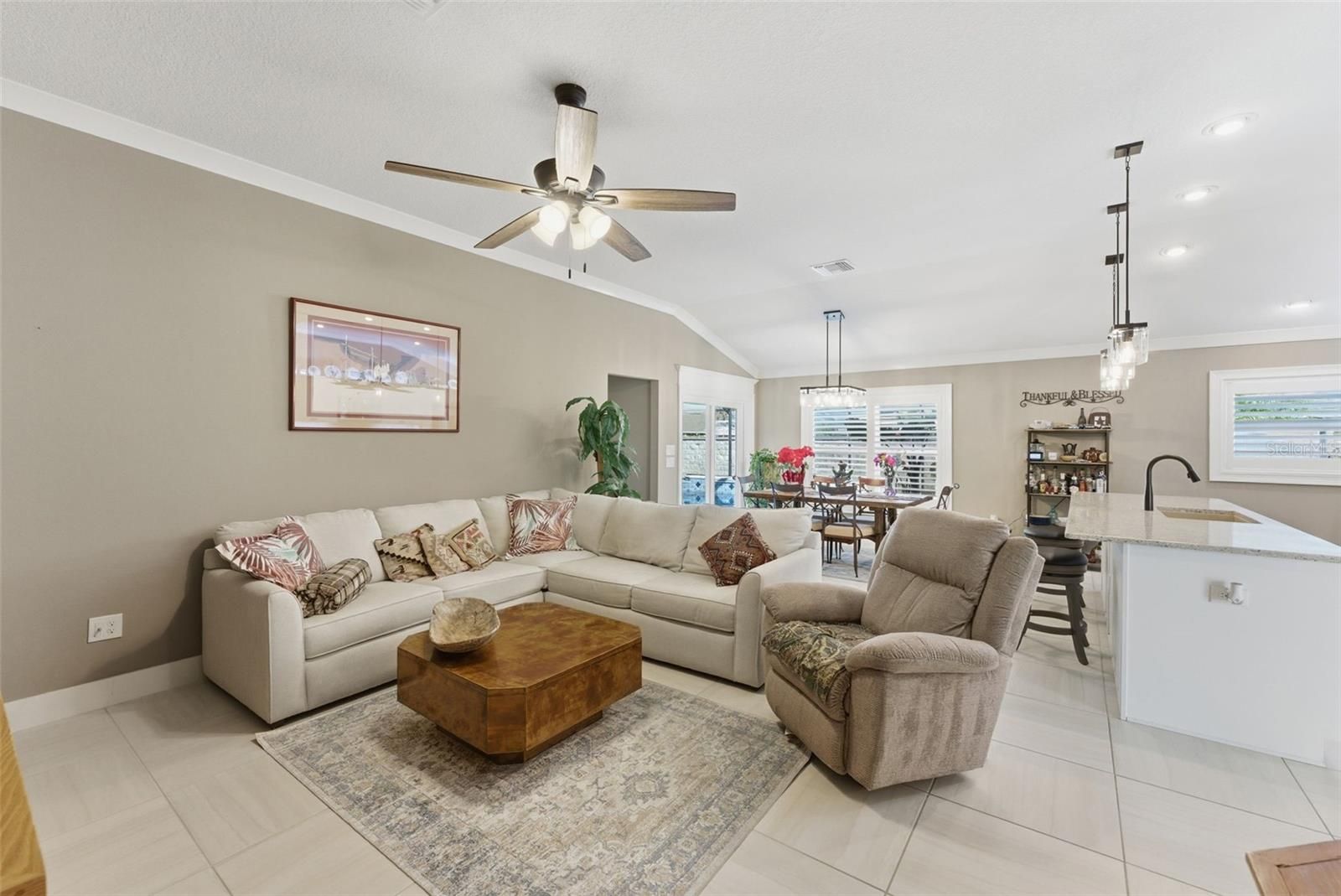 - Cathedral Ceiling(s), Ceiling Fan(s), Crown Molding, Eat-in Kitchen, High Ceilings, Kitchen/Family Room Combo, Living/Dining Room, Open Floorplan, Main Level Primary, Stone Counters, Tray Ceiling(s), Vaulted Ceiling(s), Walk-In Closet(s), Window Treatments