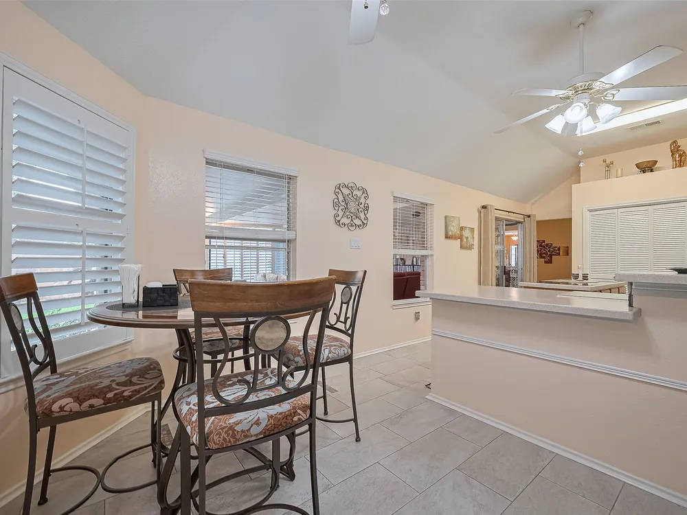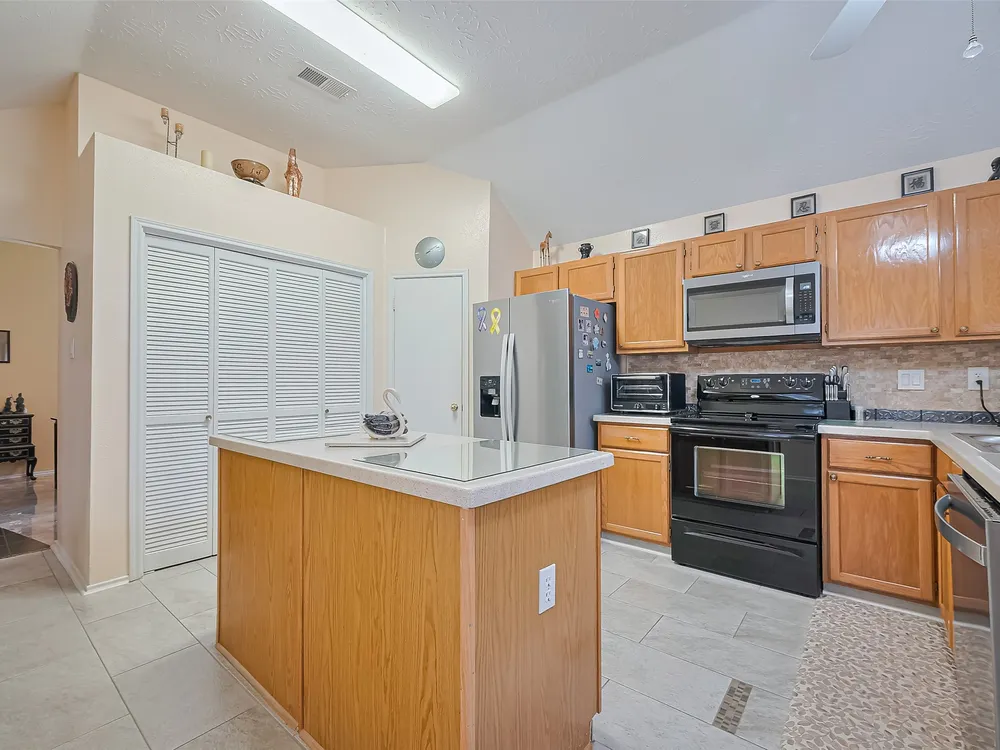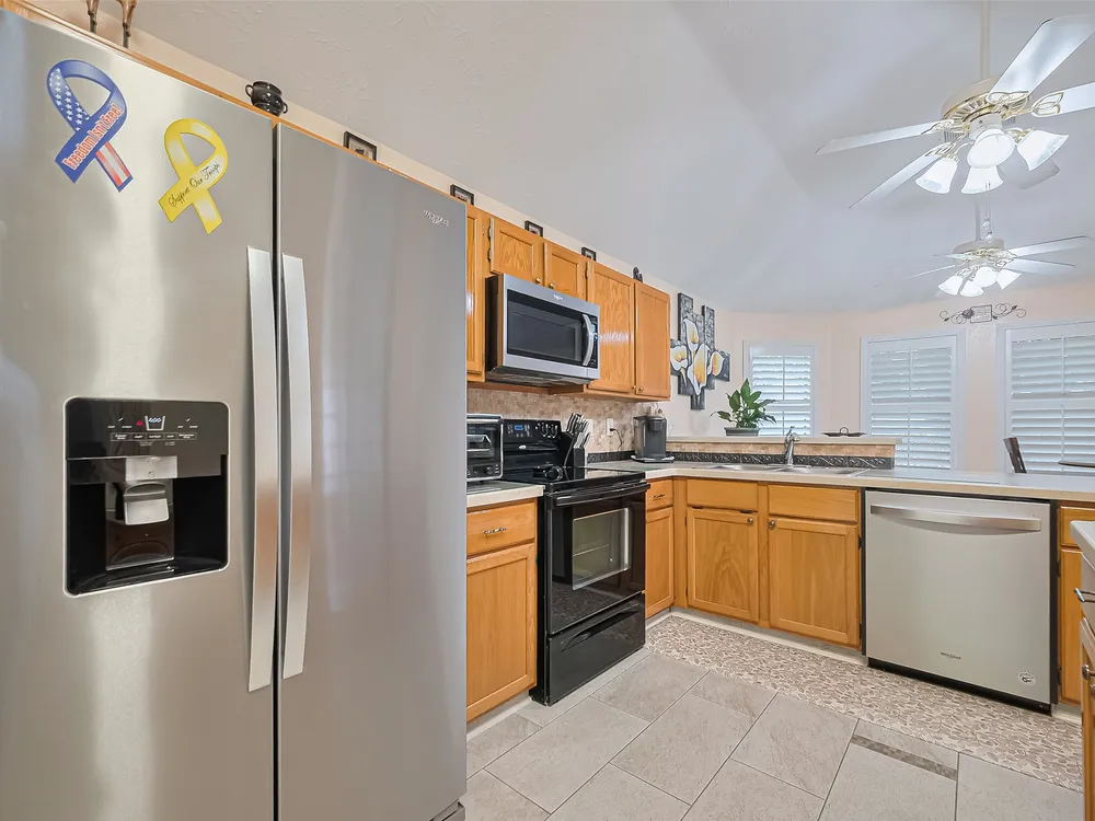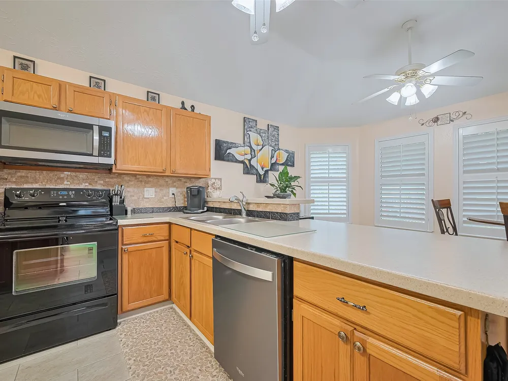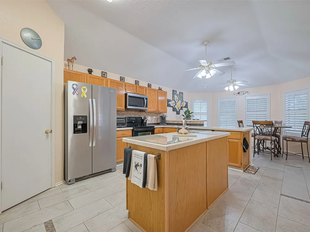 - Kitchen Island, Window Treatments, Ceiling Fan(s)