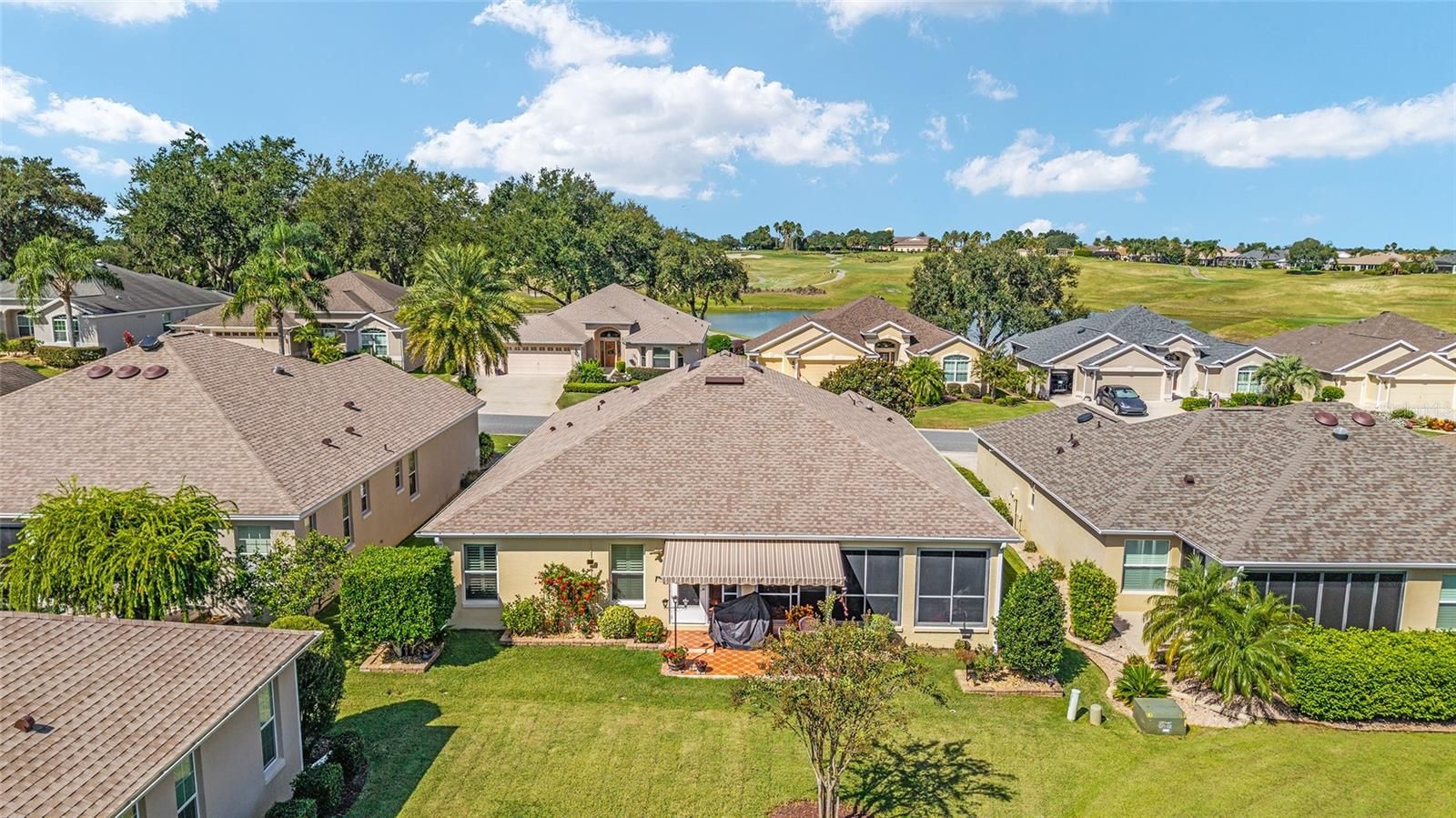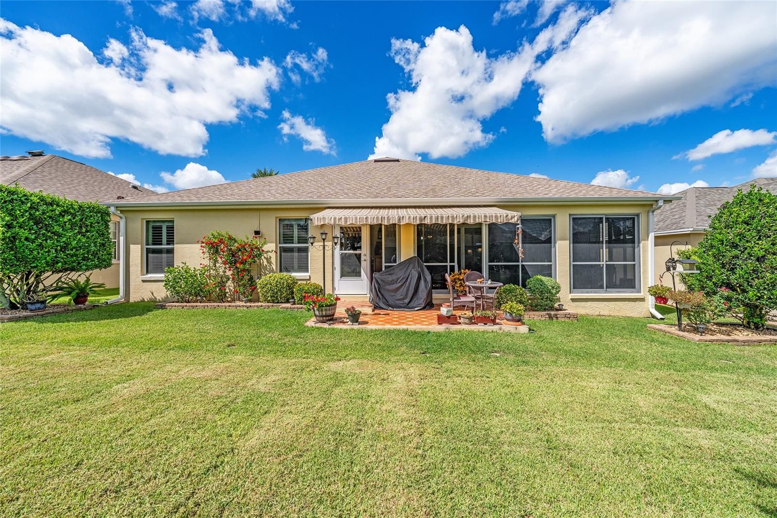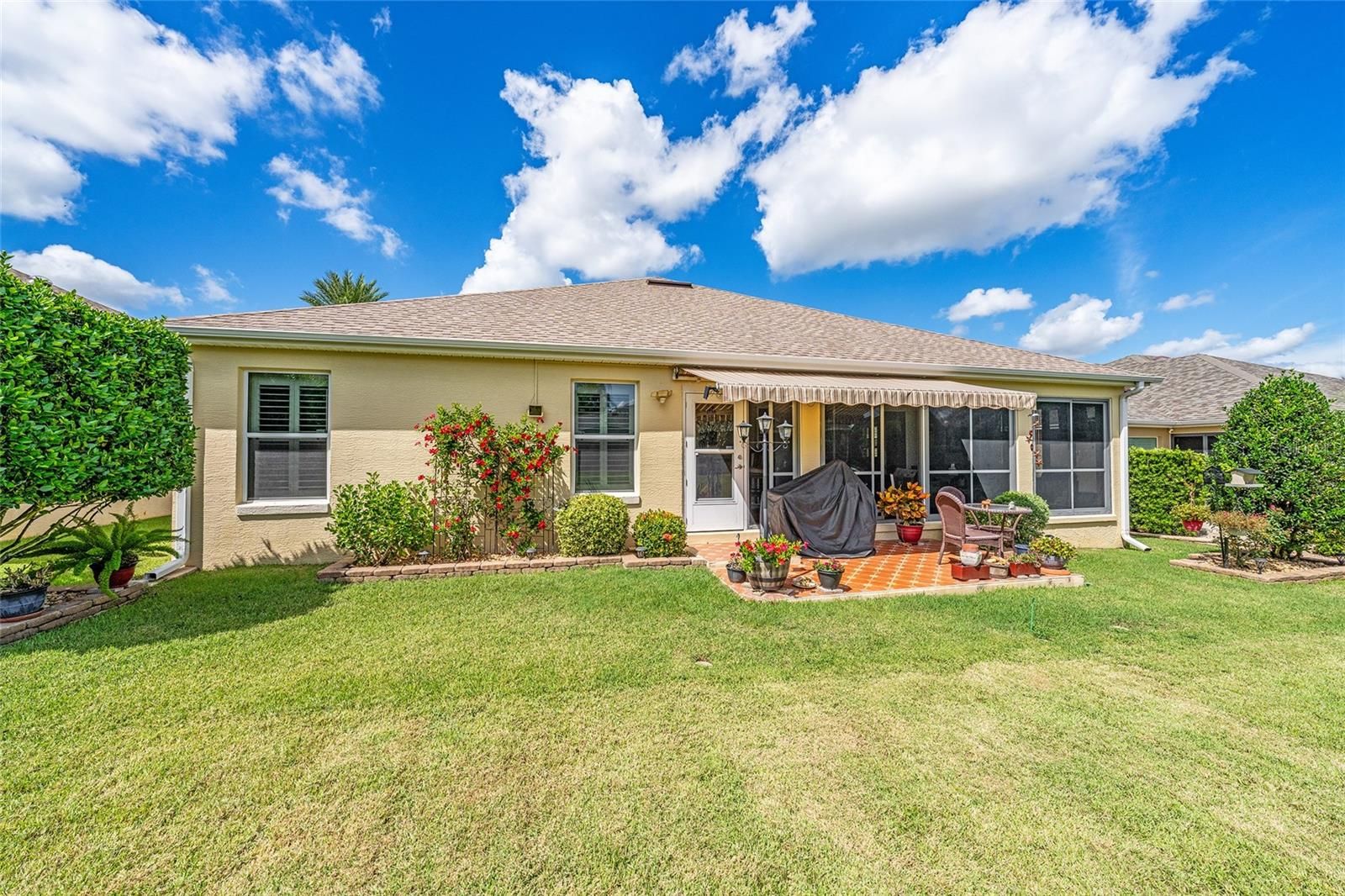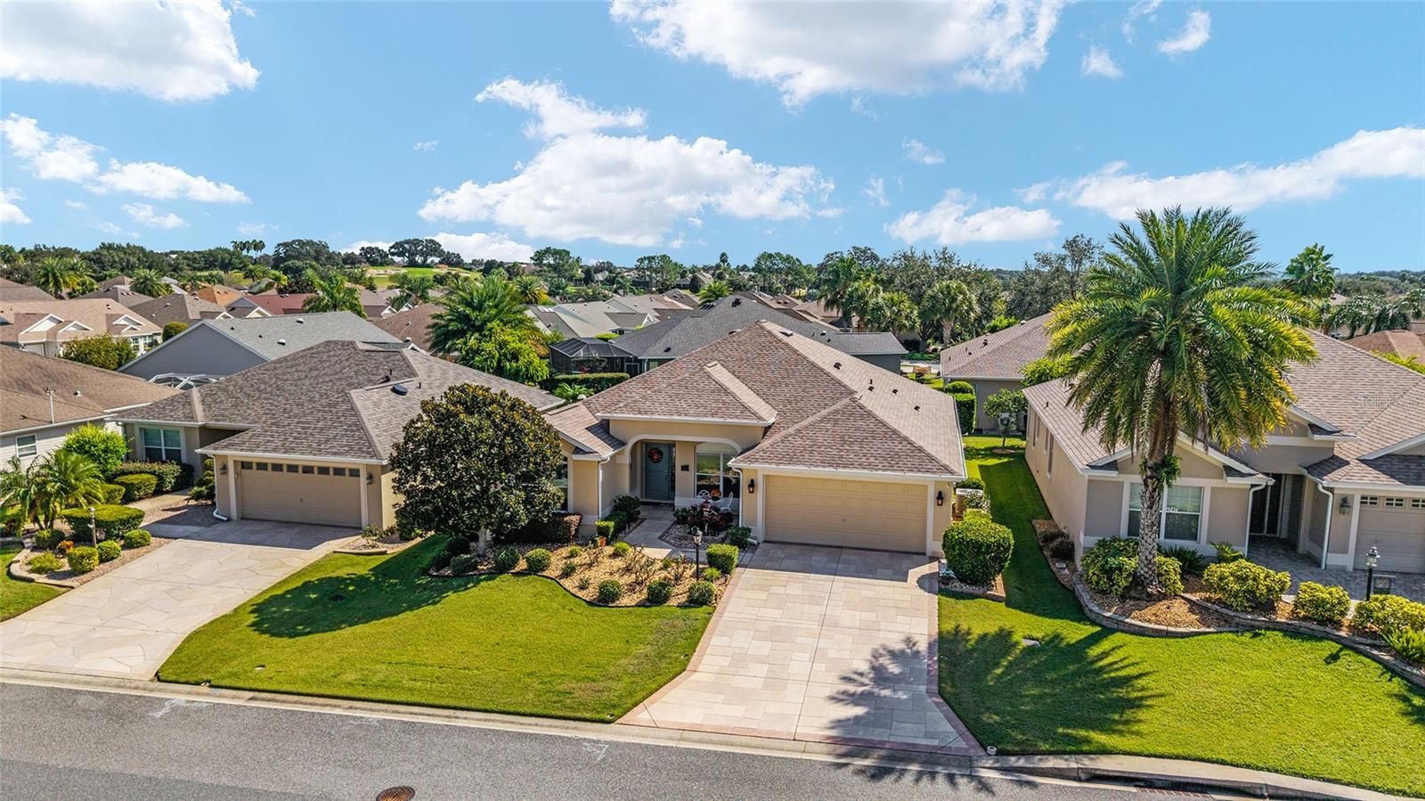 A Designer Sanctuary in The Villages with an Offset Homesite! Welcome to this exquisite Gardenia Model home in the sought-after Village of Hemingway, ideally located just minutes from Lake Sumter Landing’s nightly entertainment, premier shopping, many wonderful dining options, golf courses, recreation centers, and several golf cart accessible pools. Thoughtfully designed and beautifully updated, this 3-bedroom, 2-bath residence embodies both elegance and comfort. The home showcases a timeless block stucco exterior complemented by a newly painted finish, new roof, gutters surrounding the home, and a custom-designed, sealed driveway and walkway. Inside, the split-plan layout provides both privacy and flow, featuring hardwood floors in the great room and primary suite, crown molding in every bedroom, and plantation shutters throughout. A gourmet-inspired kitchen is highlighted by upgraded granite countertops, an expanded island with additional storage, deep farmhouse sink, tile backsplash, under-cabinet lighting, and new stainless-steel appliances including a refrigerator, dishwasher, and microwave. Both bathrooms are equally refined with granite countertops, blending style with functionality. The adjoining dining and living spaces open to an enclosed patio with sliding windows and tile floors, offering year-round enjoyment. Step outside to a serene tiled patio with retractable awning—perfect for relaxing afternoons. One of this property’s most coveted features is its premium offset lot—providing enhanced privacy, no “kissing lanais,” and a tranquil backdrop of beautiful landscaping, creating a true sanctuary both inside and out. Additional enhancements elevate the home’s functionality and style: a designer closet system, laundry room with sink and cabinets, solar tube in the guest bath, tinted windows in key rooms, luxury vinyl flooring in the study and guest bedroom, garage cabinets with workbench, pull-down attic ladder, and a coated garage floor. For peace of mind, the property also features an ADT security system. Blending modern upgrades with refined finishes, this residence is more than a home—it is a private retreat designed for luxurious living in the heart of The Villages.
