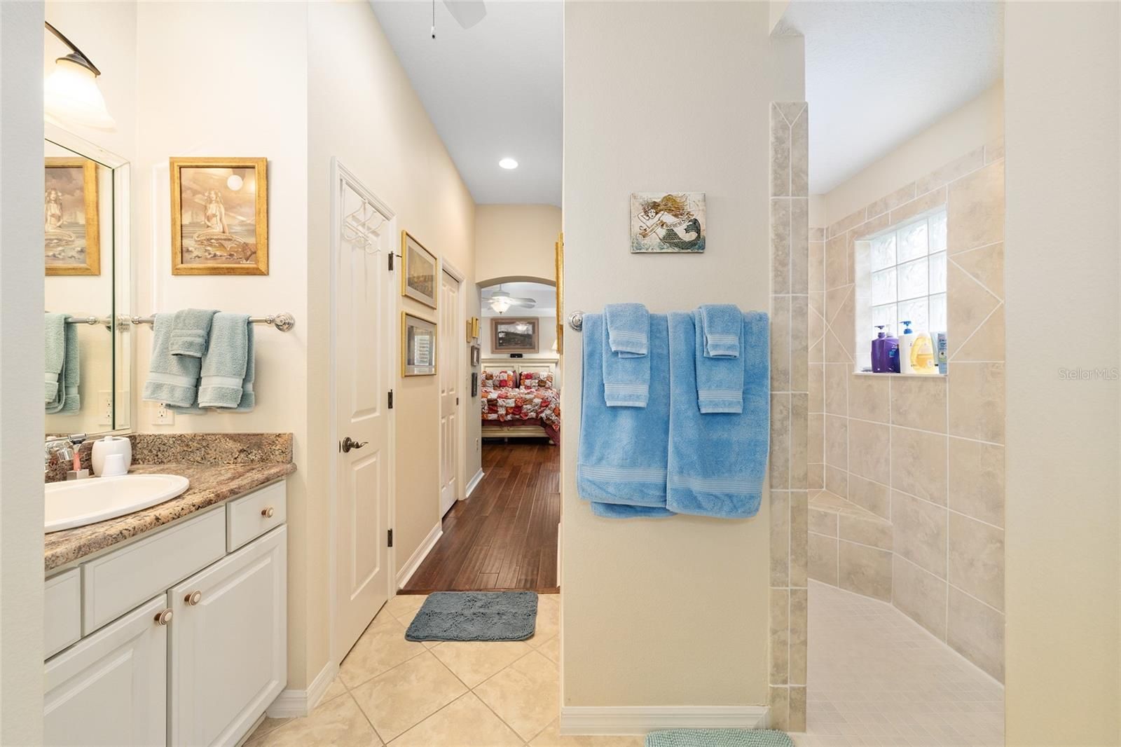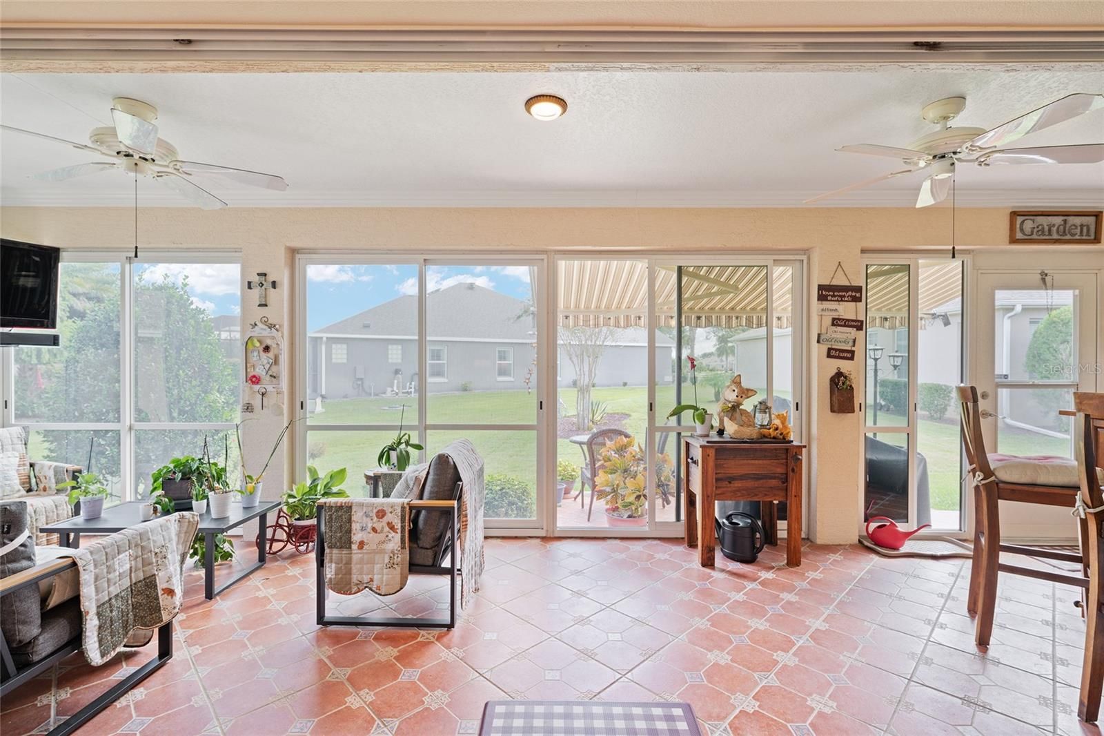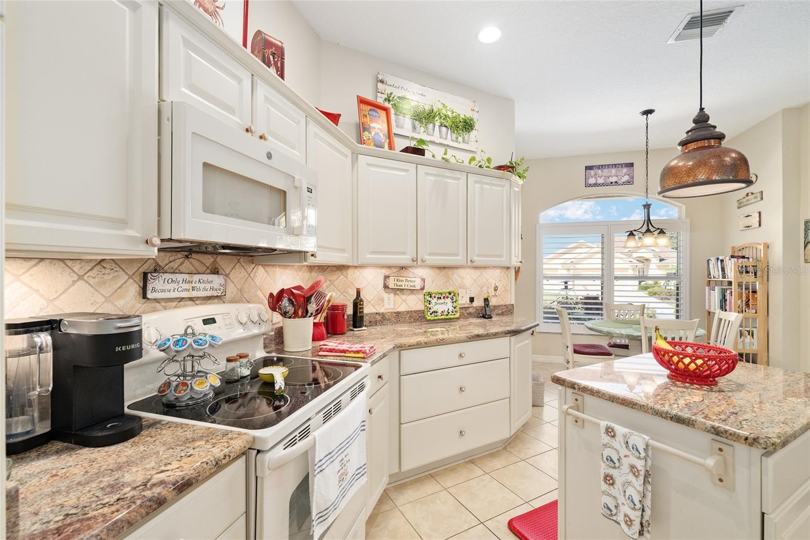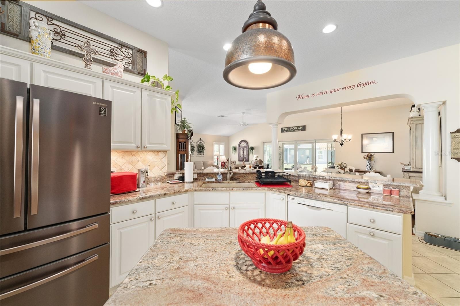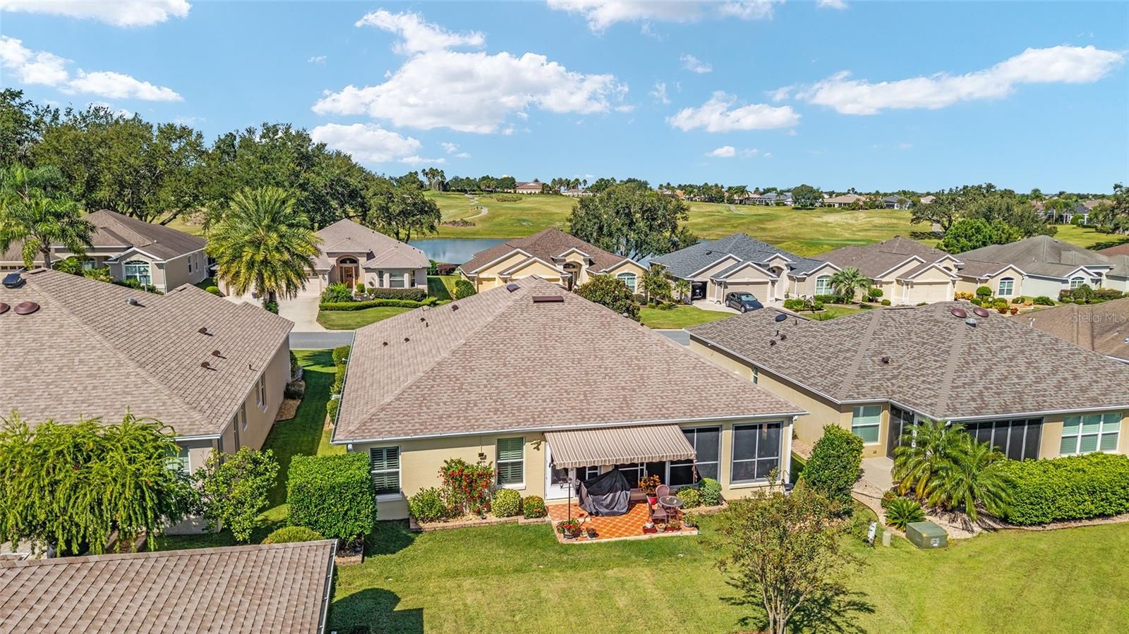 A Designer Sanctuary in The Villages with an Offset Homesite! Welcome to this exquisite Gardenia Model home in the sought-after Village of Hemingway, ideally located just minutes from Lake Sumter Landing’s nightly entertainment, premier shopping, many wonderful dining options, golf courses, recreation centers, and several golf cart accessible pools. Thoughtfully designed and beautifully updated, this 3-bedroom, 2-bath residence embodies both elegance and comfort. The home showcases a timeless block stucco exterior complemented by a newly painted finish, new roof, gutters surrounding the home, and a custom-designed, sealed driveway and walkway. Inside, the split-plan layout provides both privacy and flow, featuring hardwood floors in the great room and primary suite, crown molding in every bedroom, and plantation shutters throughout. A gourmet-inspired kitchen is highlighted by upgraded granite countertops, an expanded island with additional storage, deep farmhouse sink, tile backsplash, under-cabinet lighting, and new stainless-steel appliances including a refrigerator, dishwasher, and microwave. Both bathrooms are equally refined with granite countertops, blending style with functionality. The adjoining dining and living spaces open to an enclosed patio with sliding windows and tile floors, offering year-round enjoyment. Step outside to a serene tiled patio with retractable awning—perfect for relaxing afternoons. One of this property’s most coveted features is its premium offset lot—providing enhanced privacy, no “kissing lanais,” and a tranquil backdrop of beautiful landscaping, creating a true sanctuary both inside and out. Additional enhancements elevate the home’s functionality and style: a designer closet system, laundry room with sink and cabinets, solar tube in the guest bath, tinted windows in key rooms, luxury vinyl flooring in the study and guest bedroom, garage cabinets with workbench, pull-down attic ladder, and a coated garage floor. For peace of mind, the property also features an ADT security system. Blending modern upgrades with refined finishes, this residence is more than a home—it is a private retreat designed for luxurious living in the heart of The Villages.
