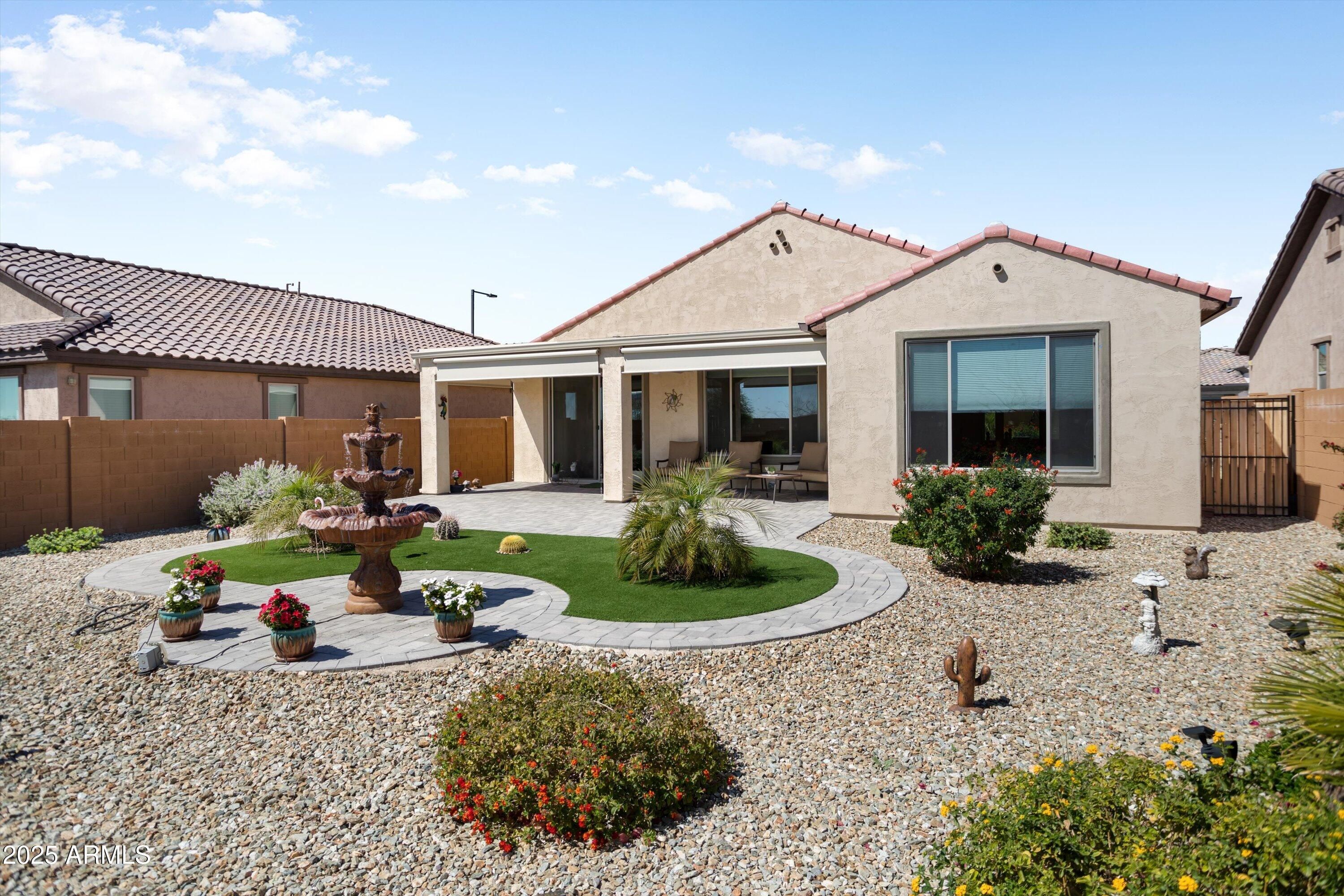 AMAZING HIDEAWAY MODEL ON A HUGE WALLED LOT WITH MOUNTAIN VIEWS. Enter this well designed, open concept floor plan w/upgraded flooring, contemporary lighting & window treatments. The expansive living area seamlessly blends into the spacious dining area and the heart of the home which features upgraded appliances, sleek granite counters, custom backsplash, & large island w/seating. The owners retreat offers a spa like bath w/ dual sinks, vanity and large walk-in closet. The versatile guest bedroom & bath offer comfort and privacy for visitors. The air conditioned extended garage is complete with additional cabinets, work bench & water filtration system. Enjoy outdoor living on your extended patio w/remote sun shade, overlooking this large manicured landscape w/ beautifull water feature.