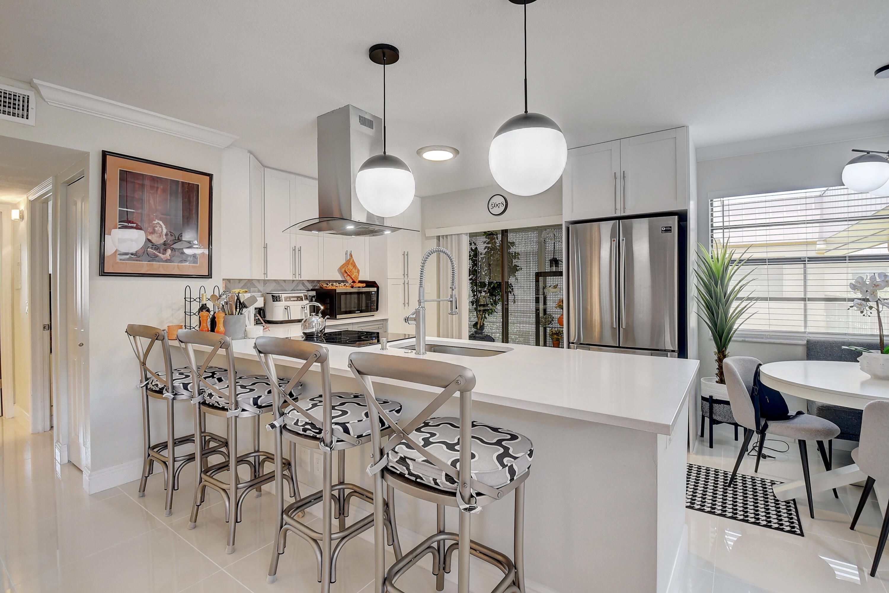 Situated on the picturesque Isle of Capri in east Kings Point. A comprehensive renovation has transformed this condo into a modern oasis. The updates include stainless steel appliances, a front-loading washer and dryer, an island hood, and quartz countertops on custom wood cabinets that effortlessly close. The addition of base and crown molding adds an elegant touch, while the porcelain tile floors and showers provide a luxurious feel. The bathroom features a stylish barn door frameless shower made of high-quality glass. The kitchen is adorned with a beautiful marble backsplash, creating a visually striking focal point. The air conditioning system was replaced in 2017, ensuring optimal comfort. For added convenience and security, rolldown shutters.