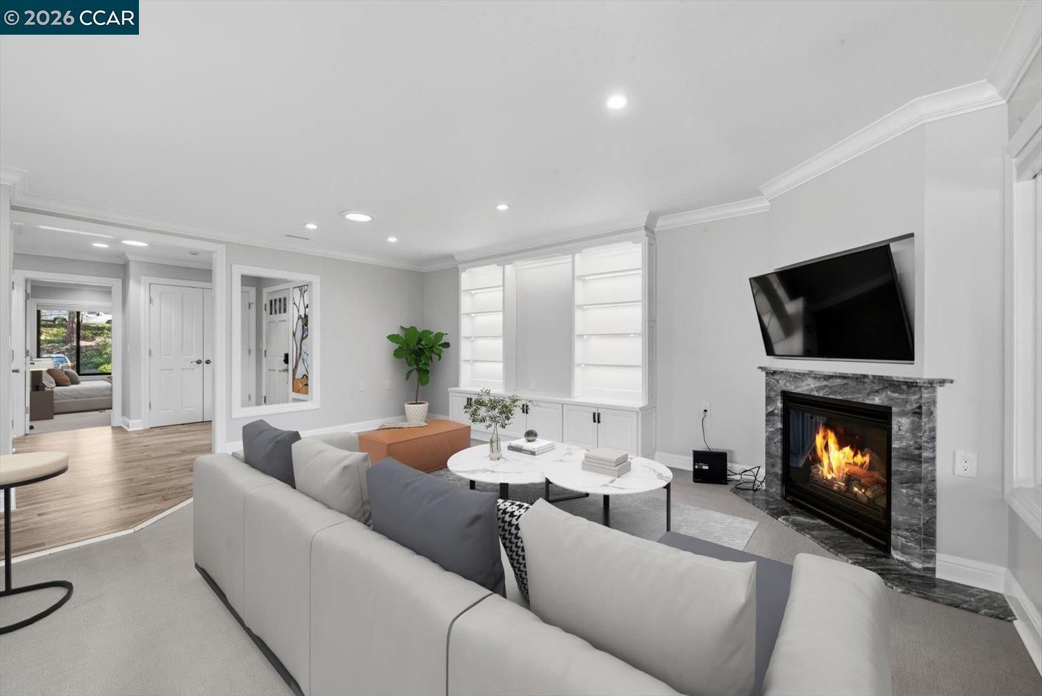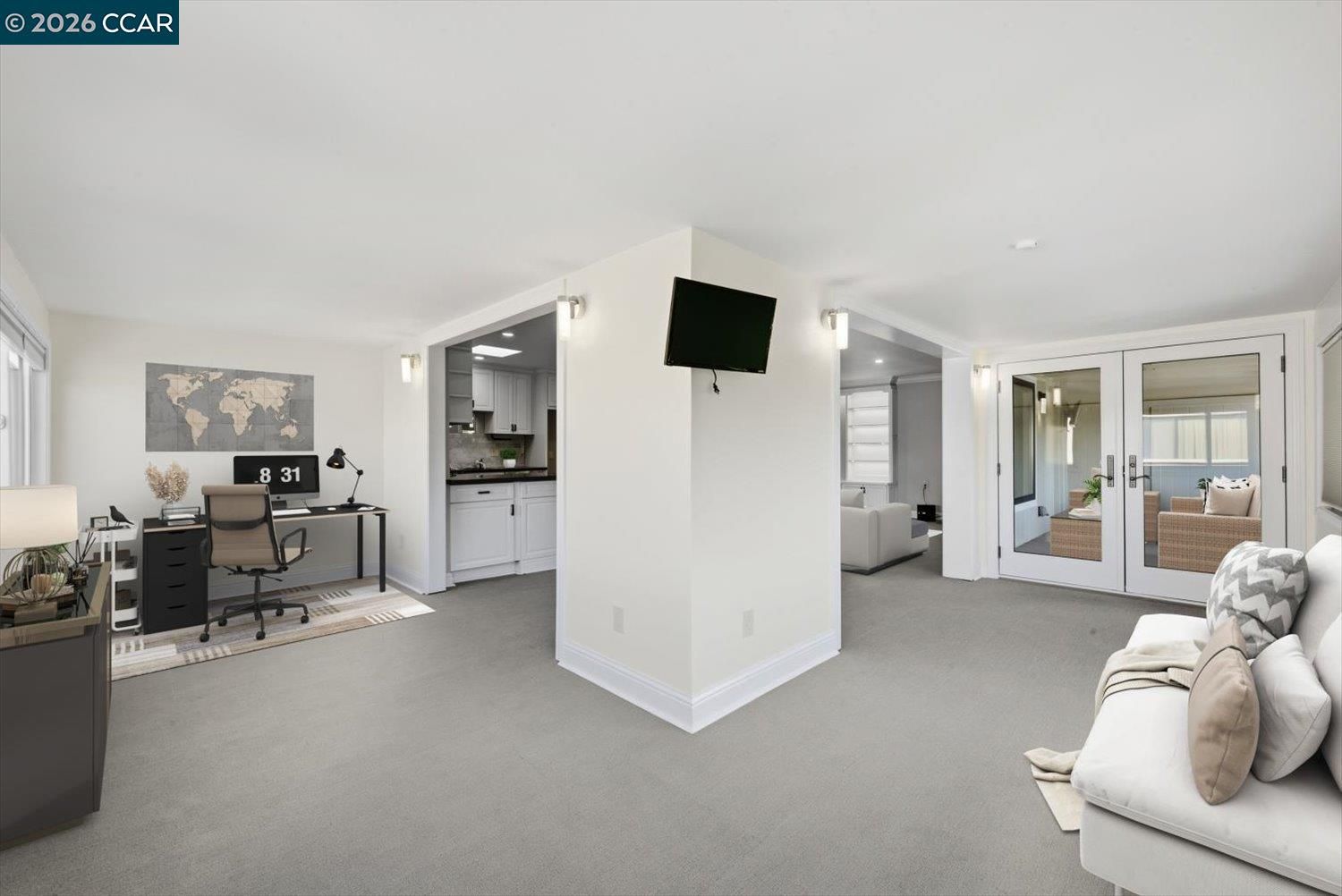 Welcome to 2741 Golden Rain Rd #7, a spacious upper-level Sequoia Wrap 2BD/2BA co-op offering approx. 1,466 sq ft in the sought-after 55+ Rossmoor community. The open living and dining area is filled with natural light and features a fireplace and built-in entertainment center. A covered balcony spans the home, providing a peaceful outlook and space for outdoor seating or dining. The updated kitchen includes modern appliances, ample cabinetry, and a large breakfast bar/island. A versatile bonus room offers flexibility for an office, reading, or exercise space. The primary suite features an expansive closet and ensuite bath with dual vanities, bidet, and walk-in shower with seating. The second bedroom includes a Murphy bed for added flexibility. Nearby is a bath with large vanity and walk-in shower. Additional features include dual-pane windows, skylights, generous storage, and a private parking space and cabinet ideal for golf clubs or seasonal items. There’s also a community gathering space nearby. Rossmoor offers golf, fitness, pools, tennis, trails, clubs, and more. Buyer must qualify. Monthly HOA dues. Minutes to downtown Walnut Creek, shopping, dining, and freeway access.