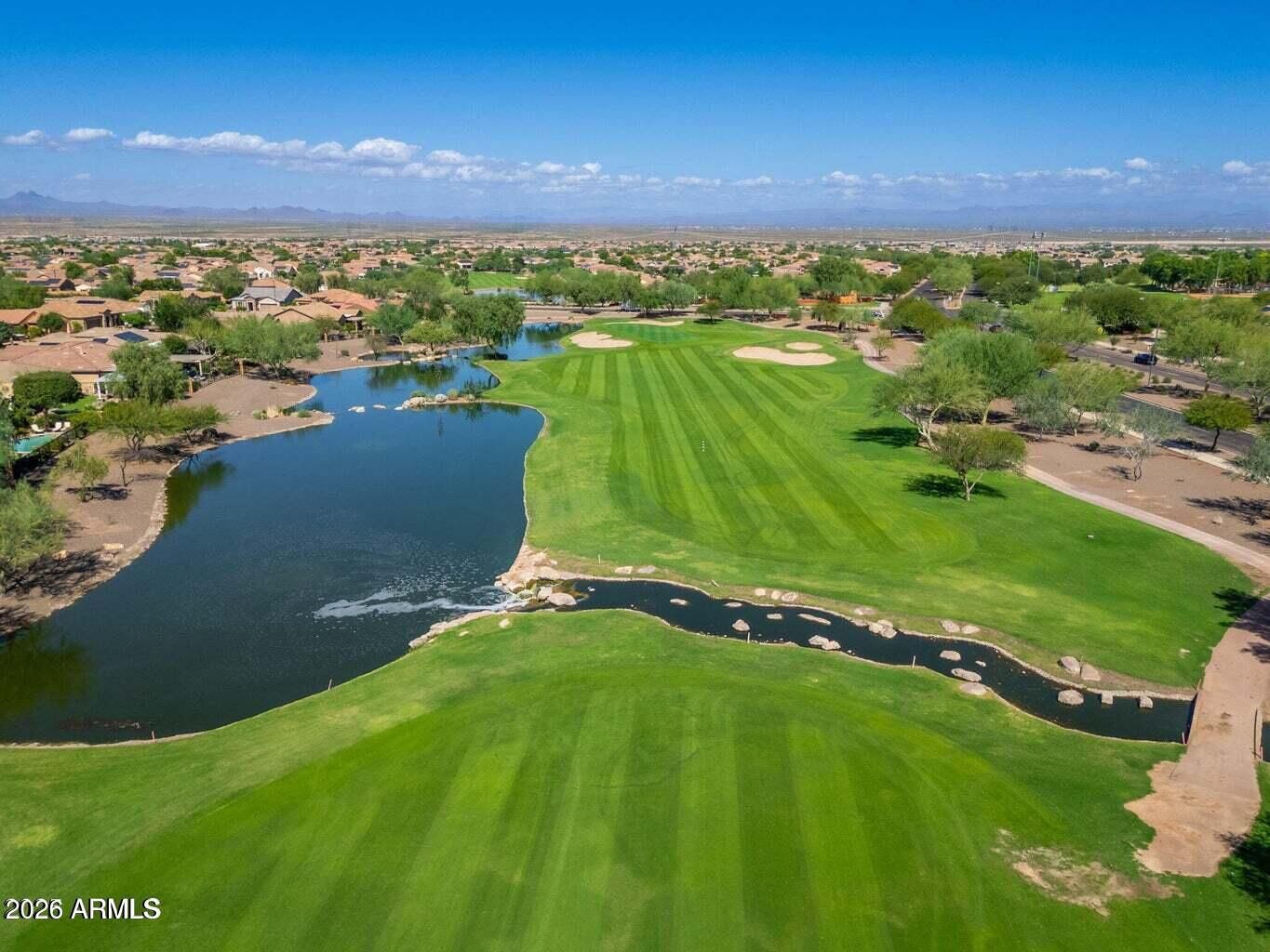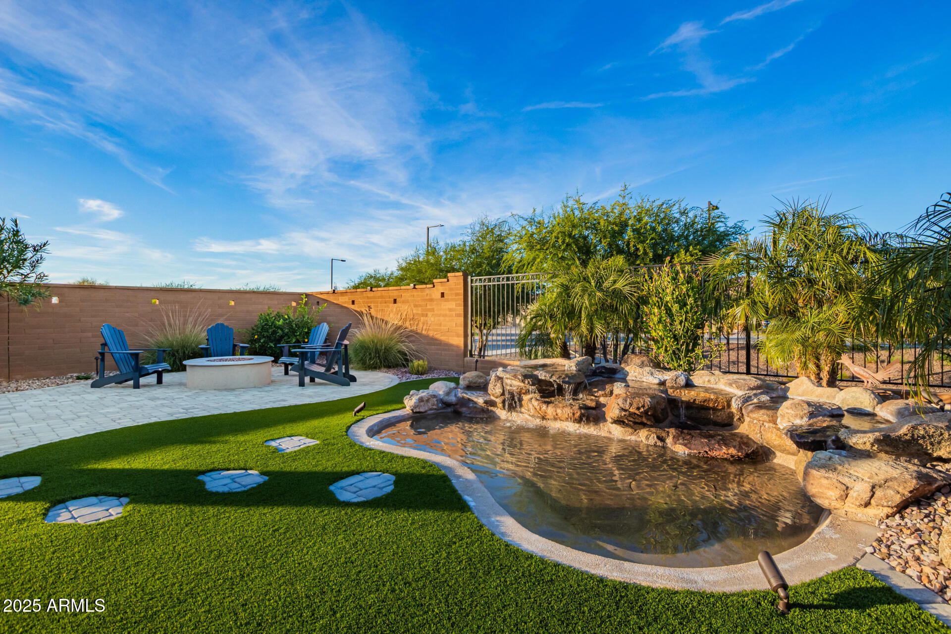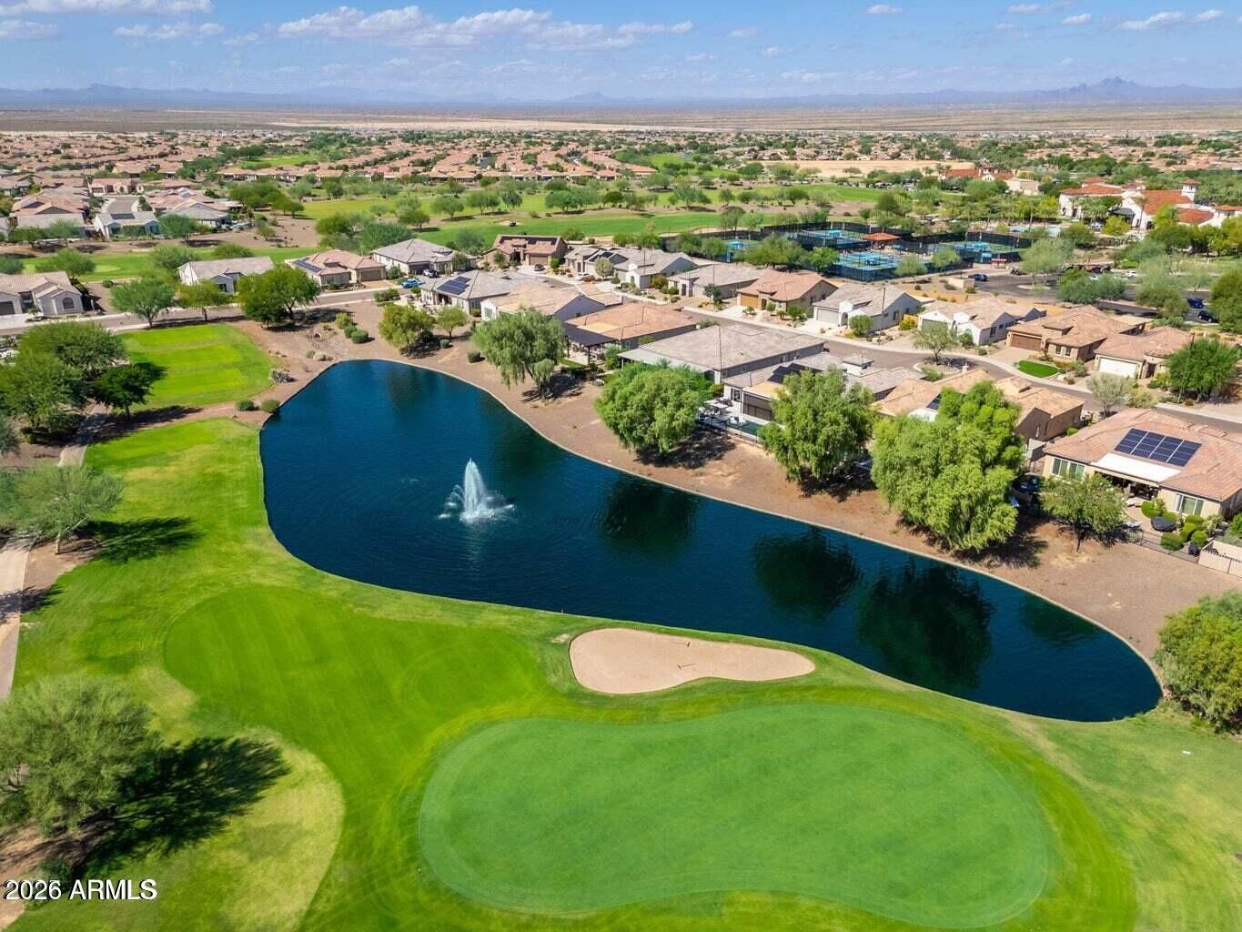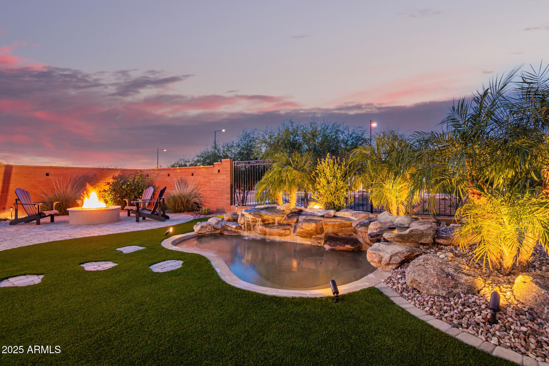Experience luxury living and unforgettable Arizona evenings in this impeccably upgraded 2,014-sq-ft Preserve Model, set on a rare 8,276-sq-ft corner lot and featuring over $220,000 in builder and owner upgrades. The open, split-bedroom floor plan flows seamlessly to a covered patio designed for sunset living, complete with a glowing waterfall pond, fire pit with four Adirondack chairs, and open-view fencing backing to a natural wash surrounded by mature green trees offering exceptional privacy with no rear neighbors. Inside, enjoy an elegant foyer, a chef's kitchen with premium finishes, and a serene owner's suite with a spa-inspired bath and custom walk-in closet. A versatile third room with frosted glass French doors, plus a 2 car+ golf cart garage with dedicated golf-cart space, completes this exceptional home in a sought-after resort-style 55+ community.