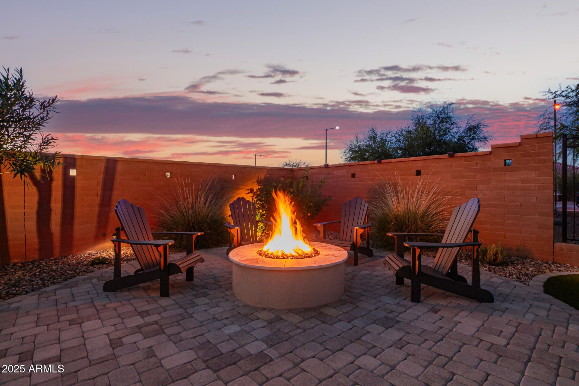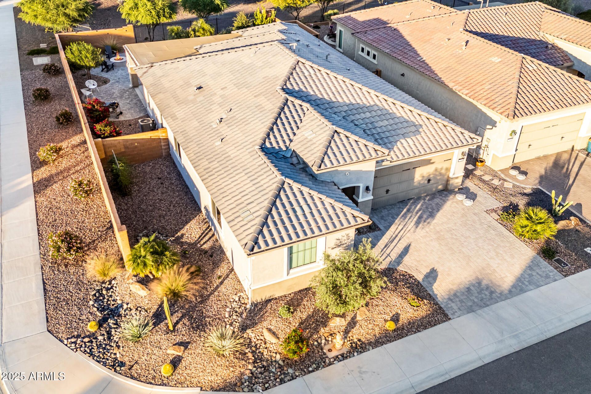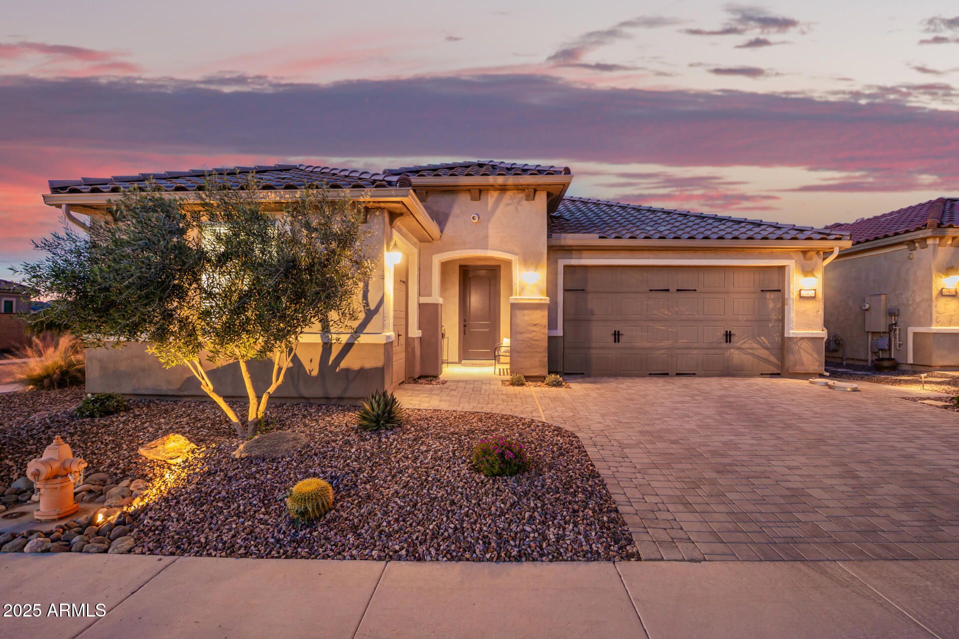 Experience luxury living and unforgettable Arizona evenings in this impeccably upgraded 2,014-sq-ft Preserve Model, set on a rare 8,276-sq-ft corner lot and featuring over $220,000 in builder and owner upgrades. The open, split-bedroom floor plan flows seamlessly to a covered patio designed for sunset living, complete with a glowing waterfall pond, fire pit with four Adirondack chairs, and open-view fencing backing to a natural wash surrounded by mature green trees offering exceptional privacy with no rear neighbors. Inside, enjoy an elegant foyer, a chef's kitchen with premium finishes, and a serene owner's suite with a spa-inspired bath and custom walk-in closet. A versatile third room with frosted glass French doors, plus a 2 car+ golf cart garage with dedicated golf-cart space, completes this exceptional home in a sought-after resort-style 55+ community.