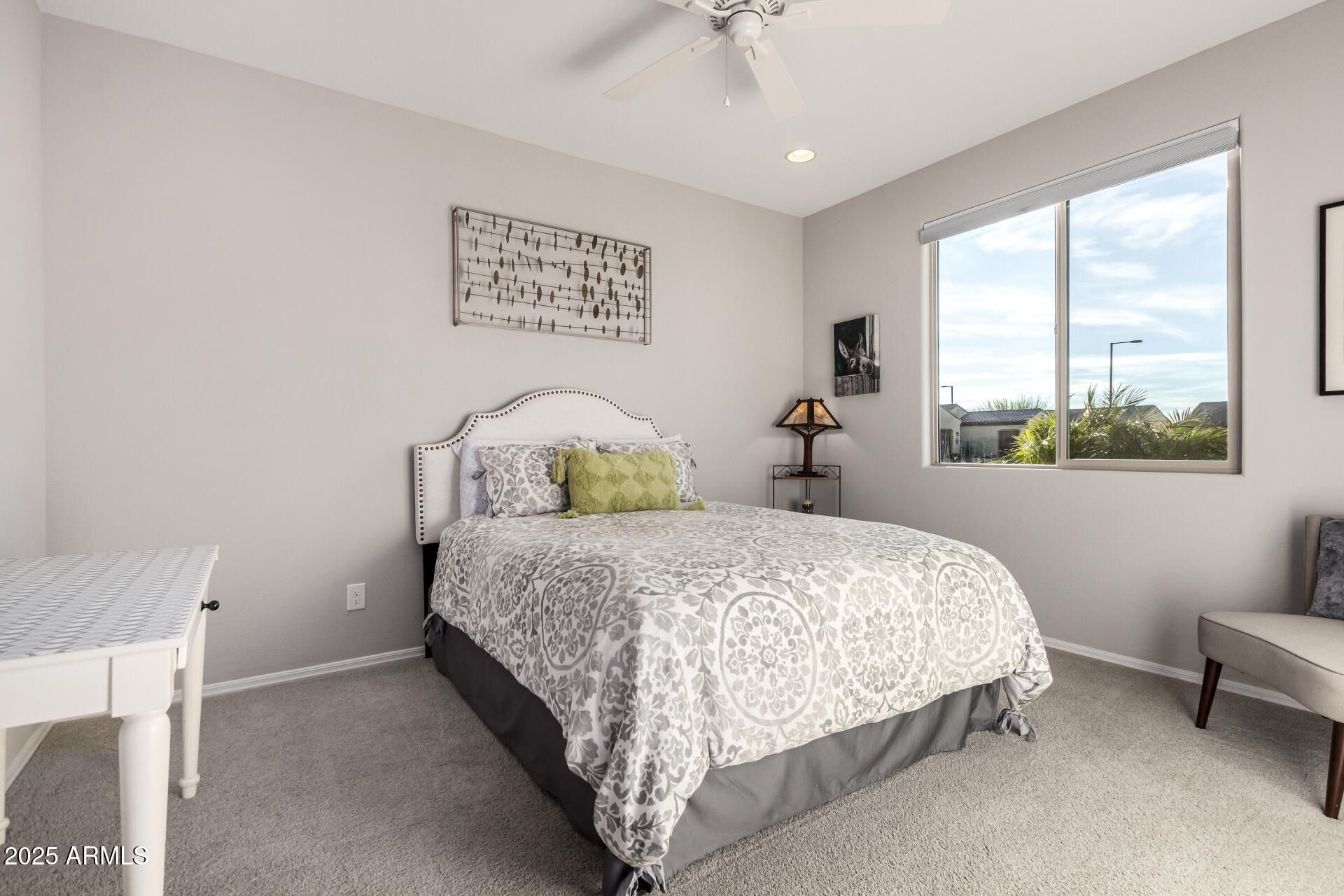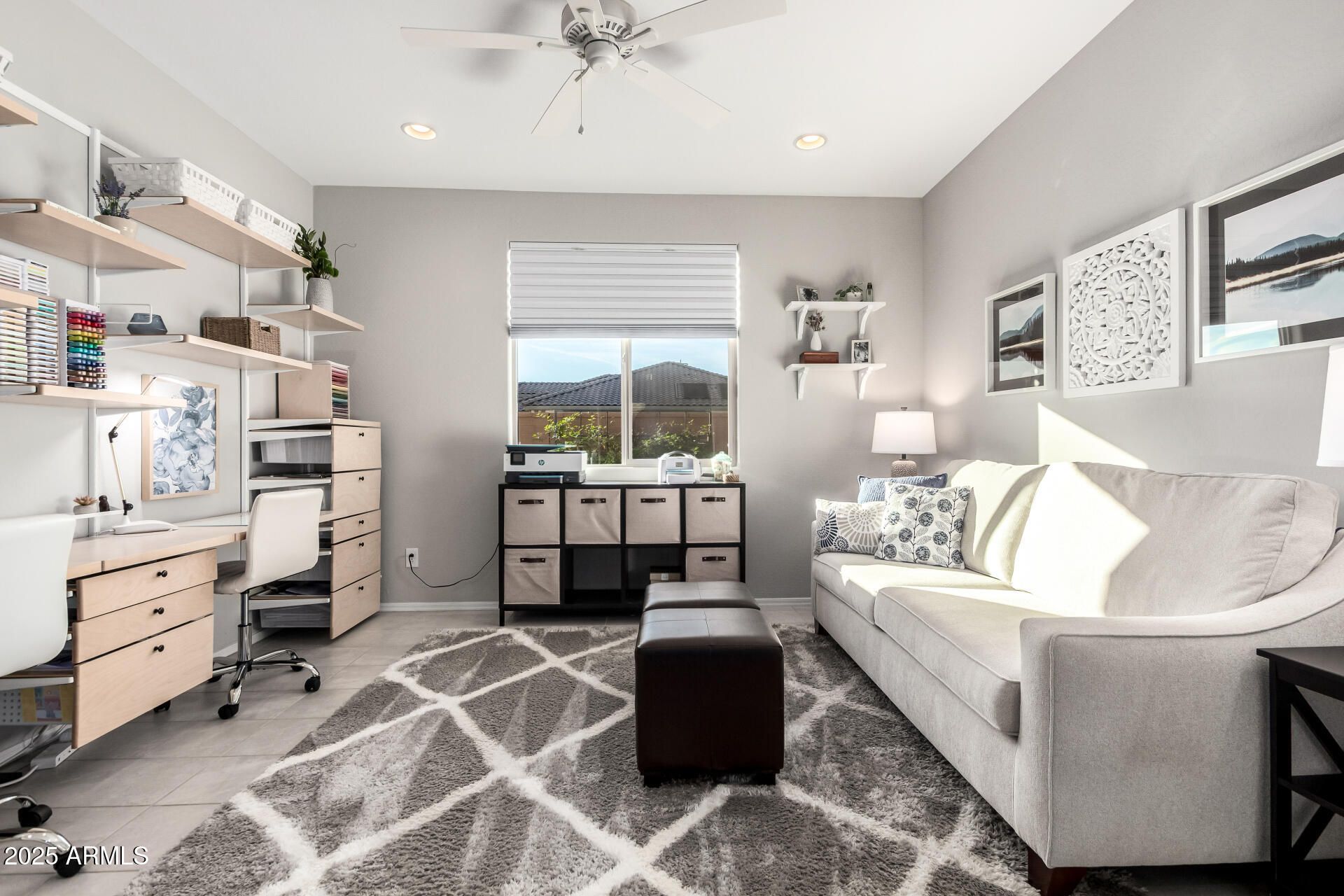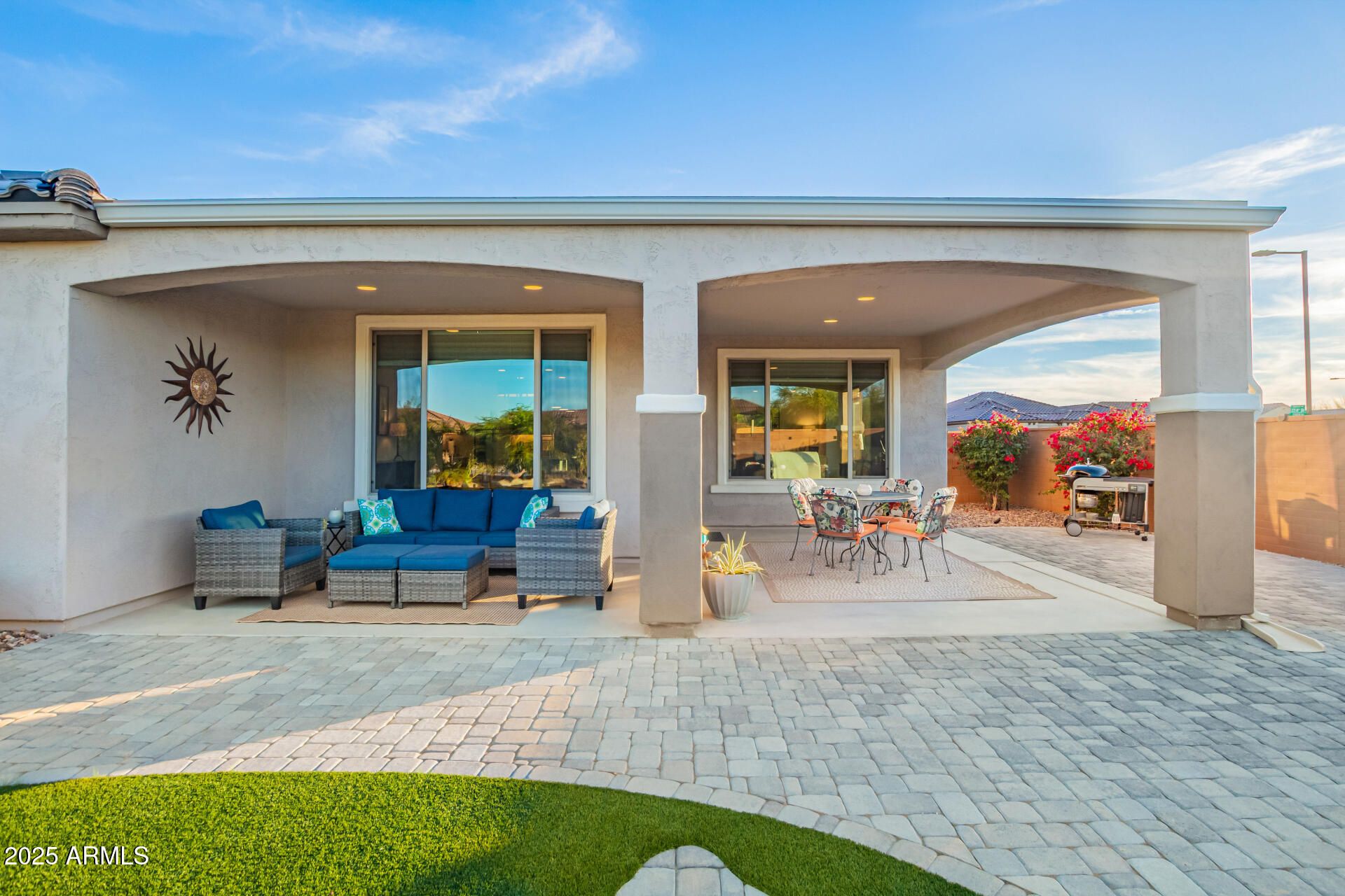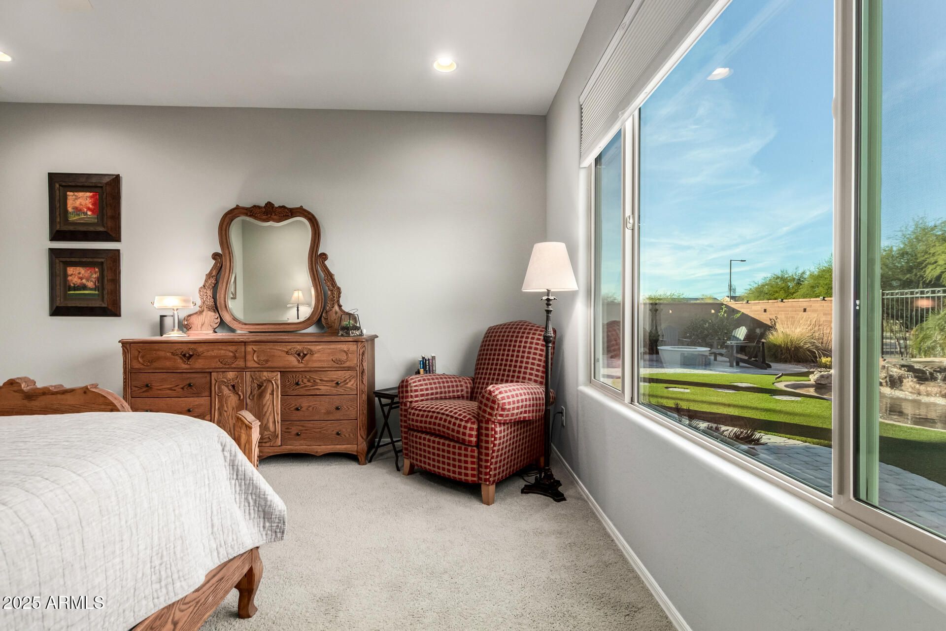 Experience luxury living and unforgettable Arizona evenings in this impeccably upgraded 2,014-sq-ft Preserve Model, set on a rare 8,276-sq-ft corner lot and featuring over $220,000 in builder and owner upgrades. The open, split-bedroom floor plan flows seamlessly to a covered patio designed for sunset living, complete with a glowing waterfall pond, fire pit with four Adirondack chairs, and open-view fencing backing to a natural wash surrounded by mature green trees offering exceptional privacy with no rear neighbors. Inside, enjoy an elegant foyer, a chef's kitchen with premium finishes, and a serene owner's suite with a spa-inspired bath and custom walk-in closet. A versatile third room with frosted glass French doors, plus a 2 car+ golf cart garage with dedicated golf-cart space, completes this exceptional home in a sought-after resort-style 55+ community.