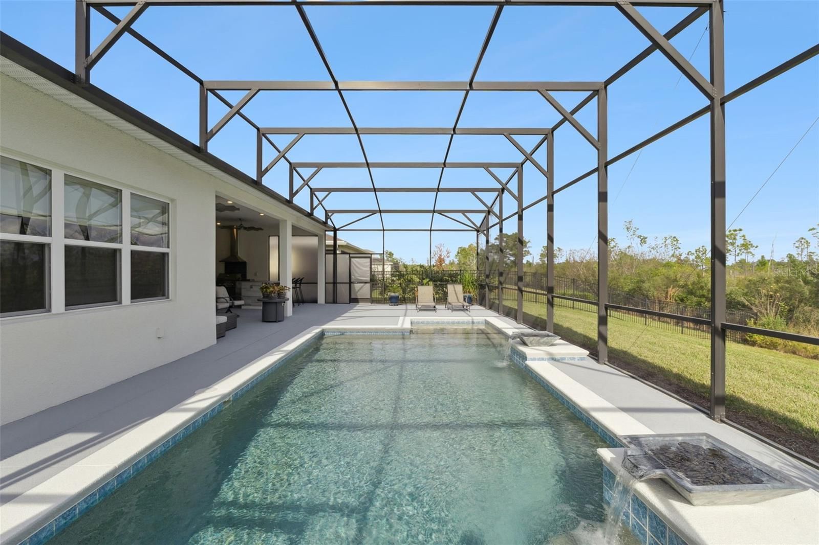 Live the resort lifestyle that you are dreaming of every day in this stunning Del Webb Sunbridge home featuring the RENOWN floor plan - the most sought after floor plan. This beautiful home is perfectly set on an oversized lot with unobstructed conservation views. Step outside to your private pool, outdoor kitchen and expansive lanai and enjoy privacy with nature as your backdrop — the ultimate Florida retreat. Inside, this home impresses instantly with tray ceilings, quartz countertops, crown molding, and custom window treatments throughout. A spacious home office provides the perfect place to work or unwind. Every bedroom features its own private ensuite and walk-in closet, giving guests the comfort of a luxury stay. The primary suite elevates the experience with light-blocking blinds and a beautifully updated dual shower. The kitchen includes a convenient coffee or beverage bar, adding both function and charm to the space. Love to entertain? The outdoor kitchen area is ready for gatherings, and the home is fully equipped with natural gas for the cooktop, tankless water heater, and even the laundry room dryer. The oversized 3-car garage offers extra depth and a sleek epoxy floor. The brick paver driveway adds to the home’s curb appeal and low-maintenance charm. The private salt water pool features an electric heater and new pool pump (replaced in November 2025) and includes a 3-year transferable warranty. Enjoy carefree living as the community handles the landscape maintenance. Flex space in the laundry room adds versatility for storage, hobbies, or organization, and there is lots of storage in the home throughout. Located in Del Webb Sunbridge, a premier 55+ community, residents enjoy an unmatched lineup of amenities including a 27,000 sq ft clubhouse, Tavern & Grille, 24 hour guard-attended entry, two pools, tennis and pickleball courts, dog park, fitness center, walking trails, and a full-time lifestyle director offering a robust calendar of social events and activities. This home blends luxury, comfort, and an exceptional community lifestyle—ready for you to enjoy.
