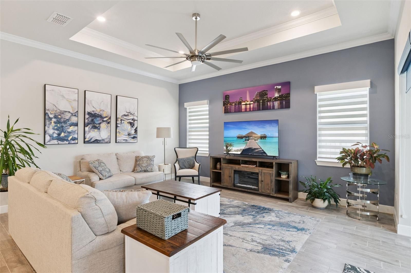 - Ceiling Fan(s), Crown Molding, Eat-in Kitchen, High Ceilings, In-Wall Pest Control, Kitchen/Family Room Combo, Open Floorplan, Main Level Primary, Solid Surface Counters, Solid-Wood Cabinets, Split Bedrooms, Tray Ceiling(s), Walk-In Closet(s), Window Treatments
