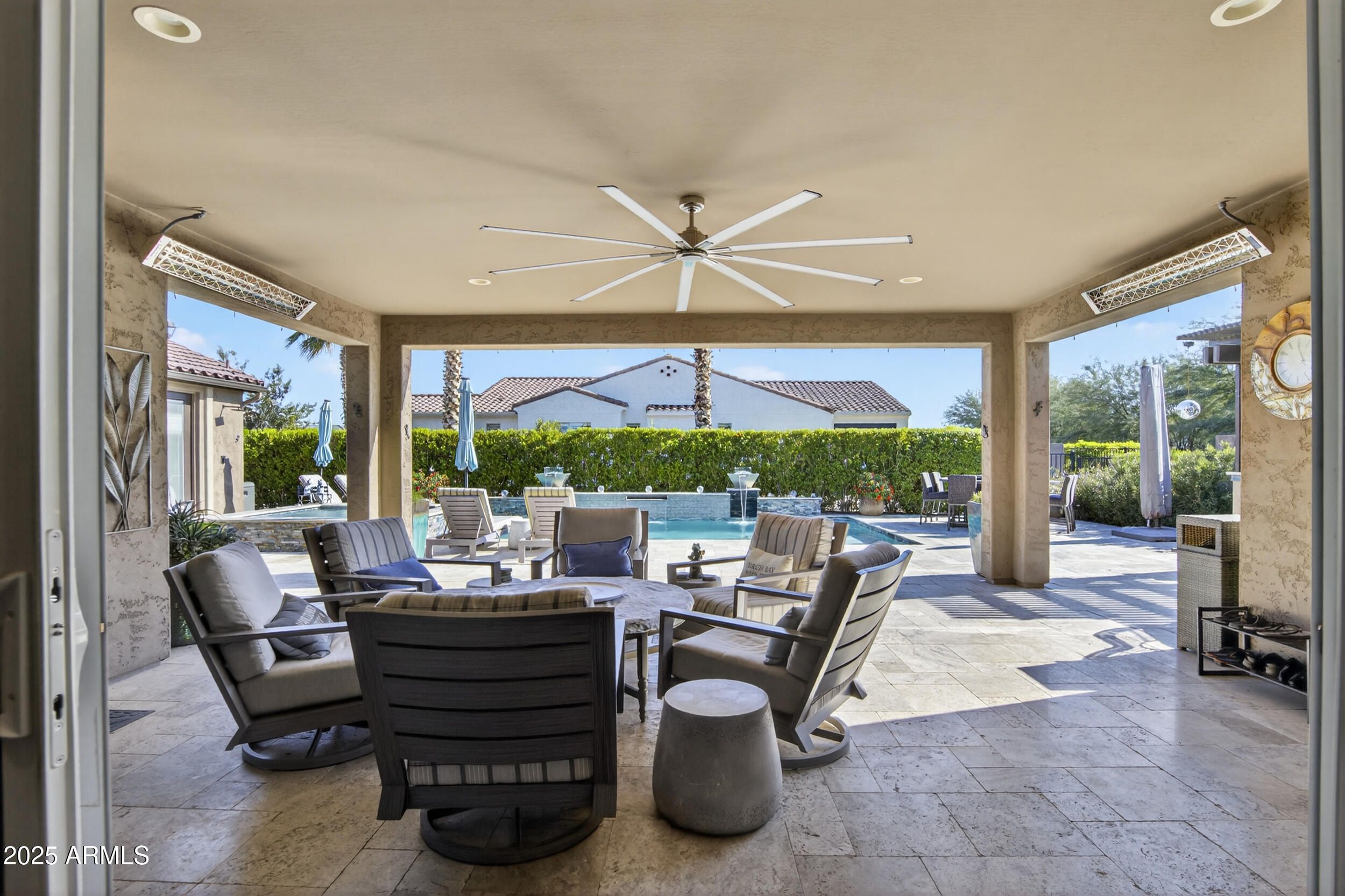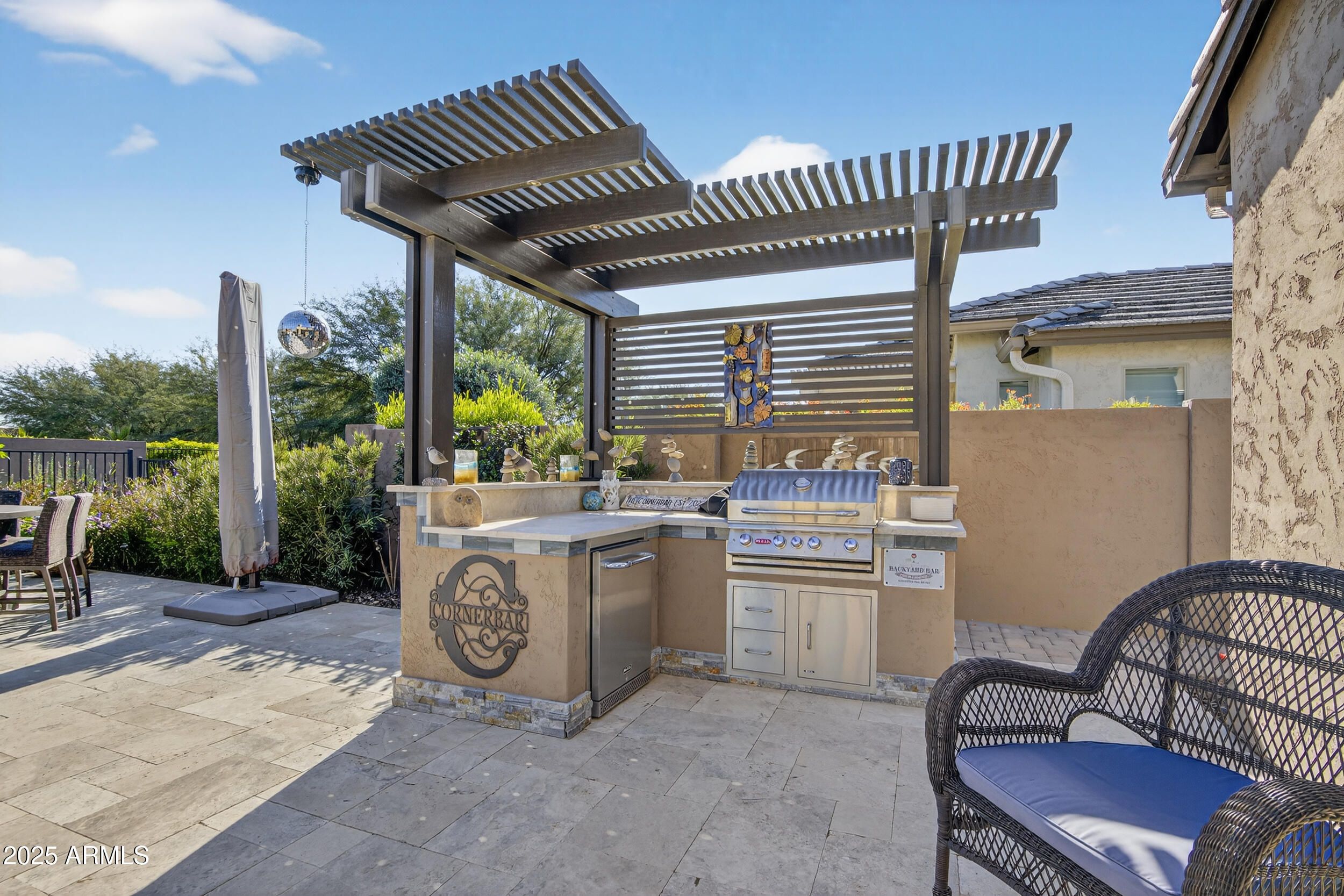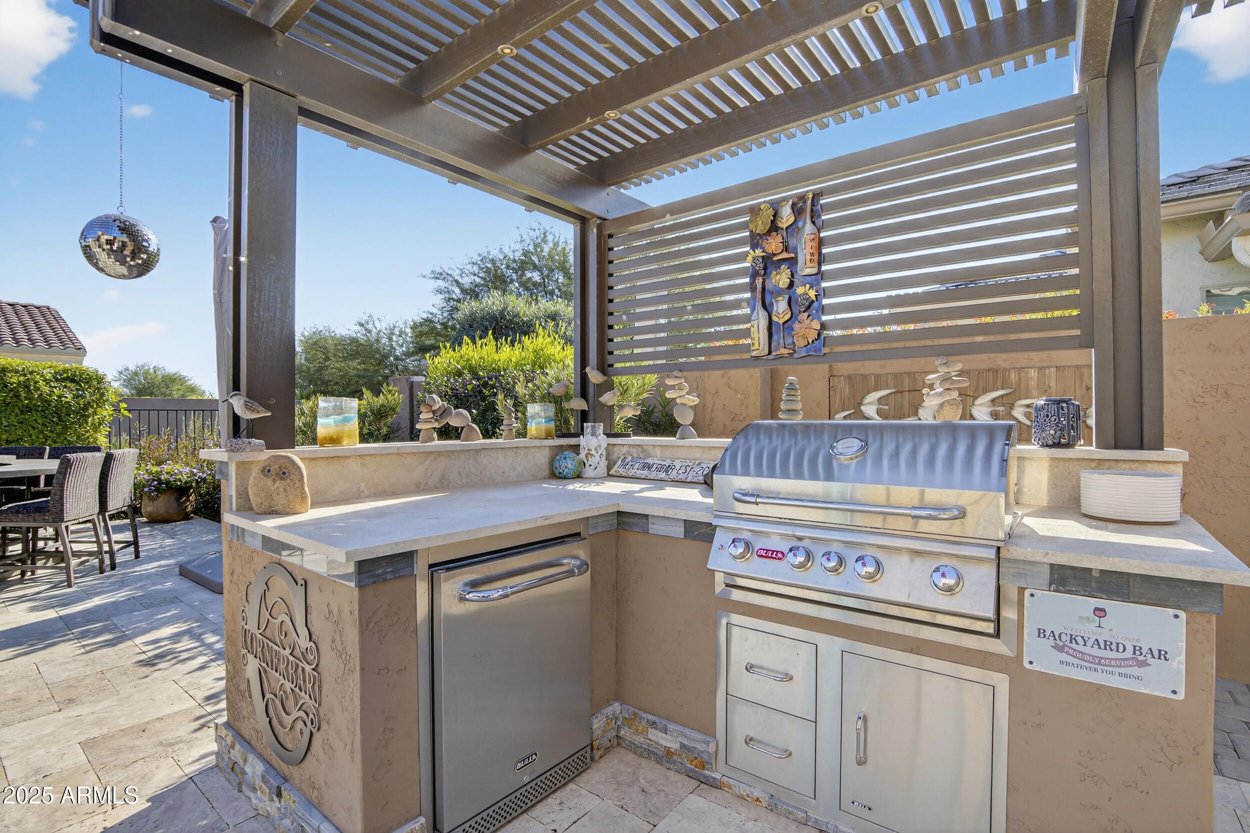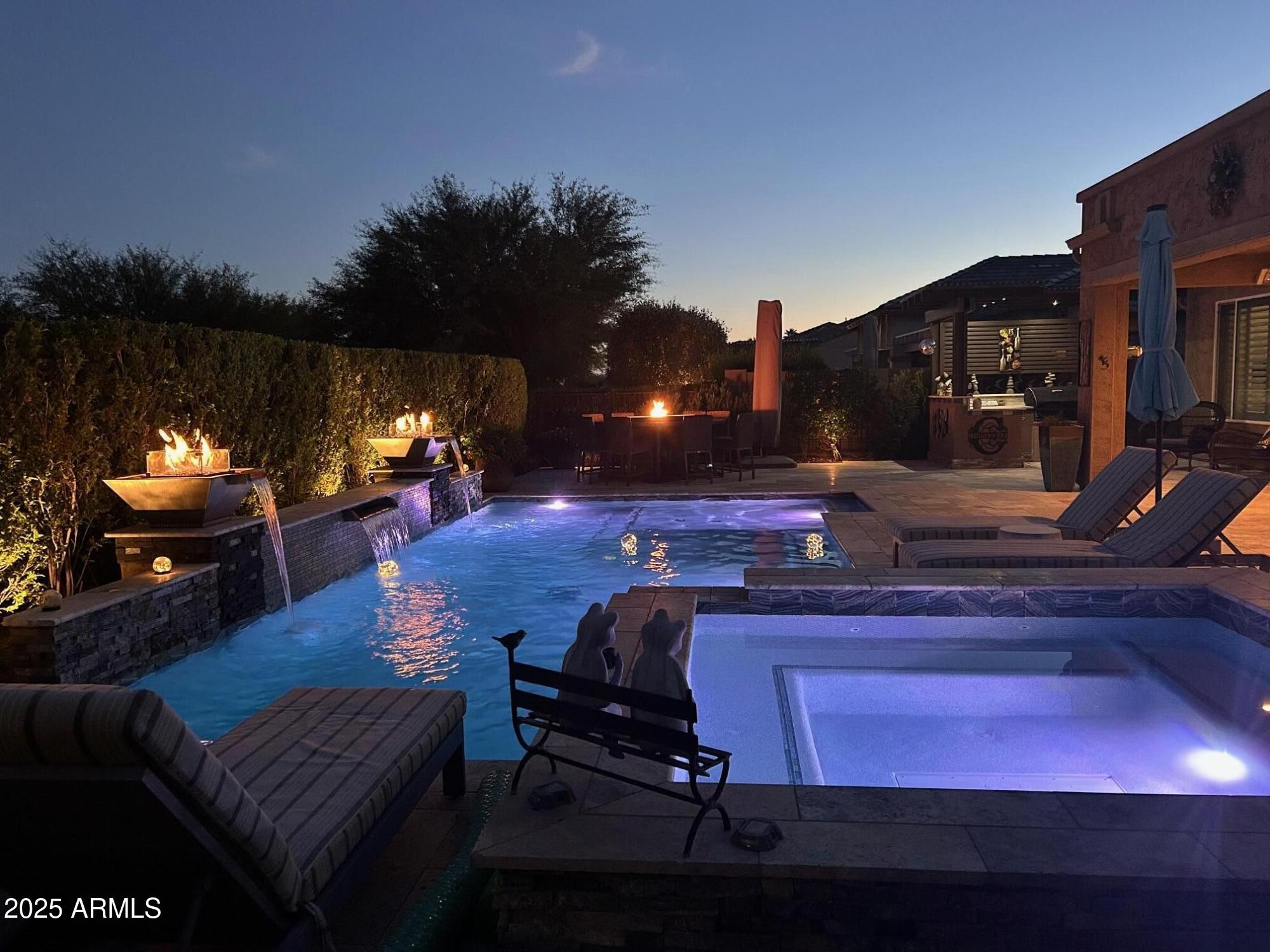 Discover exceptional resort-style living in this highly upgraded Treviso model home located in the award-winning PebbleCreek active adult community. This rare offering includes a detached casita, private pool and spa, owned solar, the perfect blend of luxury, comfort, and functionality. This home features an open living area, kitchen and an amazing custom bar, perfect for entertaining and gathering with guests. The custom pool and elevated spa, multiple seating areas, and mature desert landscaping create your own serene oasis—ideal for entertaining or quiet evenings under the Arizona sky. Inside, the popular Treviso floorplan showcases an elegant open-concept design with premium upgrades thr and enhanced architectural details. The gourmet kitchen features a spacious island, abundant storage, and ideal flow for hosting family and friends. The detached casita offers the perfect guest retreat with its own bedroom and bathroom providing comfort and privacy for visitors. The extended garage delivers extra space for vehicles, a golf cart, or workshop needs. Energy-efficient owned solar adds tremendous value, reducing monthly utility costs while supporting sustainable living. Living in PebbleCreek, you'll enjoy world-class amenities including 3 championship golf courses, resort pools, state-of-the-art fitness centers, 36 pickleball and tennis courts, creative arts studios, on-site restaurants, and a full calendar of clubs and events all within a secure, beautifully maintained 55+ master-planned community. This Treviso home offers unmatched upgrades, indoor-outdoor living, and premium features rarely found in one property. A true PebbleCreek gemmove-in ready and designed to impress.
