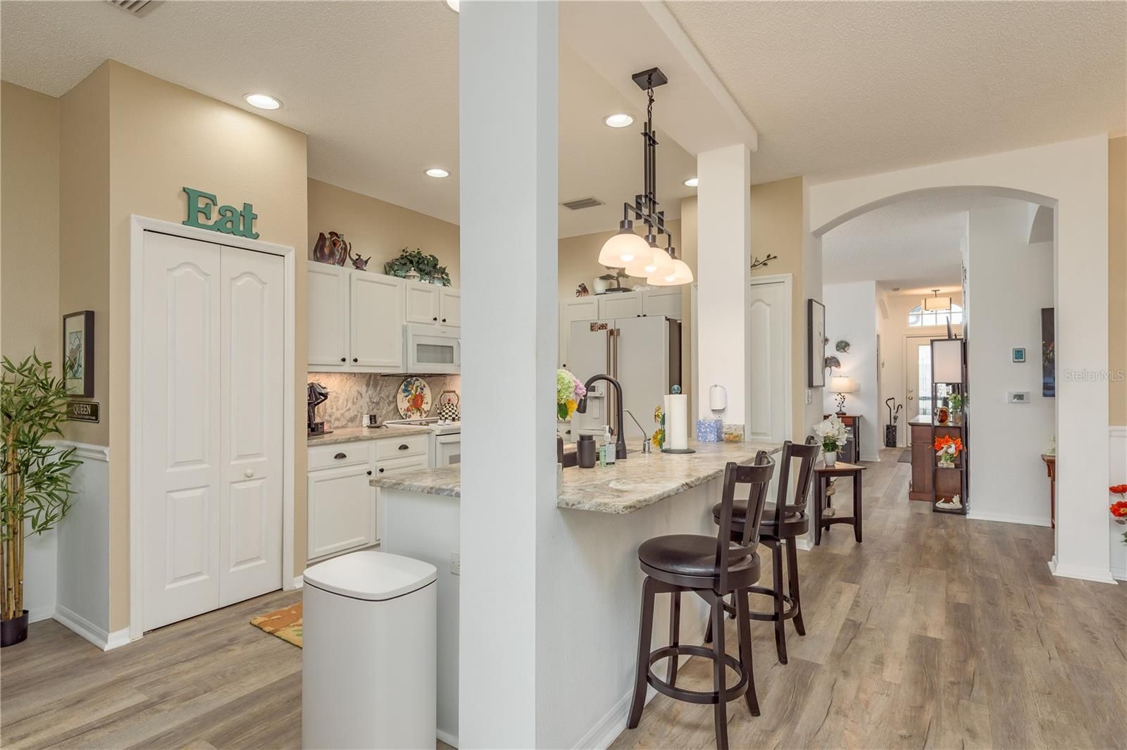 Exceptional home, beautifully decorated and all updated in sought after Key Vista 55+ neighborhood, located close to the awesome Gulf Waters, Marinas, Aclote River Park with Beach, Picnic areas, Boat and Fishing Ramps, Key Vista Nature Park with miles of bicycle and walking Trails and very close to the historic and vibrant Tarpon Springs Sponge Dock District. This great home boasts 3 bedrooms in a 3 way split plan, one being used as an office with a large arched window, 2nd bedroom and Bath off the Hallway and the large Primary Bedroom with updated Ensuite. The updated Kitchen has new GE applicances with the 3 door classy gold trimmed Cafe Refrigerator, leather finished granite Counters, glass top Range, deep large Sink (with reverse osmosis) in Island and snack Counter, Dishwasher and Microwave, 2 pantry Closets and spacious but cozy Dinette area overlooking screened tiled Lanai and private backyard. The kitchen, part of the Great Room can either be the family Room or Dining Room, is flanked by the open living Room area. Beautiful new Luxury vinyl Floors in all living areas, new Bedroom Carpeting, updated light fixtures, new vanities and fixtures, NEW ROOF 8/22, many new window shades and new front Door are only some of the many upgrades made to this home. Spacious screened tiled Lanai, great place to relax and enjoy the private back yard. The local Club house/Pool is on this street with access also to the main Club house offering large Pool, Tennis Courts, Playground and RV/Boat storage parking with availability. Don't miss out on this very special home located in a beautiful community! NOT IN A FLOOD ZONE. Sellers will include large wall mounted flat screened 70" TV in LR, 3 arched wall mirrors in Dining Room and Washer/Dryer. Home wheelchair friendly, HOA includes Lawn mowing.
