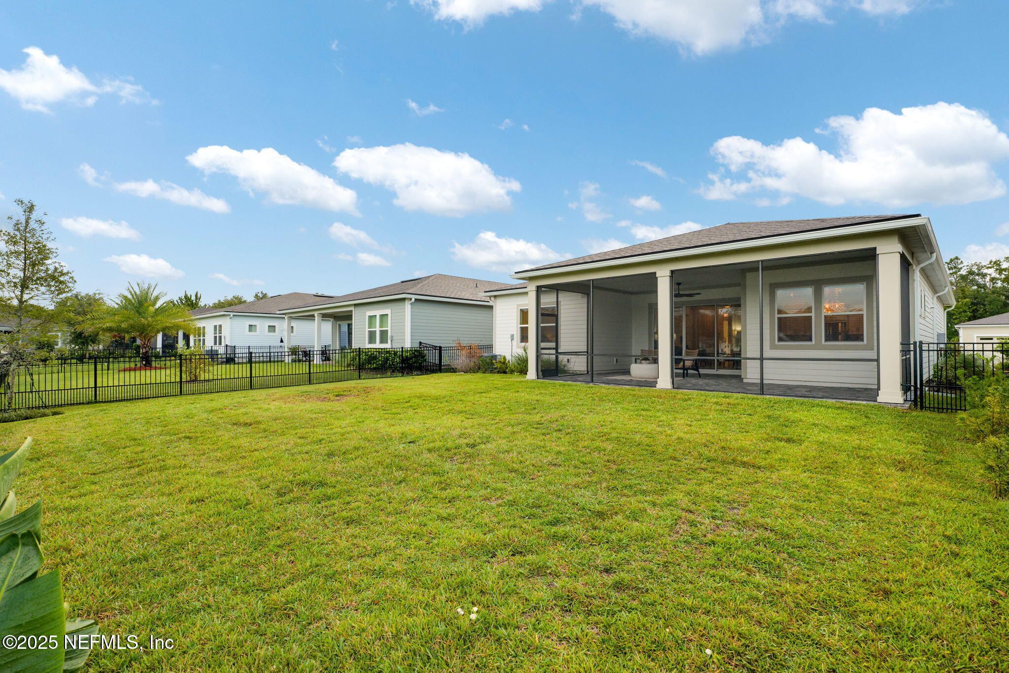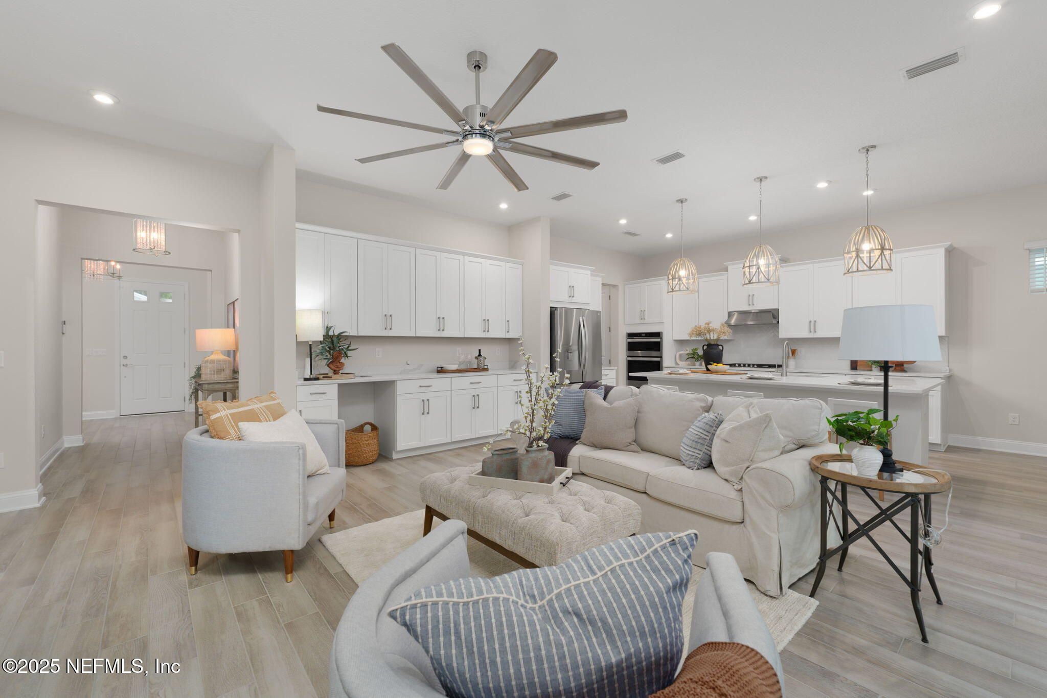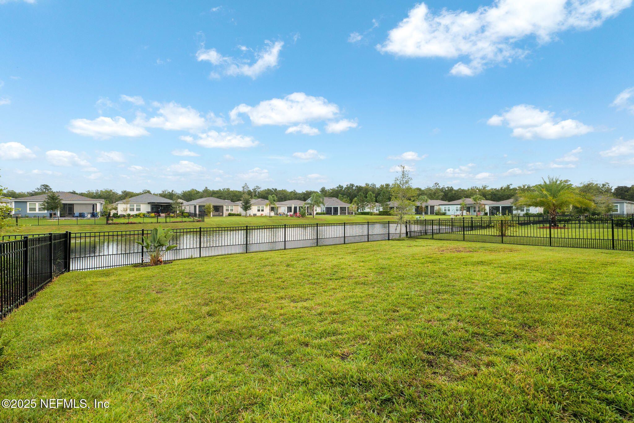 Waterfront Luxury in WaterSong at RiverTown. Step into this stunning 2023-built Pier Model, offering 1,914 sq. ft. of thoughtfully designed living space in WaterSong, Northeast Florida's premier 55+ gated community. With 2 bedrooms, a versatile den/flex room, and 2 baths on a premium 0.17-acre waterfront pond lot, this home blends modern elegance with relaxed living. Inside, you'll find wood plank tile flooring, crystal drop chandeliers, and a den with French doors that add charm and versatility. The gourmet kitchen is a showstopper, featuring white and gray quartz countertops, buffet counter with beverage fridge nook, an oversized dining island with coastal pendant lighting, stainless steel appliances, a built-in oven and microwave, gas cooktop with range hood, and chevron subway tile backsplash, perfect for entertaining or everyday luxury. The primary suite impresses with a tray ceiling, spa-like zero-entry shower, and oversized walk-in closet with luggage storage. Enjoy Florida living at its finest on the extended screened lanai with ceiling fan, overlooking the tranquil pond. Additional upgrades include a wrought iron fenced yard, tankless water heater, water softener, and extended garage for storage and convenience. WaterSong at RiverTown is designed for active adults, with exclusive amenities including resort-style and lap pools, pickleball and bocce ball courts, fitness centers, event lawns, a Biergarten, community events, and a full-time lifestyle director. Plus, you'll also enjoy all of RiverTown's amenitiesfrom the lazy river and kayak launch to riverfront pools, café, tennis, sports fields, and miles of nature trails. This home is more than a residence. It's a retreat where you can relax, socialize, and live your best Florida lifestyle.
