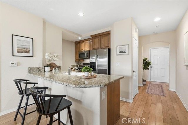 Luxurious Resort-Style Living at Breakwater Village. Welcome to the South Bay’s most desirable 55+ coastal community, Breakwater Village! This beautifully updated third-floor, turnkey 2-bedroom, 2-bath condo offers high-end finishes throughout. The spacious kitchen features granite countertops, stainless steel appliances, custom cabinetry, a breakfast bar, and a stacked laundry closet. The open-concept living area flows seamlessly to a private balcony with courtyard views—perfect for relaxing or entertaining. The home has been updated with wood flooring throughout (grandfathered in, as the HOA no longer allows new hardwood installations). The primary bedroom boasts an ensuite bathroom and generous walk-in closet, while the second bedroom is bright and airy with its own attached updated bath. Additional conveniences include two tandem parking spaces in the gated garage and a private storage unit. Enjoy resort-style amenities including a heated pool and lounge deck, outdoor fireplace and BBQ area, fitness center, private media room, and clubhouse complete with kitchen, dining area, and billiards. Breakwater Village offers a friendly, low-maintenance lifestyle with a professionally managed HOA and a vibrant social calendar featuring movie nights, card games, bus trips, and more. This secure, gated community also provides ample guest parking and an unbeatable location just minutes from the beach, top restaurants, South Bay Galleria, major freeways, and public transit.