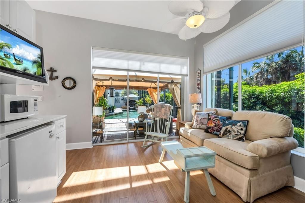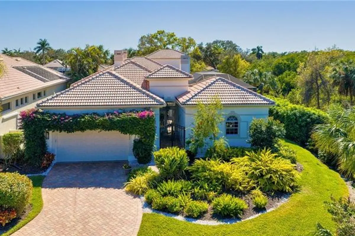 This truly remarkable residence is a masterclass in space, privacy, and resort-style living—designed for those who want room to spread out and places to come together—tucked away at the end of a quiet cul-de-sac in Anchorage at Bonita Bay. The setting is secluded by design, featuring a private roundabout entry, no neighboring home on one side, tranquil preserve views, and a serene lake stretching out beyond the rear of the property. Inside, the home unfolds into multiple living areas across a thoughtfully designed two-story addition, offering exceptional flexibility for everyday living, entertaining, and hosting guests, with Brazilian Teak floors throughout the main living areas, crown molding in the living/dining area as well as the primary suite and den, and Hunter Douglas Silhouette blinds on many of the floor-to-ceiling windows. A detached 1-bed, 1-bath cabana just off the courtyard—with a morning kitchenette and cozy sitting area—offers ideal guest accommodations or a secluded private escape. Inside, the thoughtfully designed layout features two additional bedrooms, a den, and a loft-style bonus space, ensuring everyone enjoys their own place to retreat. Three fireplaces anchor the home with warmth and architectural presence, creating inviting spaces to relax and gather. The kitchen blends timeless craftsmanship with modern convenience, featuring cherry cabinetry, quartz countertops, a generous stainless-steel sink with Moen fixture, bar seating, and a sunlit breakfast area. A bar with wine cooler elevates the entertaining experience. Outdoors, the resort-style lanai feels like a private tropical retreat, complete with waterfall features, covered lounging areas, and app-controlled pool and spa lighting via the AquaLink system. Morning sunrises over the lake set the tone for the day, while preserve views to the rear and side ensure long-term privacy and a serene backdrop. The primary suite features two separate, designated bathrooms with granite countertops—offering a rare and luxurious level of comfort. Additional highlights include a 2019 roof, A/C 2022 and 2014, manual and electric hurricane shutters, and desirable southern and eastern rear exposure. Residents of Bonita Bay enjoy an exceptional lifestyle with championship golf, a private beach park, marina access, scenic trails, tennis and pickleball, a state-of-the-art fitness center, and a rich calendar of social and dining experiences. Ideally located near Riverwalk Park, this residence combines natural beauty, thoughtful design, and the coveted Bonita Bay lifestyle. This private estate was designed for living beautifully, inside and out.