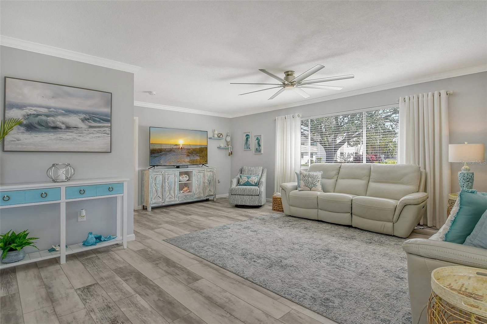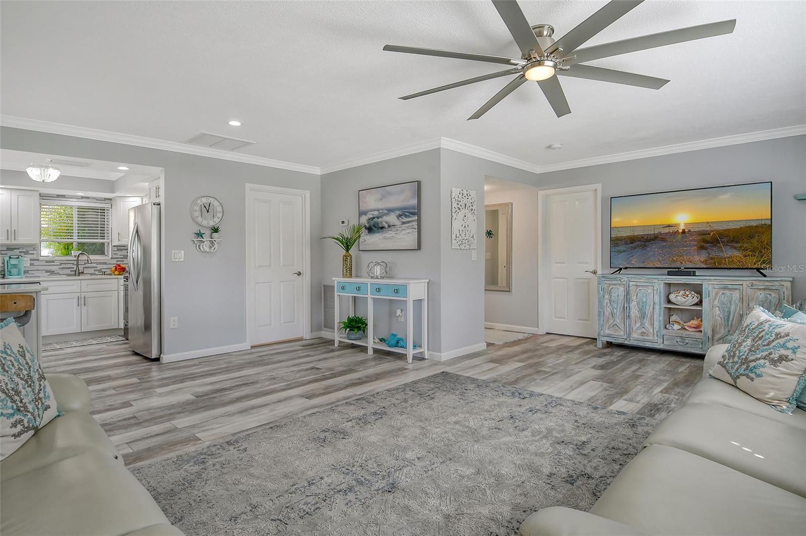 - Ceiling Fan(s), Crown Molding, Open Floorplan, Main Level Primary, Solid Surface Counters, Solid-Wood Cabinets, Split Bedrooms, Stone Counters, Walk-In Closet(s), Window Treatments