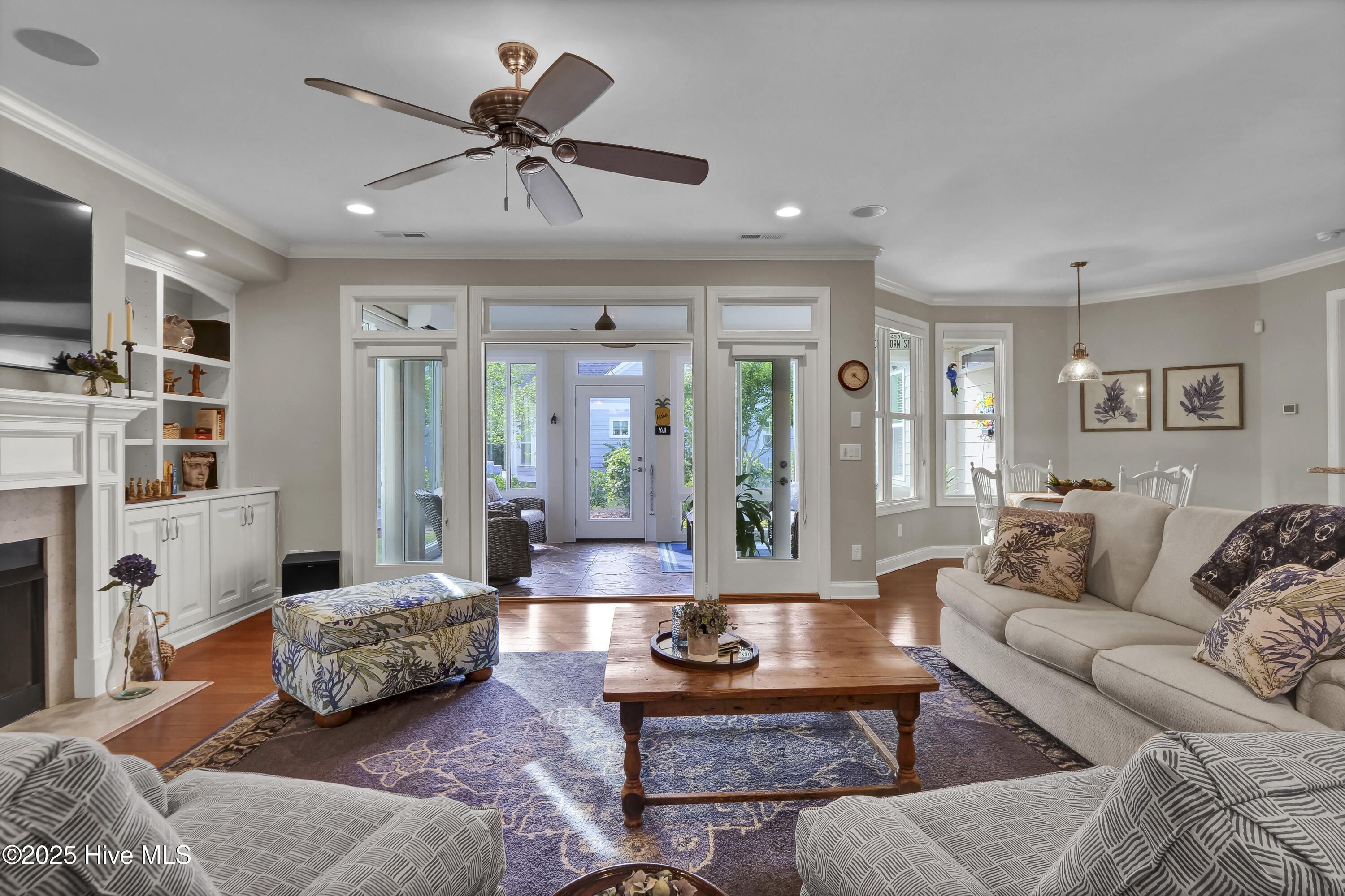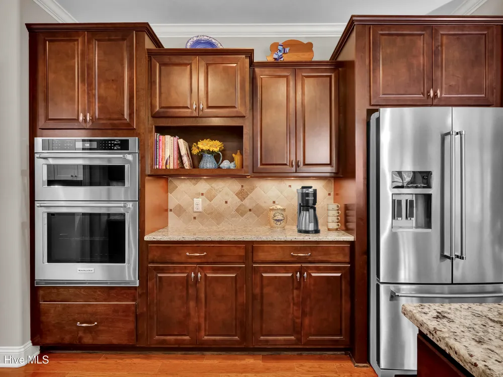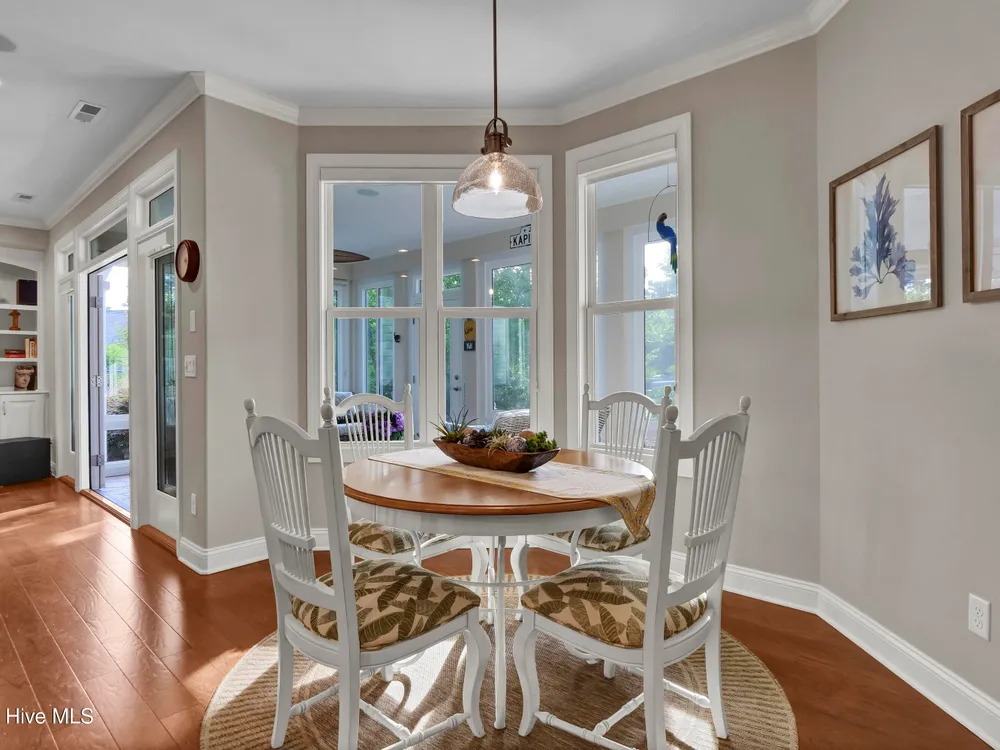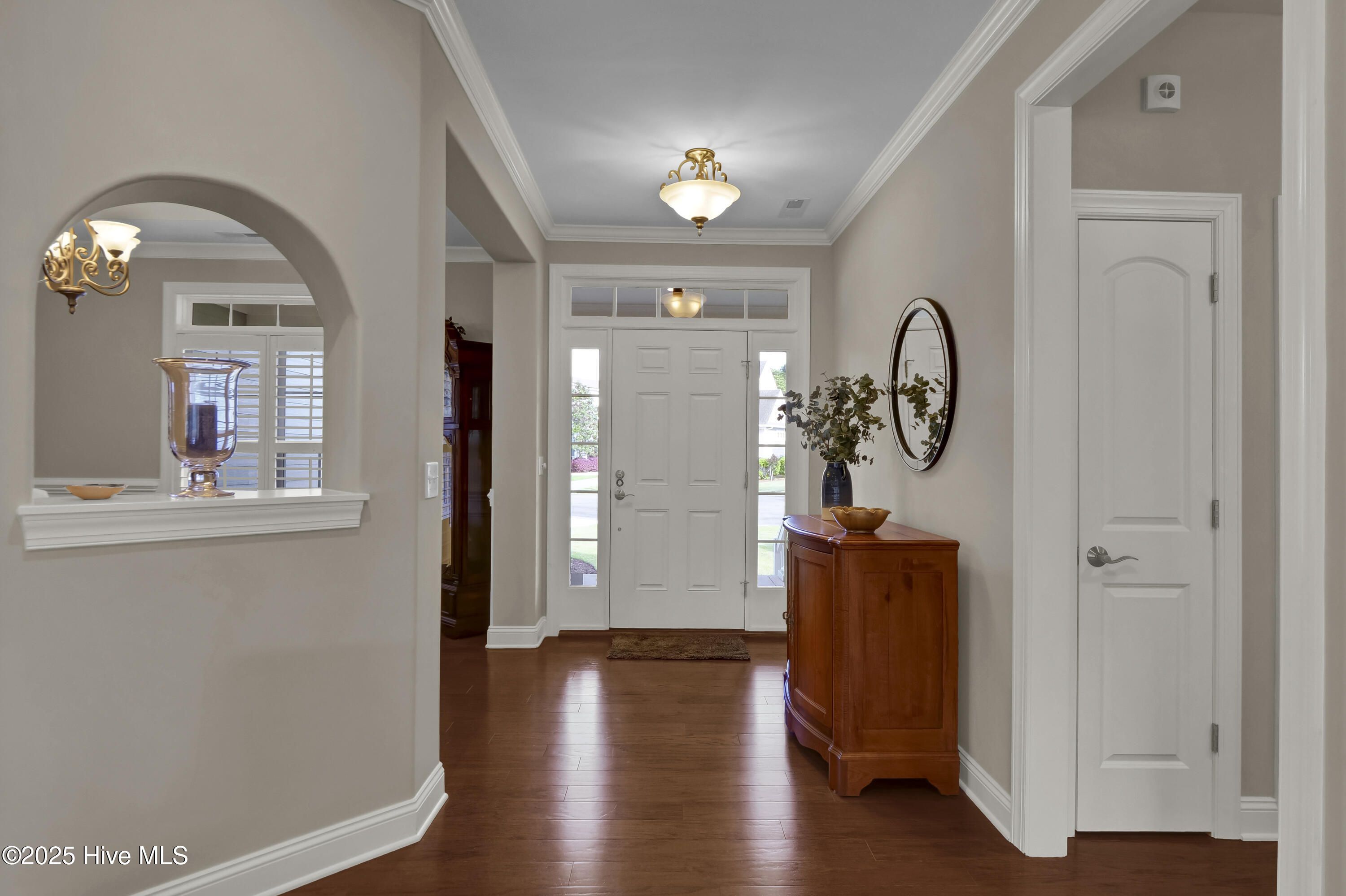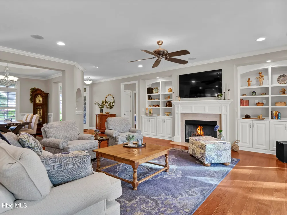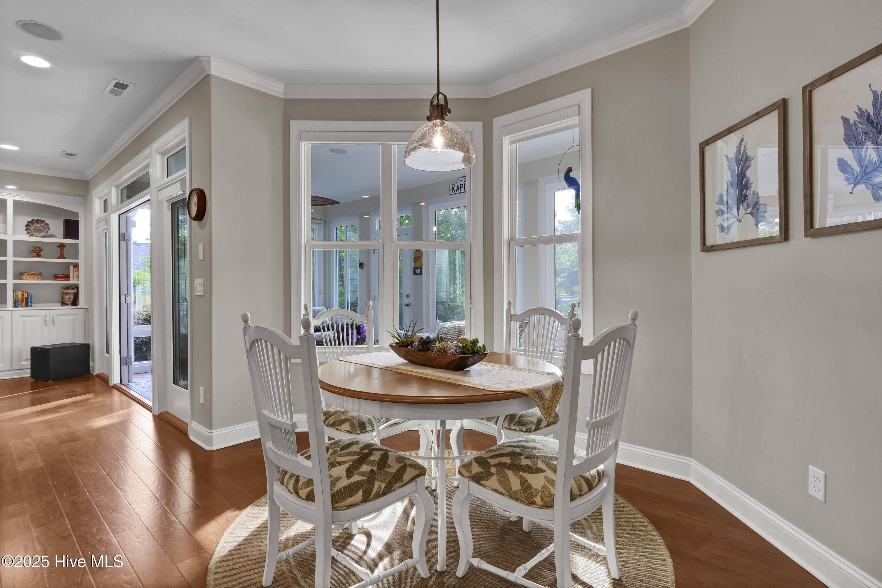 Nestled in a quiet cul de sac, this beautiful Barker and Canady home awaits you. The main floor features hardwood floors throughout the dining room, living room and kitchen, new stainless appliances, granite countertops, plantation shutters, crown molding, and a gas fireplace surrounded by book shelves. The open floor plan is the perfect gathering venue to entertain family and friends not to mention the new sun room featuring plenty of windows overlooking the back patio, a perfect spot to watch nature and enjoy a cup of coffee or evening cocktail. The primary bedroom has coffered ceiling, California designed closet and large spa like bath. Two additional bedrooms (one being used as home office) share a jack and jill bath. Upstairs has a large bonus room/bedroom plus full bath. Huge floored walk in storage should you need to convert from storage to a media room. Laundry room with extra deep sink, Fortified new roof 2024, two car garage with storage cabinets galore and epoxy floor. The crawl space has vapor barrier and dehumidifier. All St. James residents enjoy 4 security gates, gated private beach club with showers and a pool, marina including Beacon Restaurant and Tiki Bar and all of the parks. Being a resident offers the opportunity to join the private clubs. That includes 4 country clubs, 81 holes of golf, 4 more pools, 3 gyms, Har Tru tennis, pickleball, croquet. Enjoy the lifestyle today! Come see why St James has been the number 1 Coastal Community in the Carolinas for 20 years! Don't miss the chance to make this home your own.