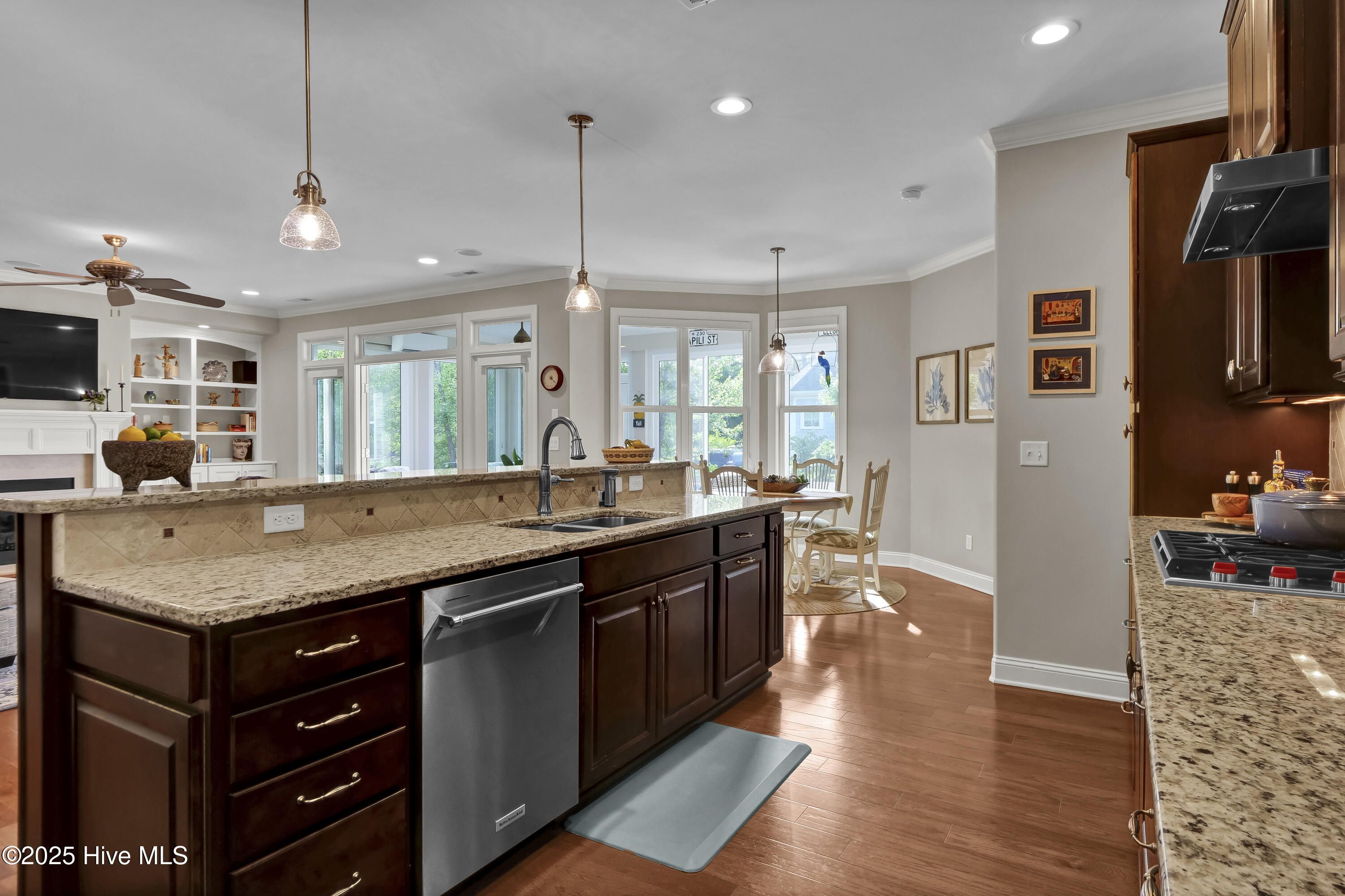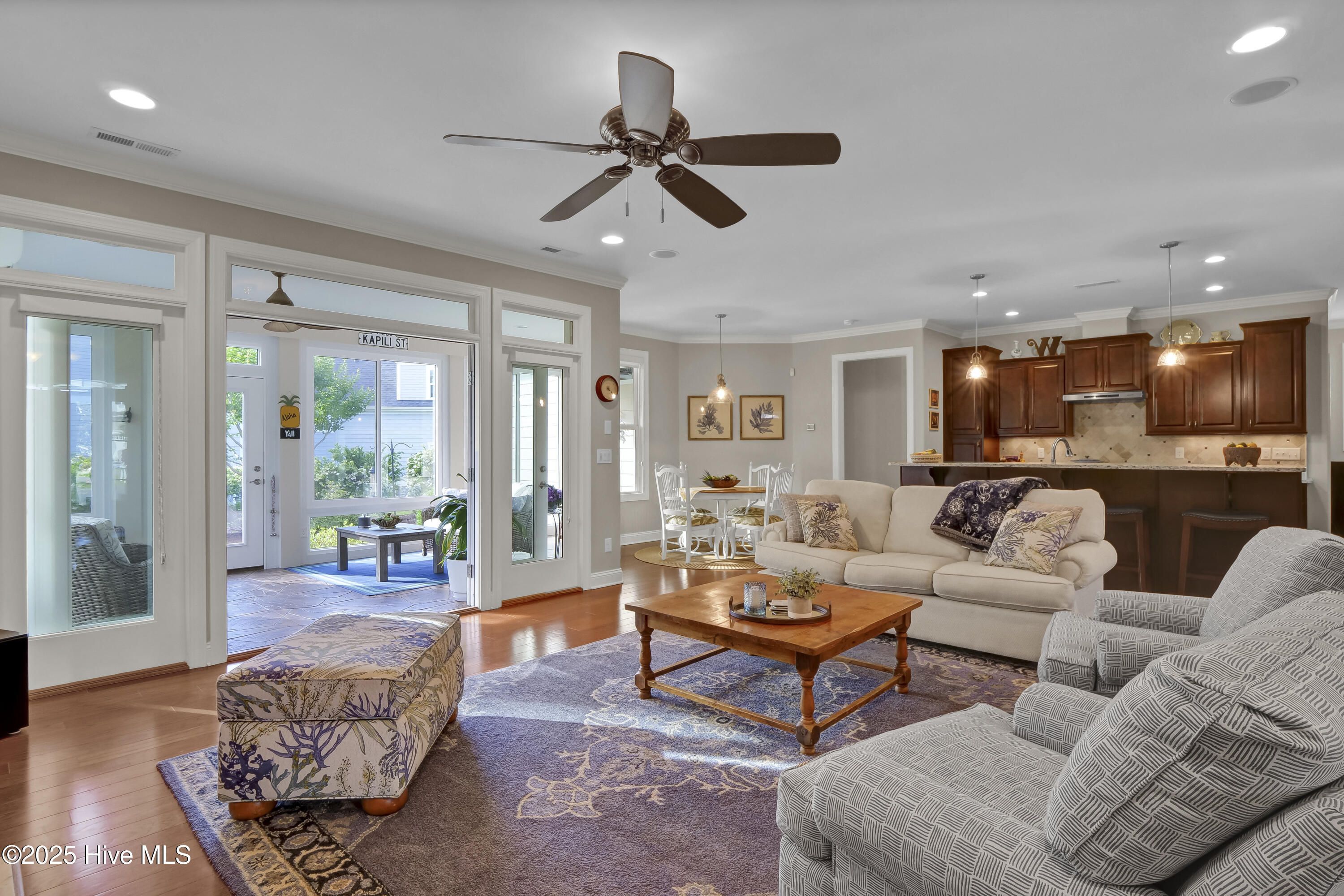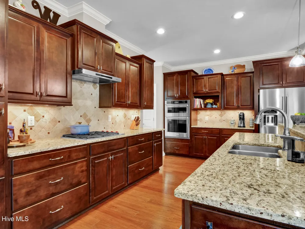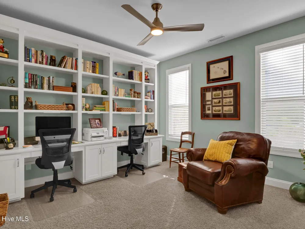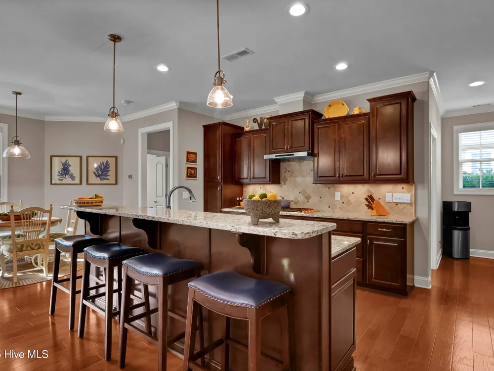Nestled in a quiet cul de sac, this beautiful Barker and Canady home awaits you. The main floor features hardwood floors throughout the dining room, living room and kitchen, new stainless appliances, granite countertops, plantation shutters, crown molding, and a gas fireplace surrounded by book shelves. The open floor plan is the perfect gathering venue to entertain family and friends not to mention the new sun room featuring plenty of windows overlooking the back patio, a perfect spot to watch nature and enjoy a cup of coffee or evening cocktail. The primary bedroom has coffered ceiling, California designed closet and large spa like bath. Two additional bedrooms (one being used as home office) share a jack and jill bath. Upstairs has a large bonus room/bedroom plus full bath. Huge floored walk in storage should you need to convert from storage to a media room. Laundry room with extra deep sink, Fortified new roof 2024, two car garage with storage cabinets galore and epoxy floor. The crawl space has vapor barrier and dehumidifier. All St. James residents enjoy 4 security gates, gated private beach club with showers and a pool, marina including Beacon Restaurant and Tiki Bar and all of the parks. Being a resident offers the opportunity to join the private clubs. That includes 4 country clubs, 81 holes of golf, 4 more pools, 3 gyms, Har Tru tennis, pickleball, croquet. Enjoy the lifestyle today! Come see why St James has been the number 1 Coastal Community in the Carolinas for 20 years! Don't miss the chance to make this home your own.