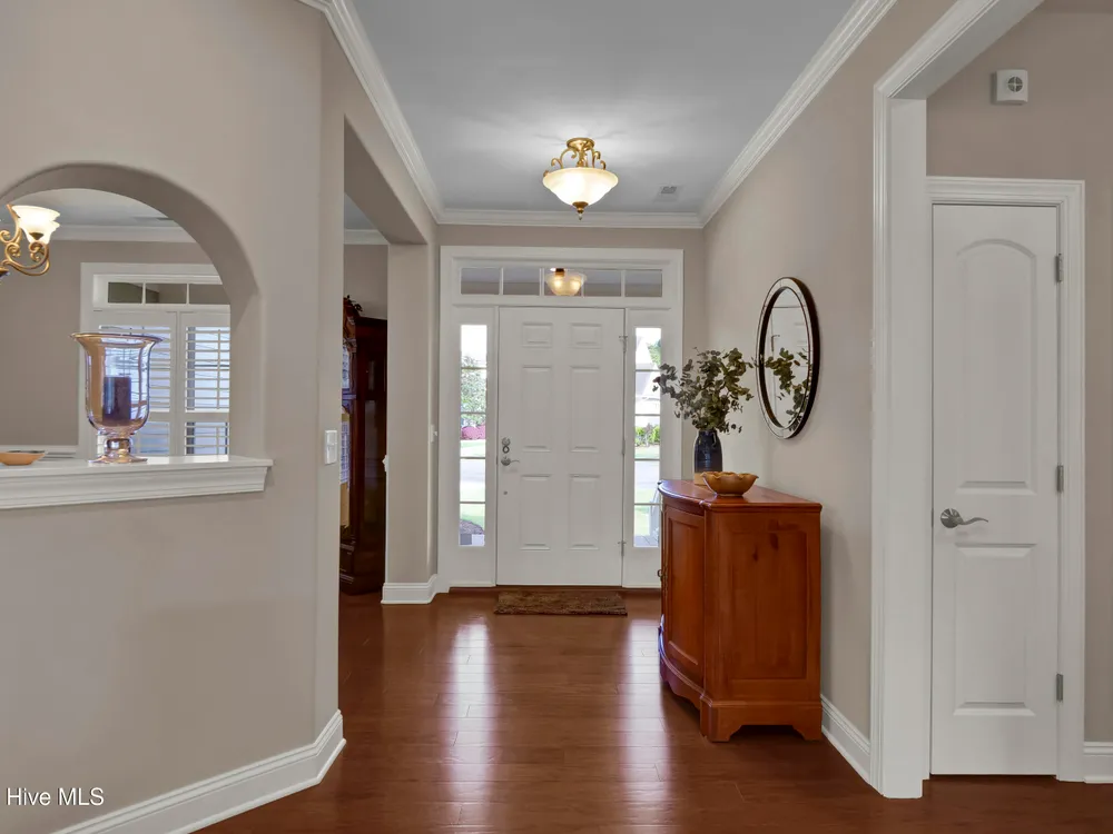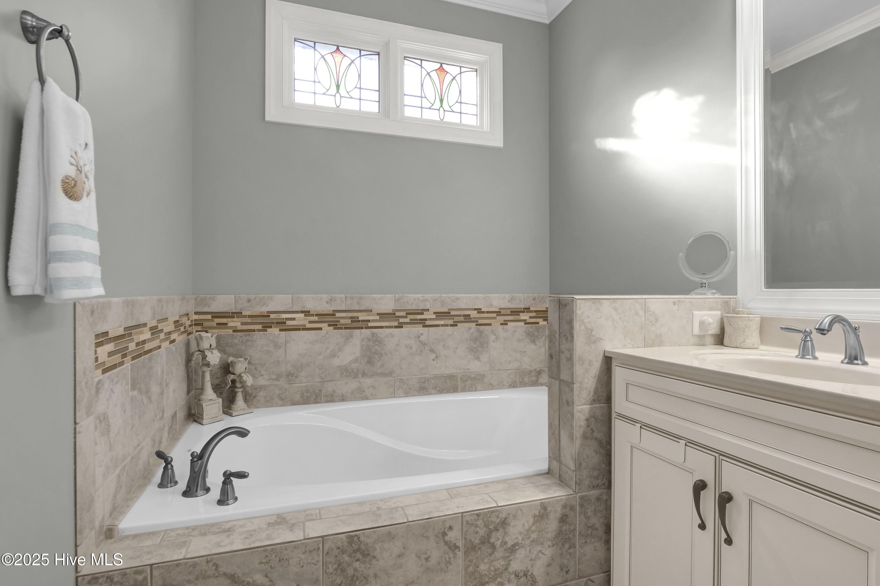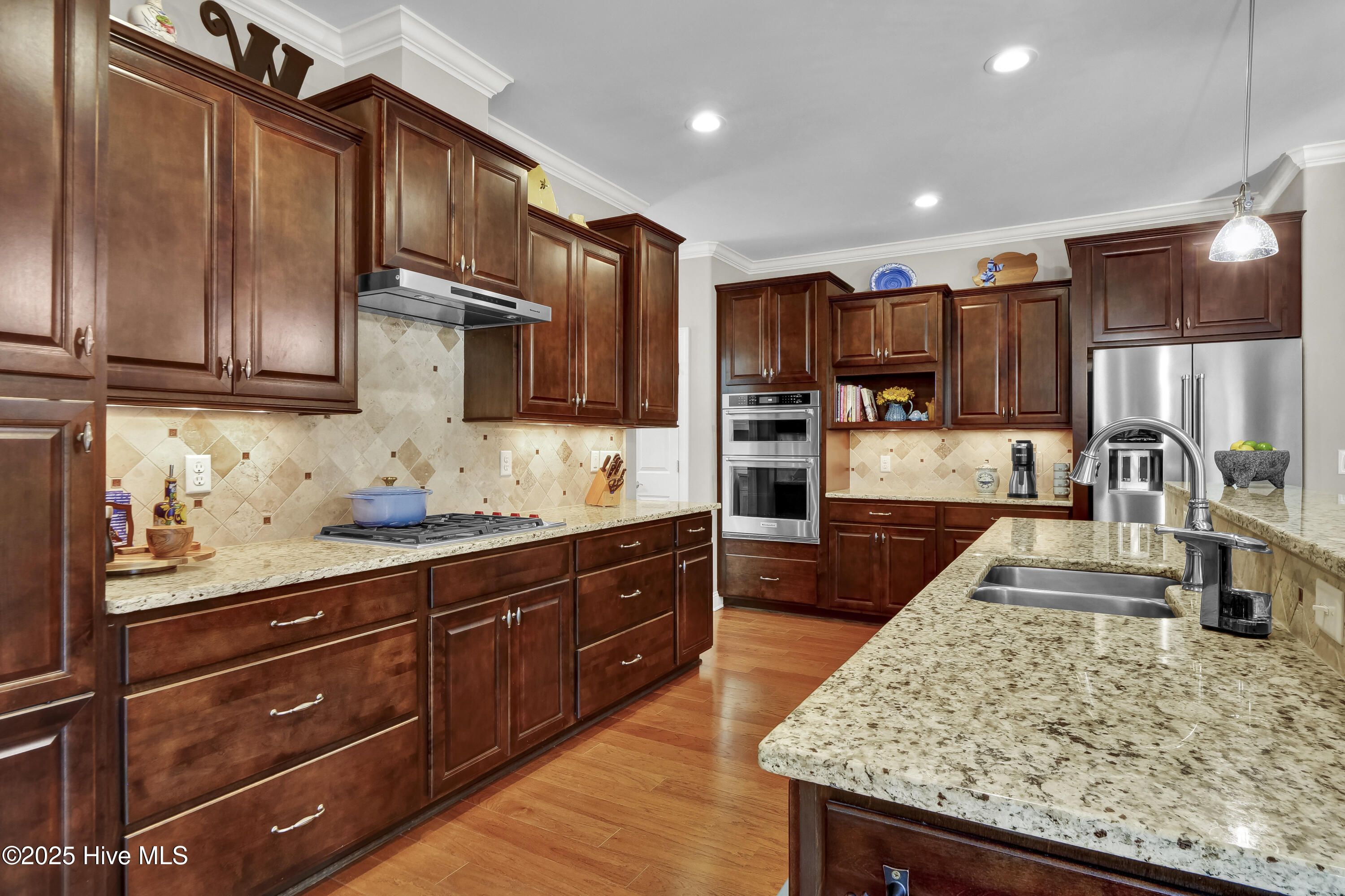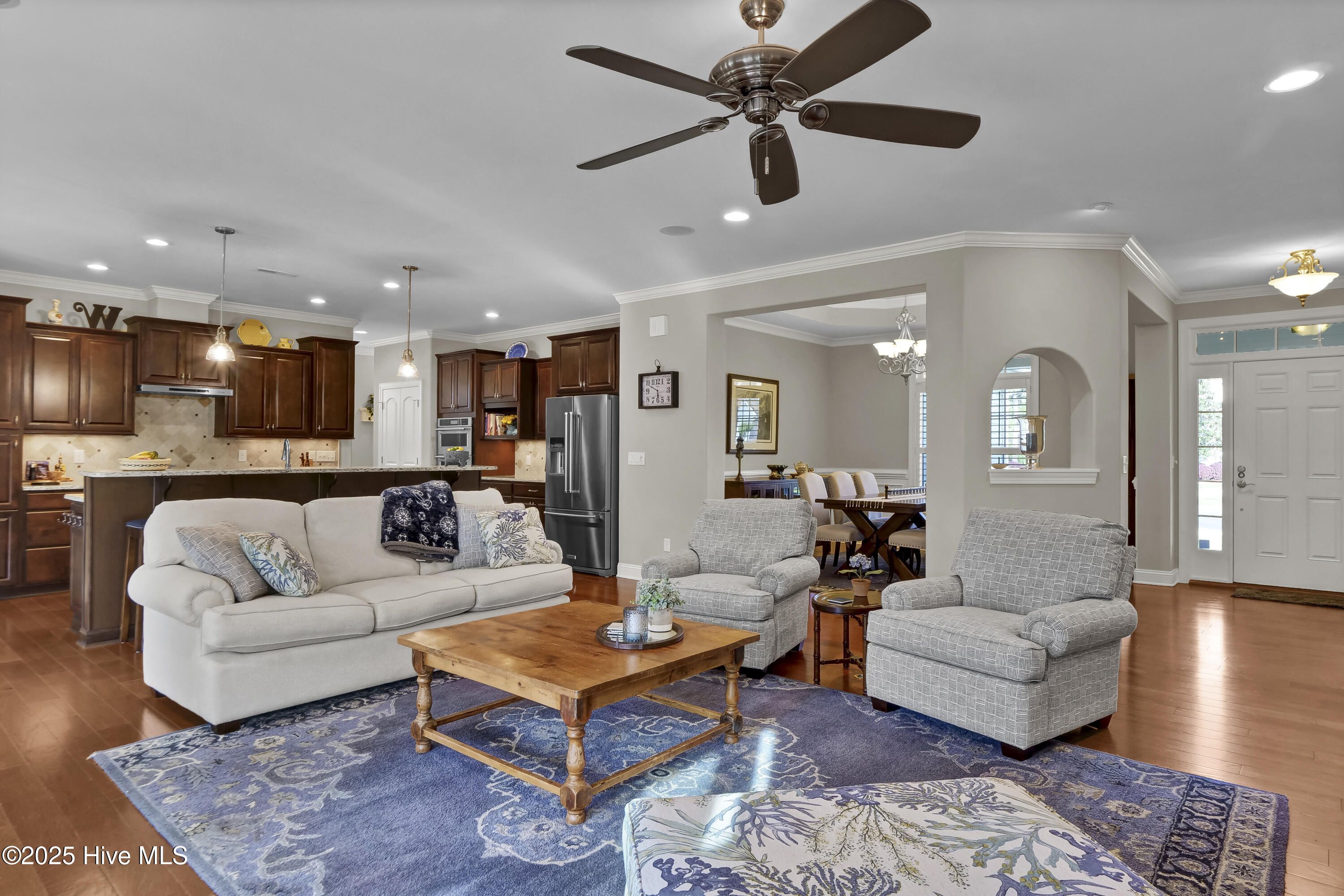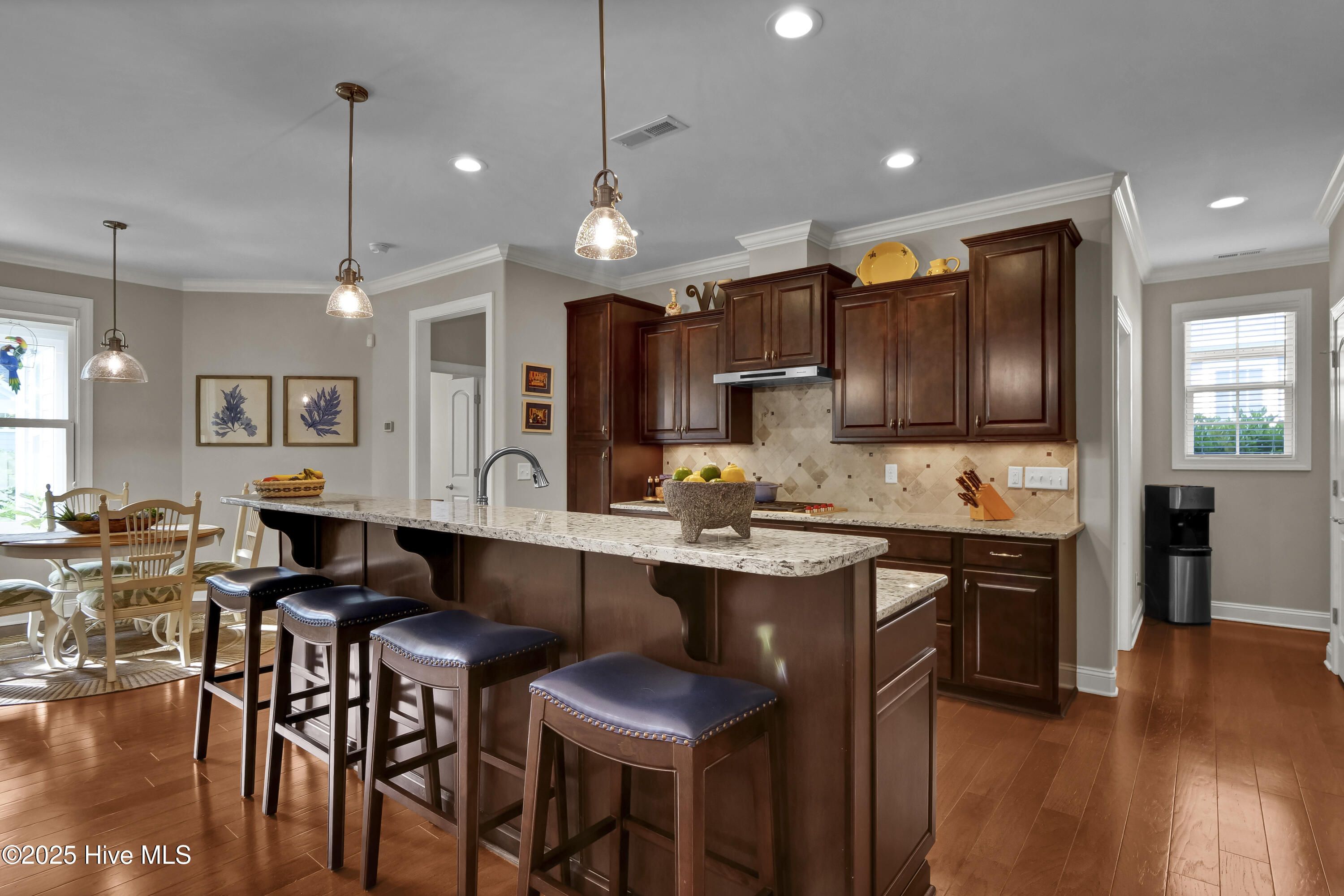 Nestled in a quiet cul de sac, this beautiful Barker and Canady home awaits you. The main floor features hardwood floors throughout the dining room, living room and kitchen, new stainless appliances, granite countertops, plantation shutters, crown molding, and a gas fireplace surrounded by book shelves. The open floor plan is the perfect gathering venue to entertain family and friends not to mention the new sun room featuring plenty of windows overlooking the back patio, a perfect spot to watch nature and enjoy a cup of coffee or evening cocktail. The primary bedroom has coffered ceiling, California designed closet and large spa like bath. Two additional bedrooms (one being used as home office) share a jack and jill bath. Upstairs has a large bonus room/bedroom plus full bath. Huge floored walk in storage should you need to convert from storage to a media room. Laundry room with extra deep sink, Fortified new roof 2024, two car garage with storage cabinets galore and epoxy floor. The crawl space has vapor barrier and dehumidifier. All St. James residents enjoy 4 security gates, gated private beach club with showers and a pool, marina including Beacon Restaurant and Tiki Bar and all of the parks. Being a resident offers the opportunity to join the private clubs. That includes 4 country clubs, 81 holes of golf, 4 more pools, 3 gyms, Har Tru tennis, pickleball, croquet. Enjoy the lifestyle today! Come see why St James has been the number 1 Coastal Community in the Carolinas for 20 years! Don't miss the chance to make this home your own.