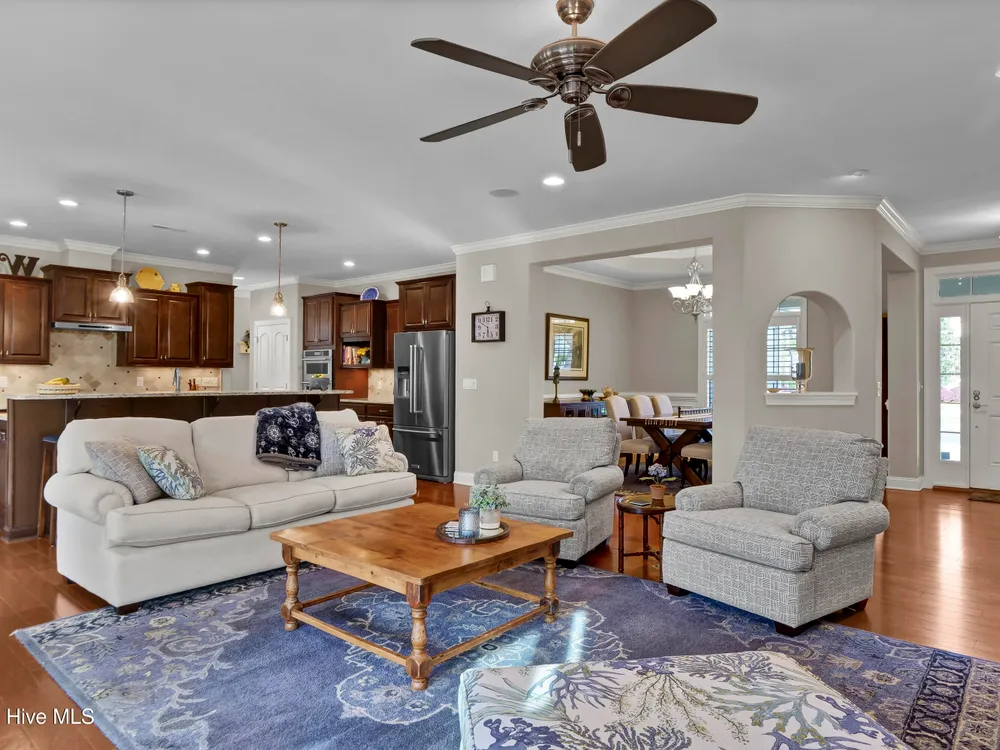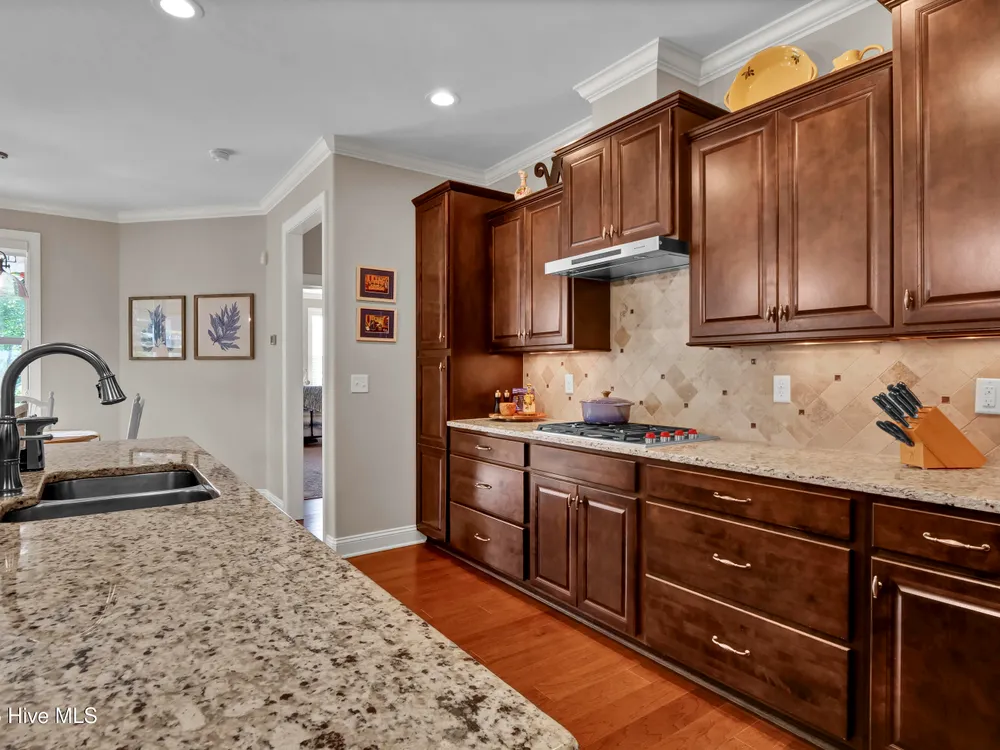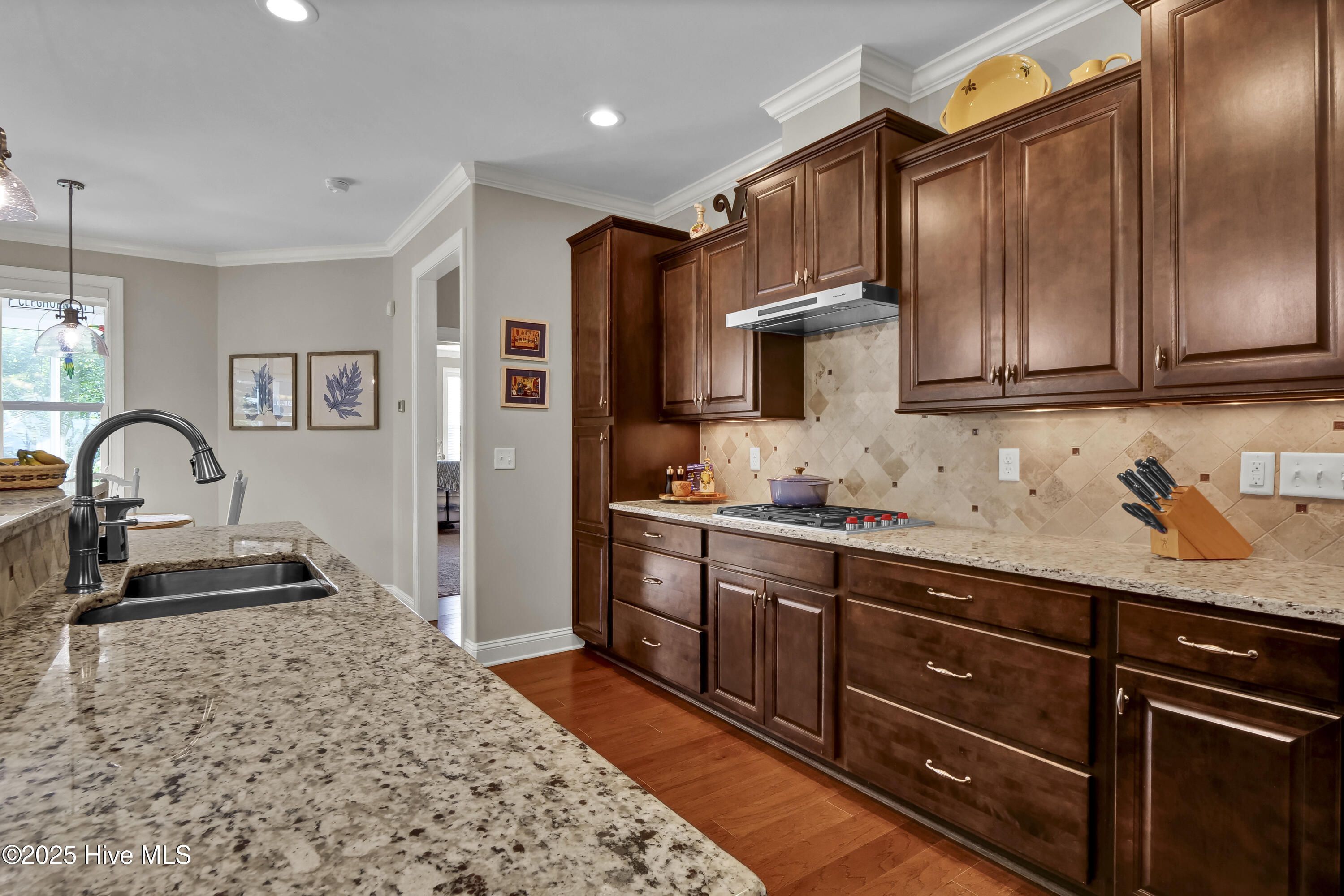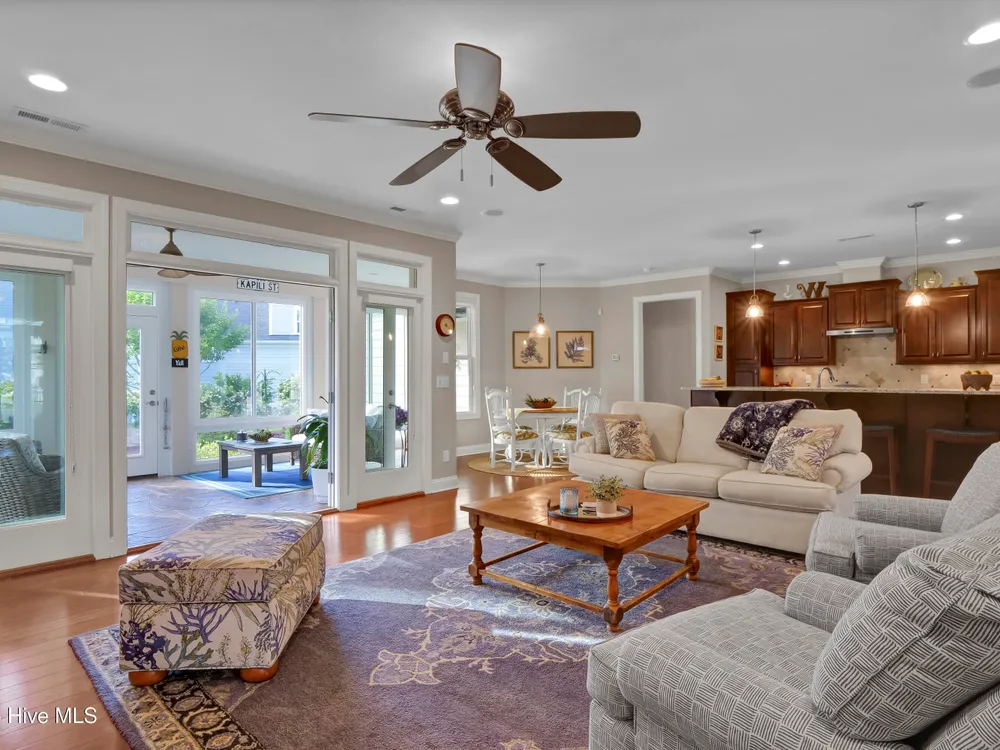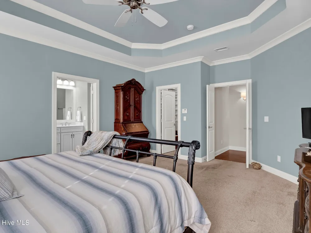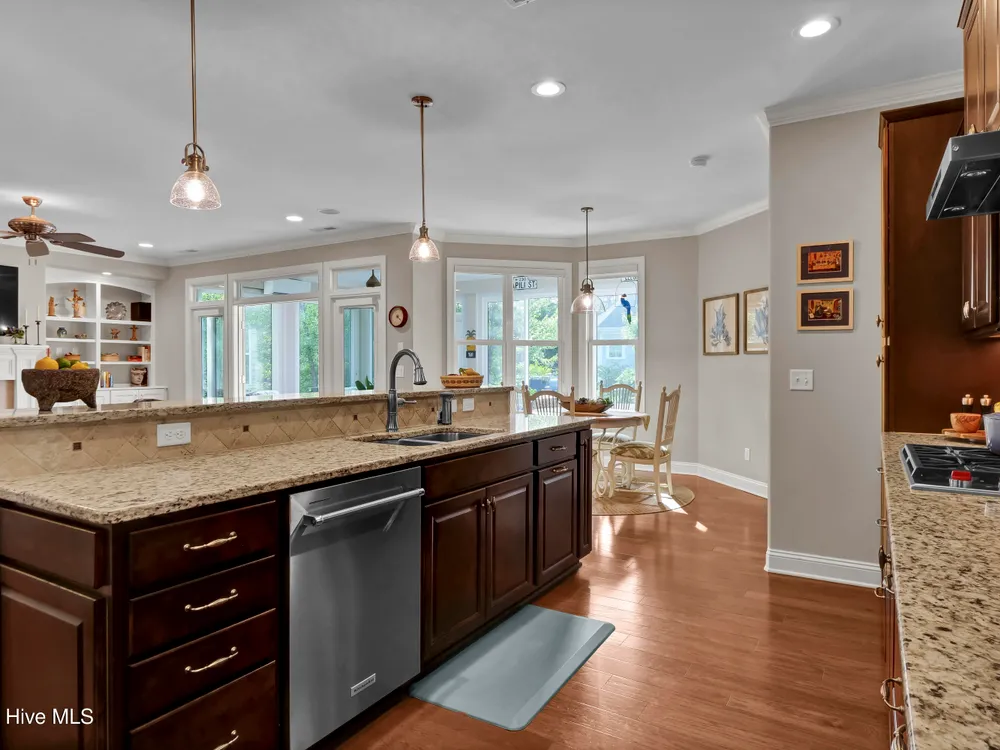 Nestled in a quiet cul de sac, this beautiful Barker and Canady home awaits you. The main floor features hardwood floors throughout the dining room, living room and kitchen, new stainless appliances, granite countertops, plantation shutters, crown molding, and a gas fireplace surrounded by book shelves. The open floor plan is the perfect gathering venue to entertain family and friends not to mention the new sun room featuring plenty of windows overlooking the back patio, a perfect spot to watch nature and enjoy a cup of coffee or evening cocktail. The primary bedroom has coffered ceiling, California designed closet and large spa like bath. Two additional bedrooms (one being used as home office) share a jack and jill bath. Upstairs has a large bonus room/bedroom plus full bath. Huge floored walk in storage should you need to convert from storage to a media room. Laundry room with extra deep sink, Fortified new roof 2024, two car garage with storage cabinets galore and epoxy floor. The crawl space has vapor barrier and dehumidifier. All St. James residents enjoy 4 security gates, gated private beach club with showers and a pool, marina including Beacon Restaurant and Tiki Bar and all of the parks. Being a resident offers the opportunity to join the private clubs. That includes 4 country clubs, 81 holes of golf, 4 more pools, 3 gyms, Har Tru tennis, pickleball, croquet. Enjoy the lifestyle today! Come see why St James has been the number 1 Coastal Community in the Carolinas for 20 years! Don't miss the chance to make this home your own.