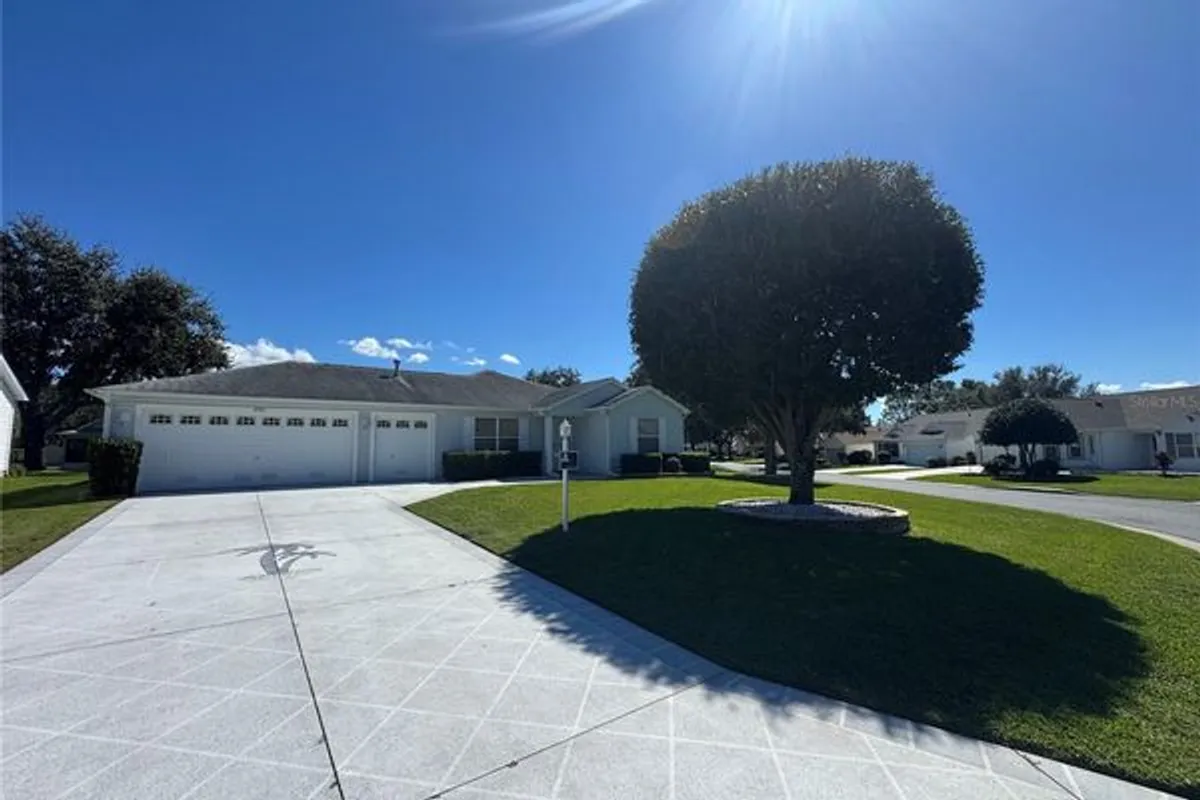 NOTE: NEW PRICE IMPROVEMENT....This beautifully maintained Austin model home offers thoughtful upgrades and is move-in ready! The two-car garage with a golf cart garage features a utility sink and washer and dryer. A long driveway welcomes you, complemented by mature landscaping and a quiet street location. Inside, enjoy Pergo flooring throughout the main living areas, tile in the bathrooms, and plush carpet in the bedrooms. The kitchen is a showstopper with quartz countertops, a gas stove, microwave, dishwasher, large corner cabinet for extra storage, and a skylight that floods the space with natural light. A breakfast bar with bar stools makes it perfect for casual dining. The custom master closet, Murphy bed with bedroom set in the guest room, and ceiling fans in every room provide both style and function. Relax year-round in the enclosed lanai under AC or enjoy the open lanai with ceiling fans. Additional highlights include a hot water heater (2017) and fresh interior paint. The yard is beautifully landscaped and well-maintained, with trees recently trimmed to enhance the home's curb appeal. This home is conveniently located just minutes from Arnold Palmer Country Club, numerous shopping and dining options, and all of The Villages’ world-class amenities including championship and executive golf courses, pickleball and tennis courts, recreation centers, fitness facilities, and countless clubs for every interest. Low bond. Golf cart NOT included but for sale. Inquire.