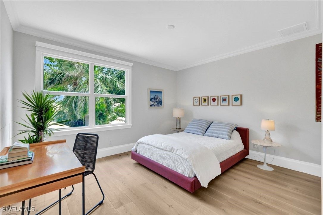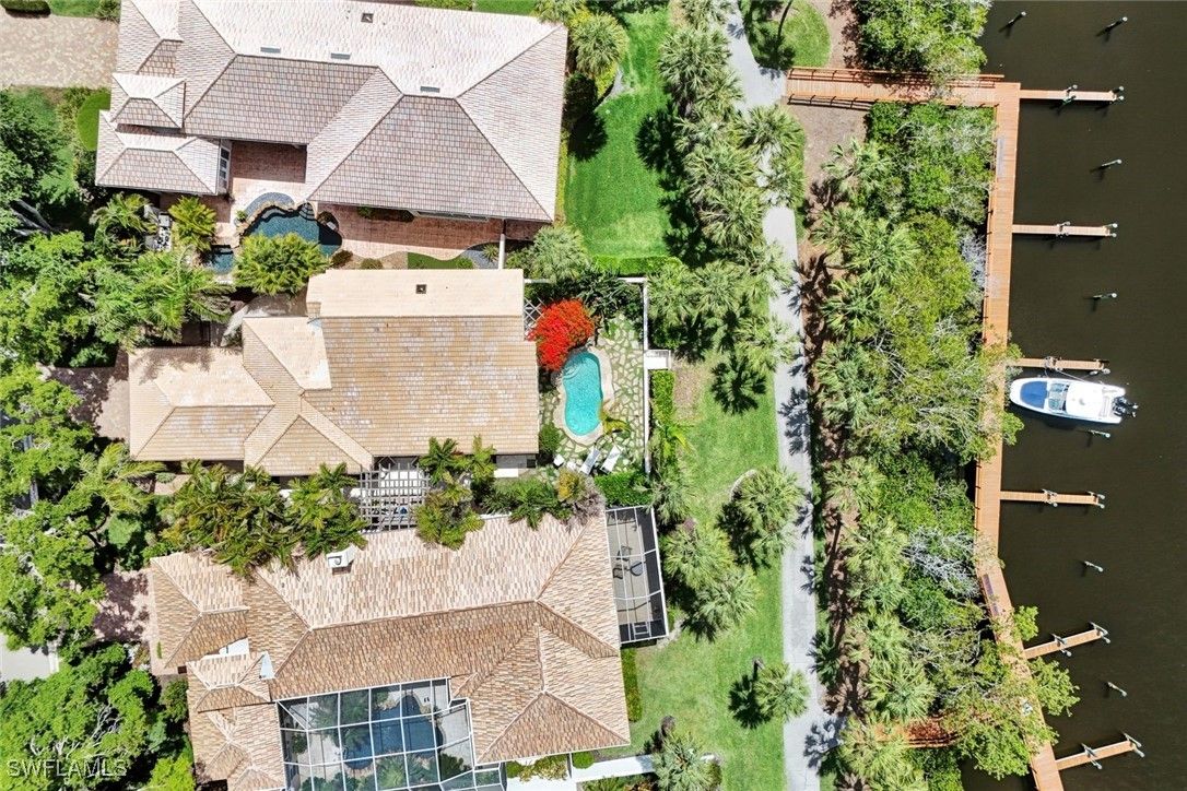 Unique and stylish...rarely available river-facing home in Anchorage at Bonita Bay. One of only nine homes in the community with coveted South and West facing views of the Imperial river, this property is perfectly positioned close to Riverwalk Park, offering tranquil breezes and serene water vistas. A multitude of updates enhance this home with contemporary coastal style. Recent improvements include beautiful Legno Bastone European Oak flooring throughout, a sleek new upstairs bathroom featuring custom cabinetry, and modern new stair railings that add architectural interest and sophistication. The open great room floor plan with soaring vaulted ceilings floods the space with natural light complemented by the custom mahogany front door. The spacious kitchen is appointed with Wolf appliances, a 5-burner gas cooktop, honed granite countertops, and custom cabinetry including a breakfast bar and built-in desk. Spa-like bathrooms feature luxurious stone finishes and multi-jet showers. Outside, lush bougainvillea-covered pergolas create inviting spaces for entertaining and relaxing, seamlessly blending indoor and outdoor living. Bonita Bay offers world-class amenities including a full-service marine, private beach club, miles of walking and miking trails, multiple recreation parks, and tennis and pickleball - all just steps from your front door. This is your chance to experience the best of Florida living in a sophisticated, move-in-ready riverfront retreat - offering all the charm of new construction coastal homes, at a significantly more compelling value.