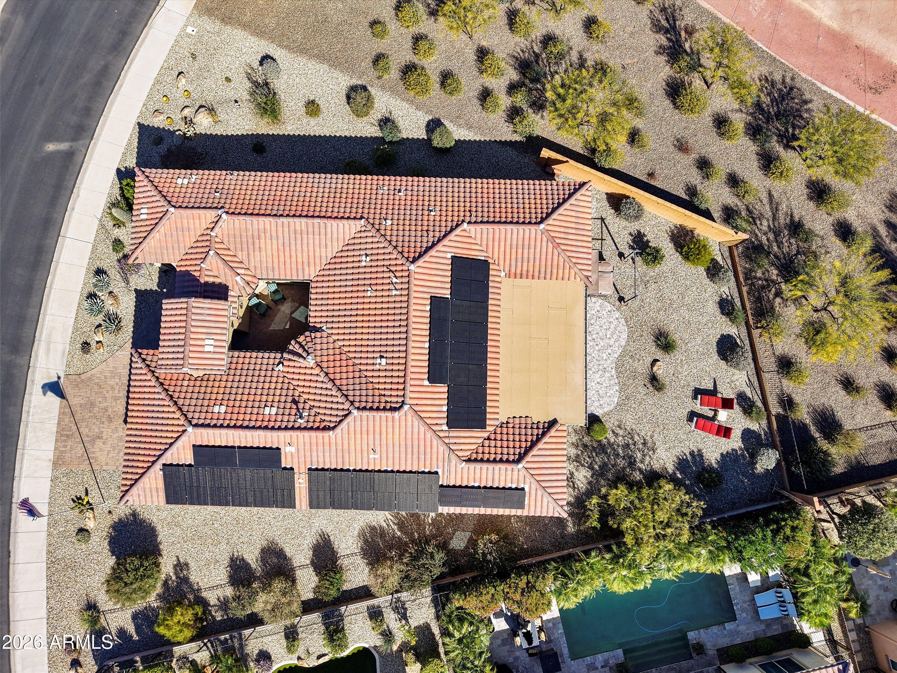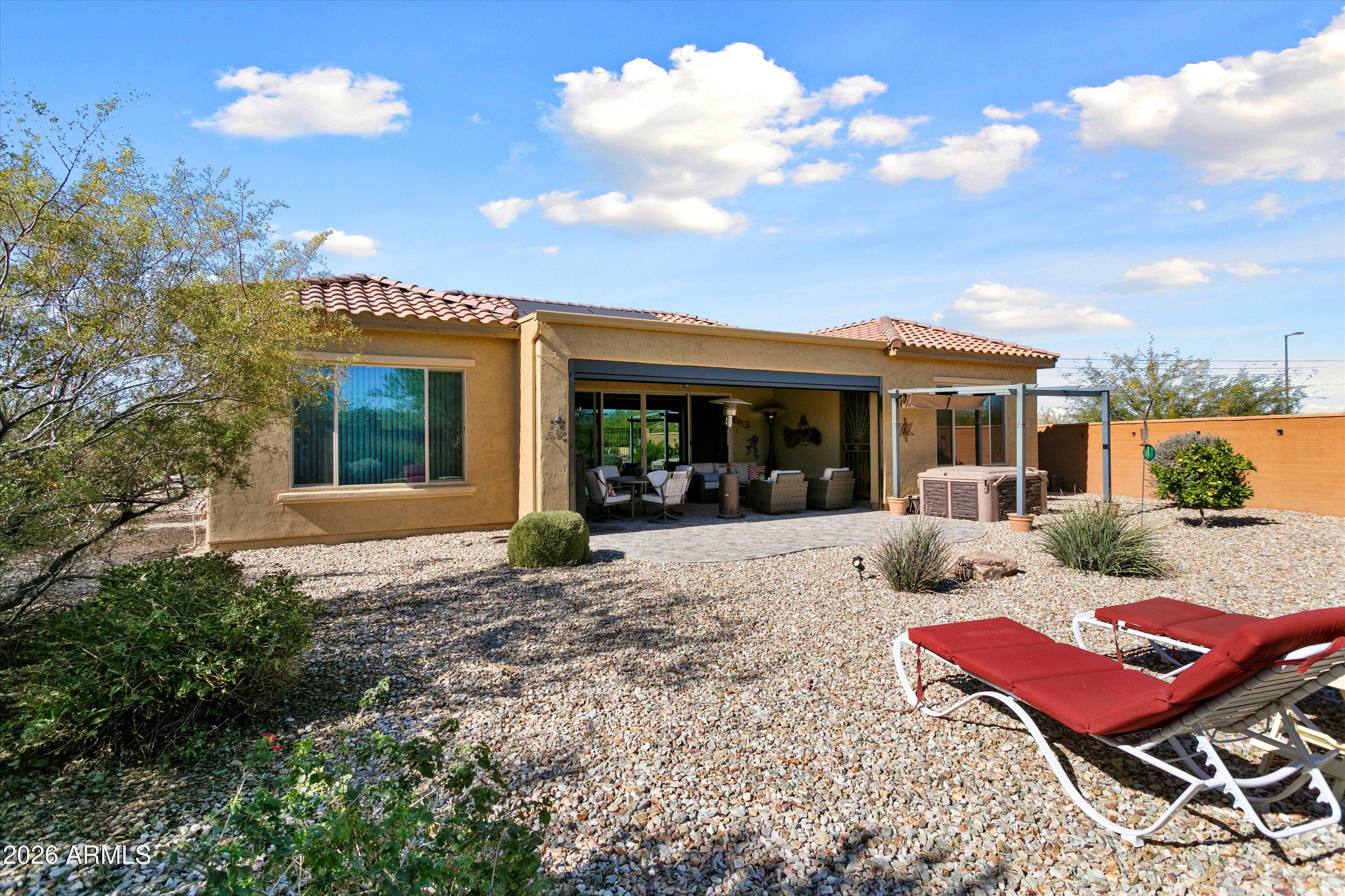 THIS STELLAR JOURNEY MODEL WITH A 2.25% ASSUMABLE VA LOAN, OWNED SOLAR, 4 FT EXTENDED GARAGE AND SITUATED ON A PREMIUM VIEW LOT IS A MUST SEE! Enter this open concept, split floor plan w/contemporary flooring, lighting & window treatments throughout. The spacious living area w/media wall offers plenty of room for dining & entertainment. A chef's kitchen w/upgraded cabinets, backsplash, center island w/pendant lights, gas cook top, & butler's pantry w/boot bench. The extended master suite offers a private patio door & bath w/tile surround shower & large walk-in closet. 2 flex rooms for lounge, office, or hobbies. The 2nd bedroom is complete w/ bath & separate entrance. Relax on your patio w/remote sunshade & misters overlooking the backyard w/spa, ramada & view of the desert landscape.