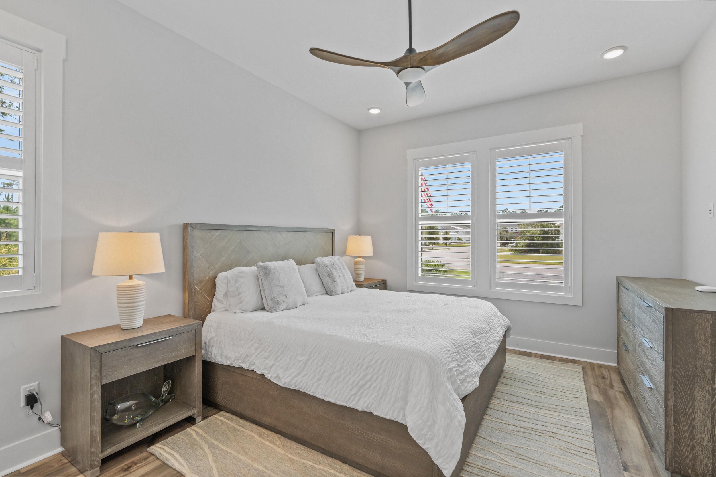 One of only five homesites in the community with rare privacy with serene wooded surroundings on two sides. Home has one of the largest pools and hot tubs in neighborhood. These motivated sellers are ready to move soon as they downsize into a new home in NatureWalk at Origins! Welcome to the Venice floor plan—an exceptional 5-bedroom, 4.5-bath home offering luxury, flexibility, and privacy, all ready for immediate move-in. Thoughtfully designed for multi-generational living, this home features two bedrooms on the main floor, including a spacious primary suite. The two-story living room is an architectural showstopper with a striking linear fireplace framed by floor-to-ceiling tile, creating a dramatic focal point that flows seamlessly into the outdoors. Step through the 5-panel sliding glass doors to your massive covered porch, equipped with motorized screens and overlooking a beautifully paved patio. It all opens up to one of the largest and most private pool and spa retreats in the neighborhood,backed by serene woods on two sides for unmatched privacy. Inside, the gourmet kitchen is a chef's dream, outfitted with high-end GE Café appliances, including a 60" gas cooktop and an oversized refrigerator and freezer. Just off the kitchen, you'll find a generous laundry room and a beverage hub featuring multiple wine fridges and an ice machine- perfect for entertaining, whether you prefer red or white. The main-floor primary suite boasts a spa-like bath with a soaking tub, oversized shower with multiple heads, and a customized walk-in closet with built-ins. An additional en suite bedroom and a bright, inviting office complete the first floor. Upstairs, discover three more bedrooms (one en suite) and an open loft-style living space perfect for relaxing or hosting guests. Lovingly maintained and loaded with designer upgrades- including custom lighting, built-ins, and plantation shutters- this home is like new, but better. Located in NatureWalk at Watersound Origins, enjoy easy access to top-rated schools, Publix, local dining, and the beautiful beaches of 30A. Don't miss your chance to own this one-of-a-kind home in one of the most sought-after neighborhoods on the Emerald Coast. Schedule your private showing today!