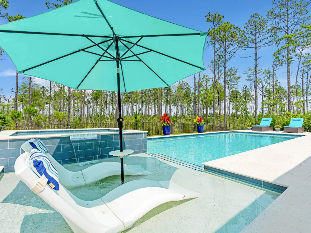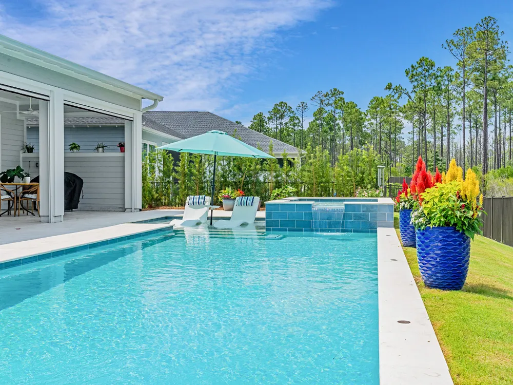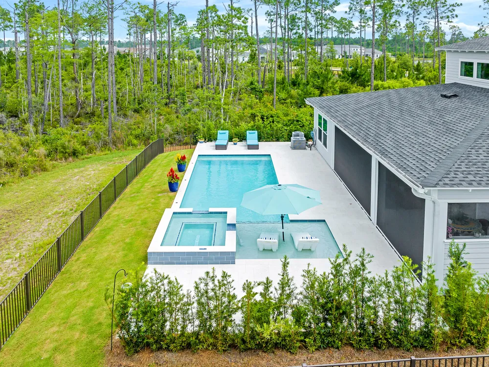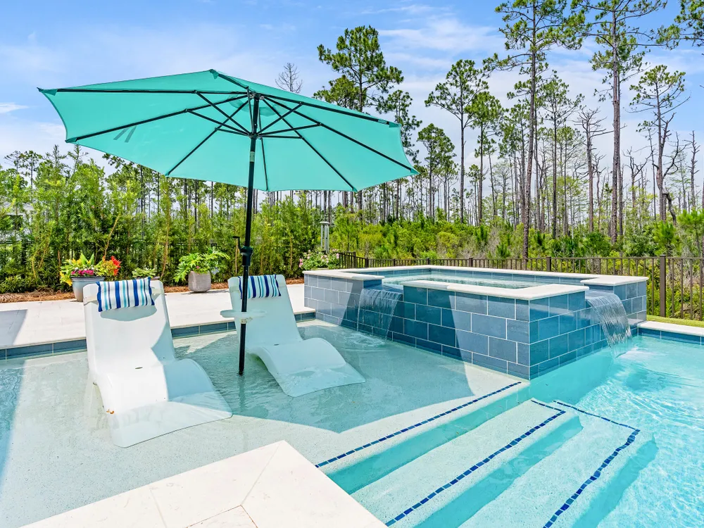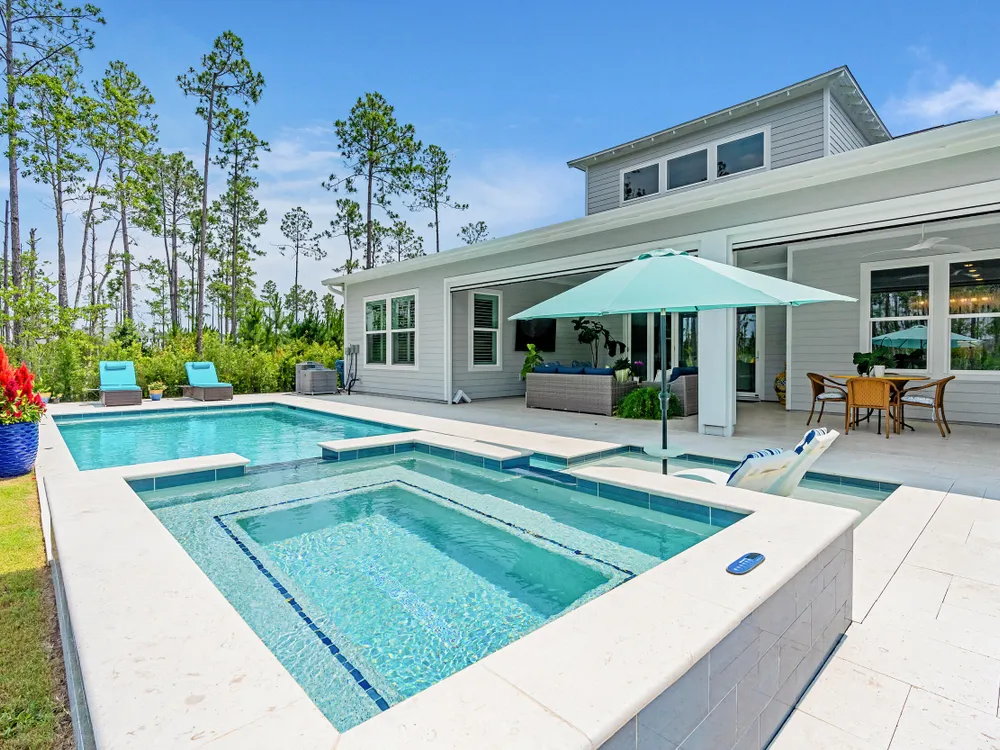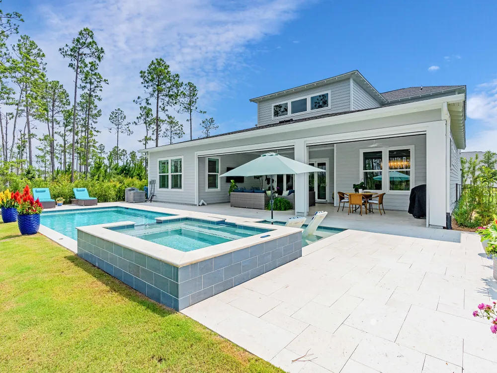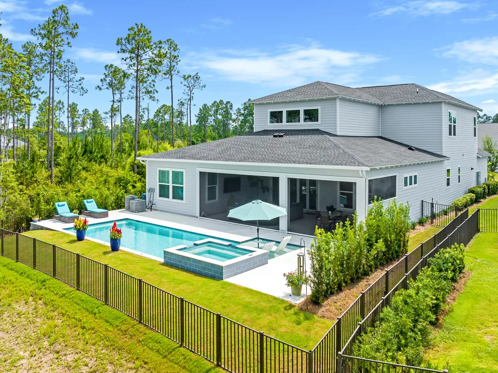 One of only five homesites in the community with rare privacy with serene wooded surroundings on two sides. Home has one of the largest pools and hot tubs in neighborhood. These motivated sellers are ready to move soon as they downsize into a new home in NatureWalk at Origins!Welcome to the Venice floor plan--an exceptional 5-bedroom, 4.5-bath home offering luxury, flexibility, and privacy, all ready for immediate move-in. Thoughtfully designed for multi-generational living, this home features two bedrooms on the main floor, including a spacious primary suite. The two-story living room is an architectural showstopper with a striking linear fireplace framed by floor-to-ceiling tile, creating a dramatic focal point that flows seamlessly into the outdoors.