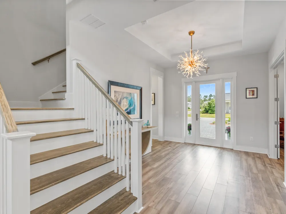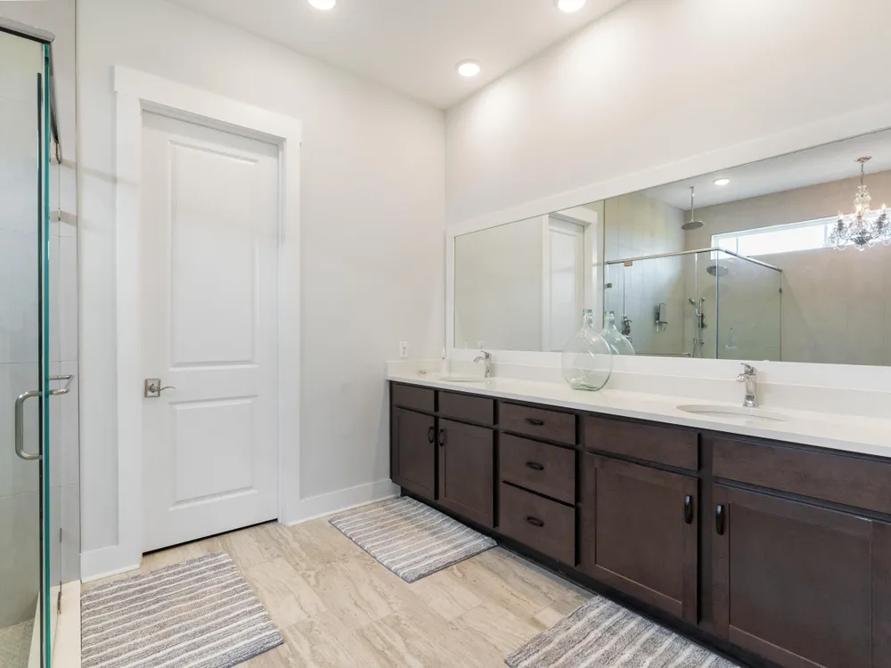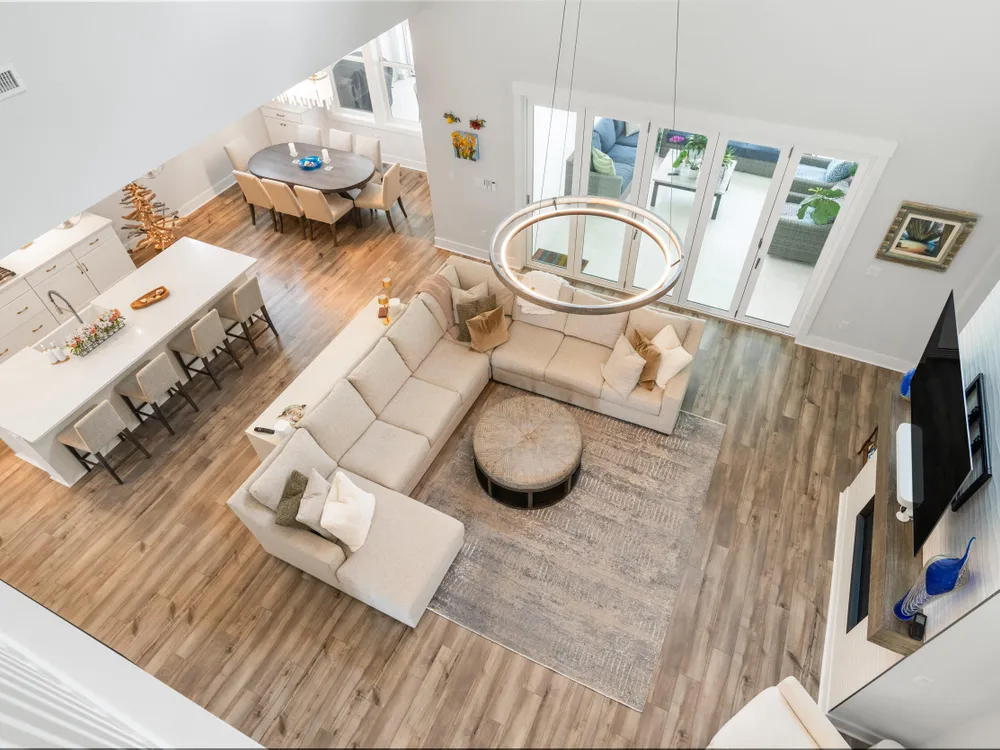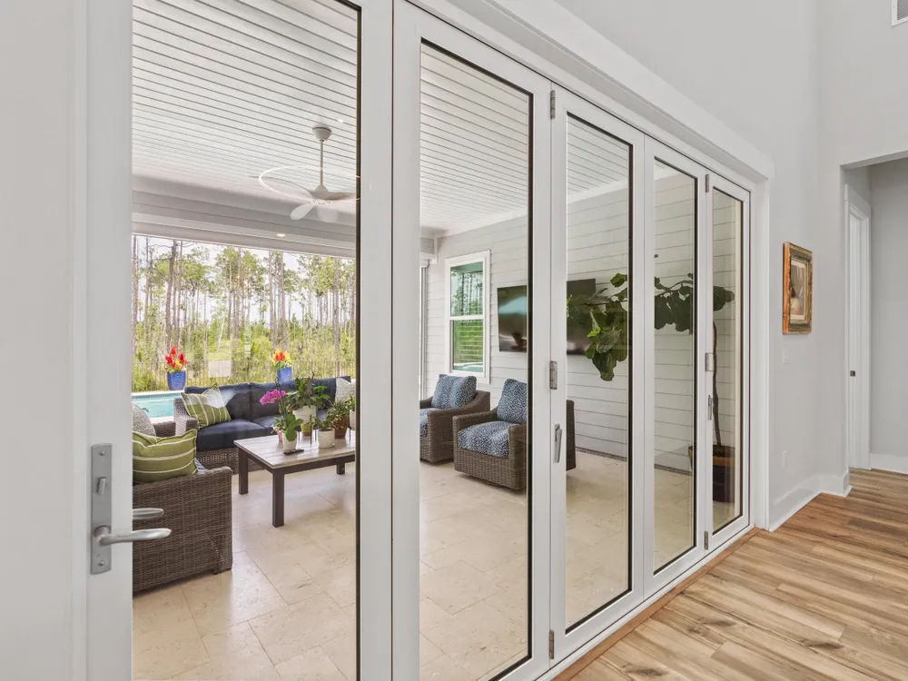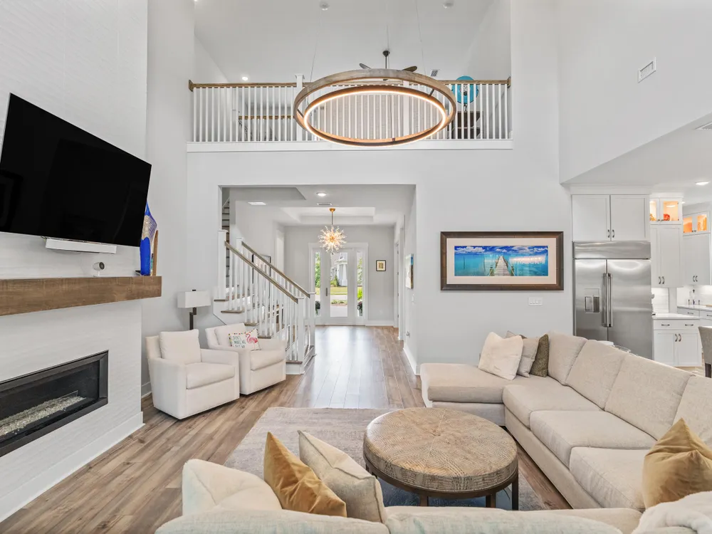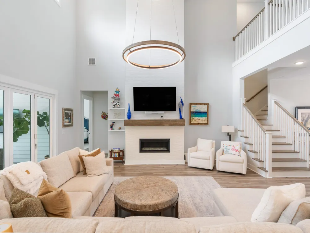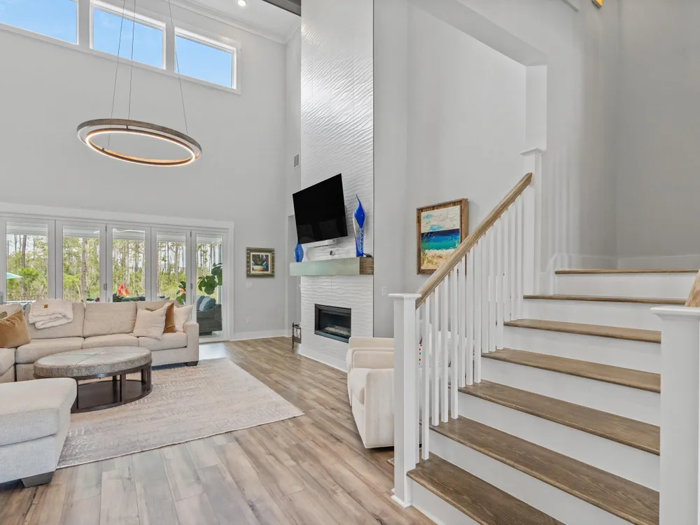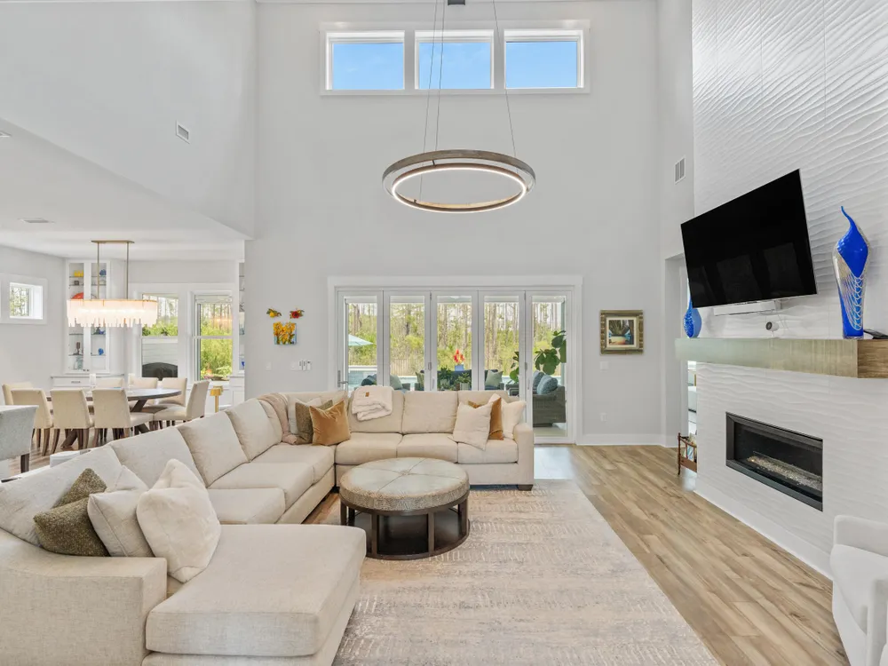 One of only five homesites in the community with rare privacy with serene wooded surroundings on two sides. Home has one of the largest pools and hot tubs in neighborhood. These motivated sellers are ready to move soon as they downsize into a new home in NatureWalk at Origins!Welcome to the Venice floor plan--an exceptional 5-bedroom, 4.5-bath home offering luxury, flexibility, and privacy, all ready for immediate move-in. Thoughtfully designed for multi-generational living, this home features two bedrooms on the main floor, including a spacious primary suite. The two-story living room is an architectural showstopper with a striking linear fireplace framed by floor-to-ceiling tile, creating a dramatic focal point that flows seamlessly into the outdoors.