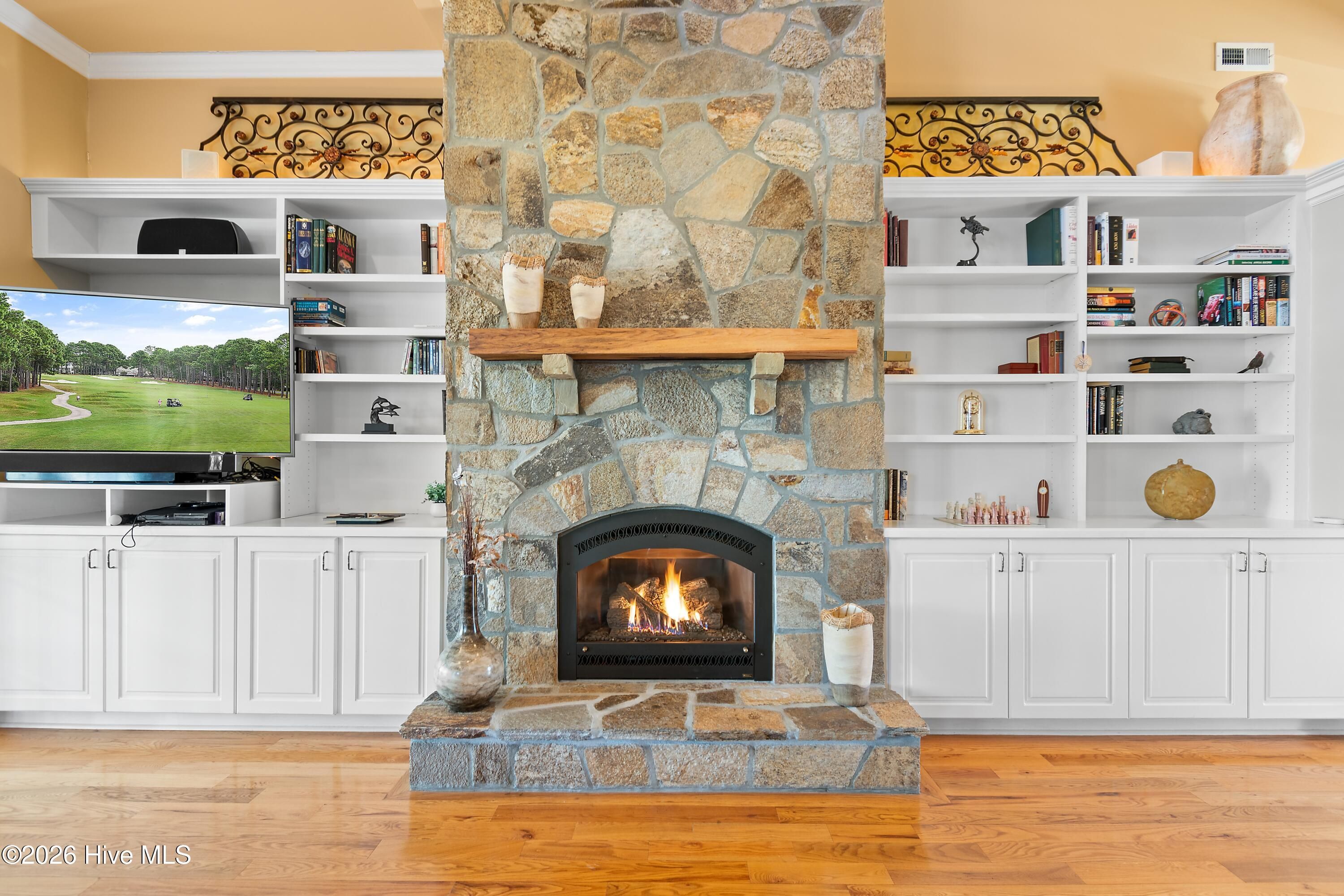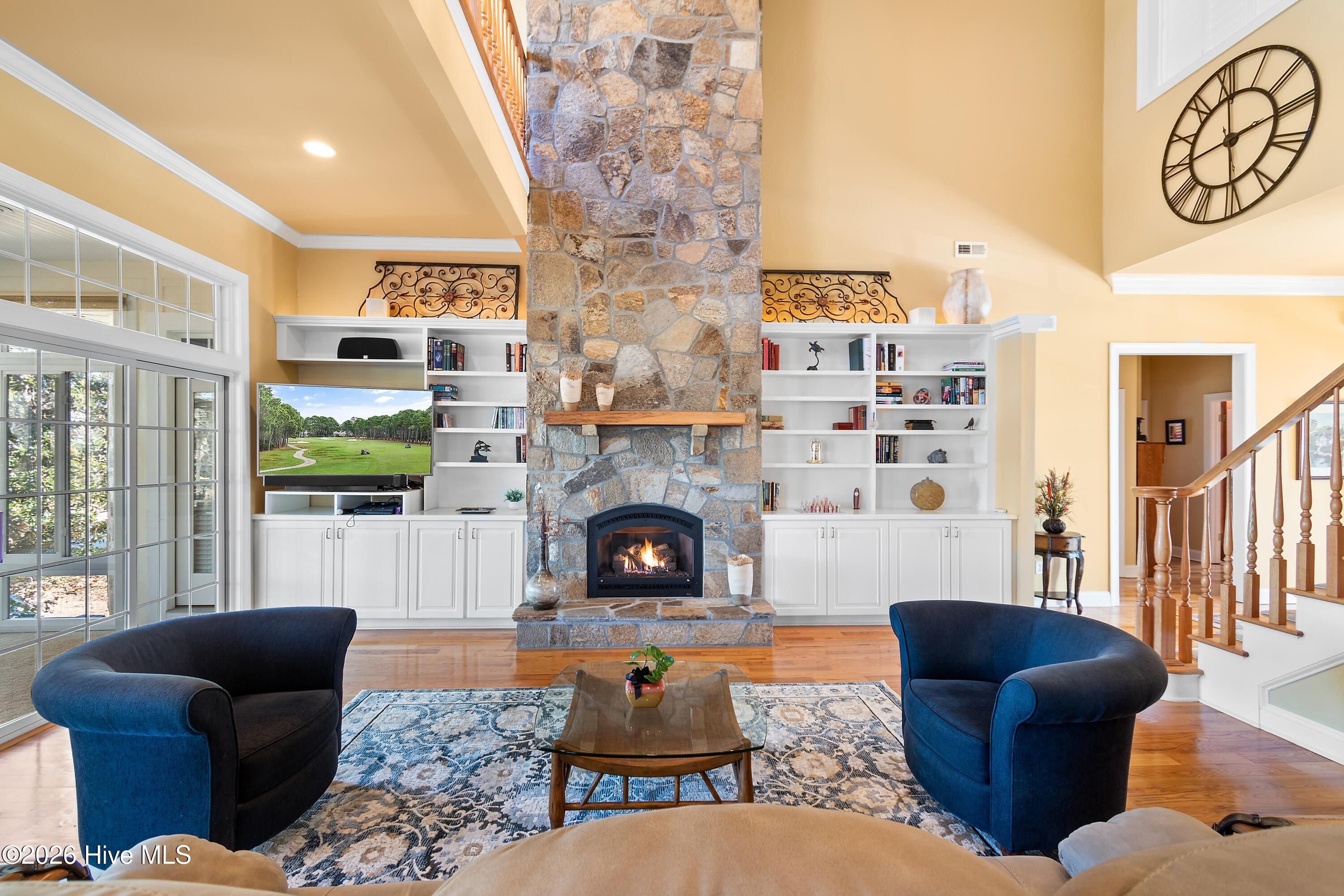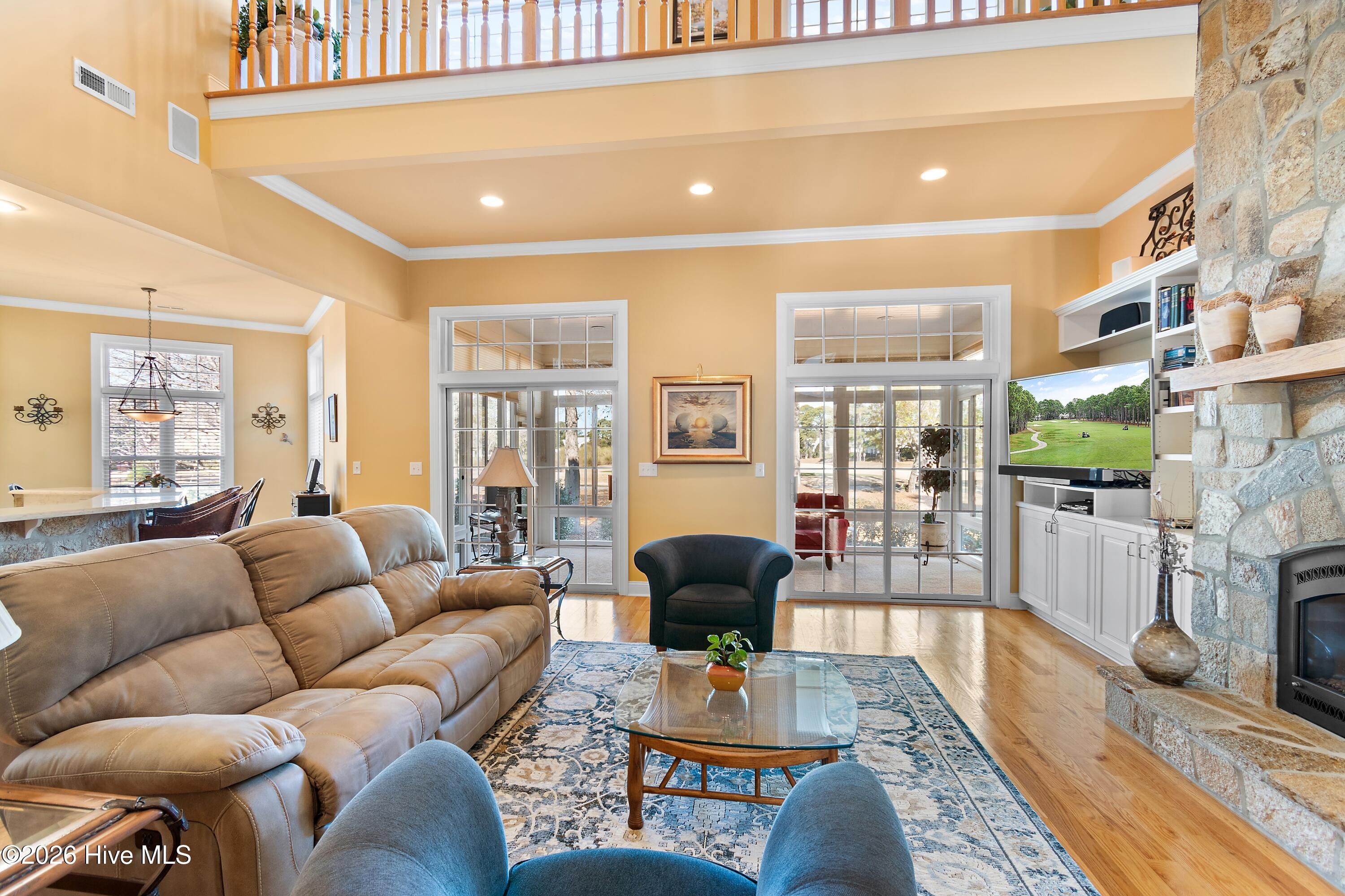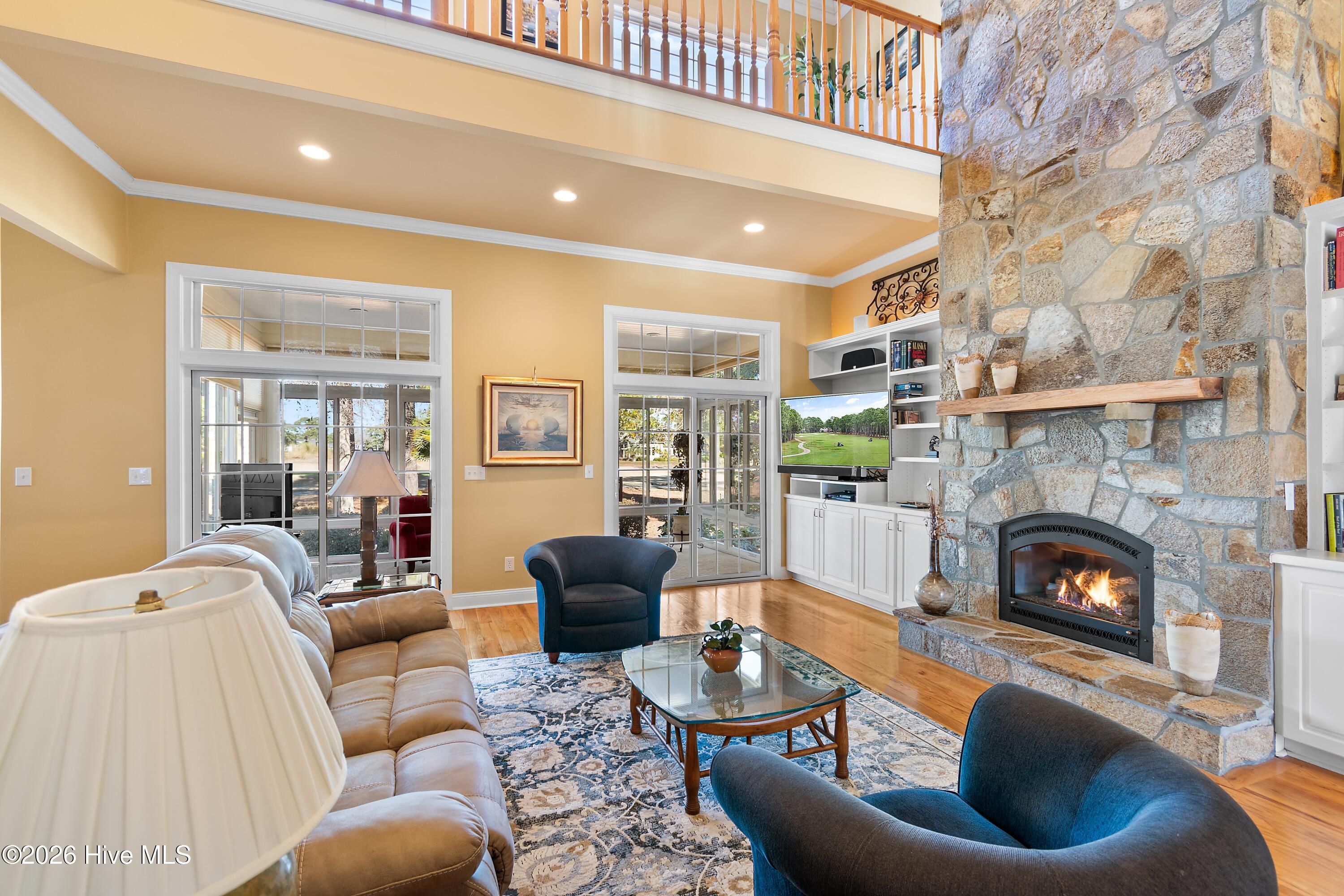 GREAT VALUE in this Architecturally delightful, energy-efficient & situated to enjoy expansive views of the 5th hole on the Cate golf course. $10,000 PAINT ALLOWANCE to be credited at closing. Beyond the meticulously kept lawn, indulge in an open concept layout offering a casual ambiance for both relaxation and entertainment. Step into this exquisite golf-front residence to be instantly captivated by the grandeur of a two-story stone fireplace and the abundance of natural light streaming through dual sets of double sliding glass doors. These doors open to a charming four-season sunroom that offers serene views of the backyard and the lush golf course beyond. The expansive, updated kitchen is a culinary dream, featuring double wall ovens, a gas cooktop, custom cabinetry with intricate detailing, quartz countertops, a generous pantry, and stainless steel appliances. The private owner's suite is a true retreat, showcasing double tray ceilings, bay windows with tranquil golf course vistas, and direct access to the sunroom. The ensuite bath is designed for relaxation, complete with separate vanities, a jetted soaking tub, walk-in shower, private water closet, and a spacious walk-in closet. The first floor also includes a formal dining room, a dedicated office with French doors, large laundry room with a utility sink, powder room, and a three-car garage with epoxy flooring. Upstairs, enjoy a versatile flex/game room with a wet bar, two additional spacious bedrooms, two full bathrooms, a cozy landing overlooking the great room, and ample walk-in attic storage. Additional features include a new HVAC system, Rinnai tankless water heater, whole-house water softener and purification systems, an encapsulated crawlspace with dehumidifier, central vacuum, and solar panels—making for an impressively low electric bill. Thoughtfully designed for both luxury and comfort, this home offers an exceptional living experience in a non-flood zone location. for those who appreciate attention to detail, luxury, and comfort, designed to create an exceptional living experience. St. James boasts four golf courses, 81 holes right in your neighborhood, with 4 distinct clubhouses, 3 fitness centers, tennis and pickleball courts, indoor and outdoor pools, parks, kayak launch, a full-service Marina with 475 boat slips, The Apothecary of St. James full-service Pharmacy, Beacon 315 Restaurant and Amphitheater. Nature enthusiasts will love the 36+ miles of biking and walking trails that wind through scenic ponds and the Intracoastal Waterway. St. James has it all. Residents relax at the private beach club on Oak Island, with stunning views, a seaside pool, showers, picnic area, and private parking. Start your new lifestyle at St. James Plantation today! Pool table in bonus room conveys with the home