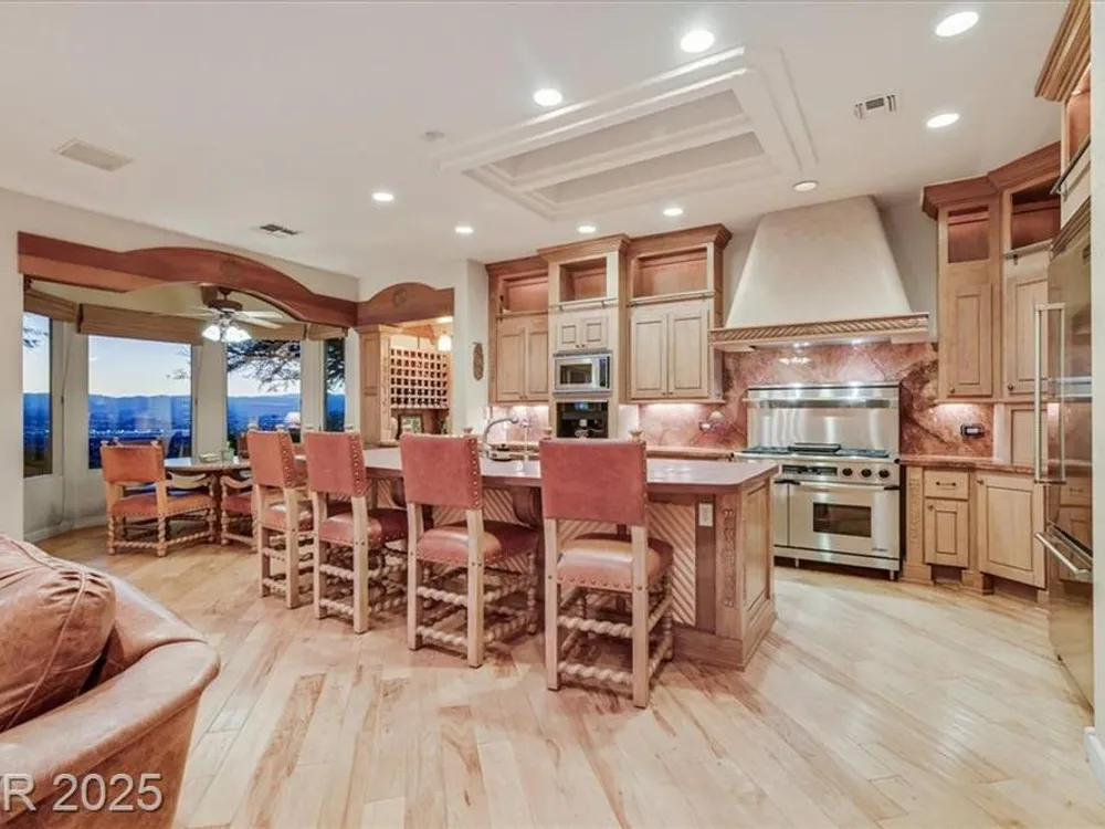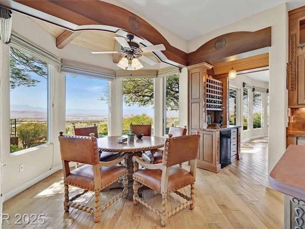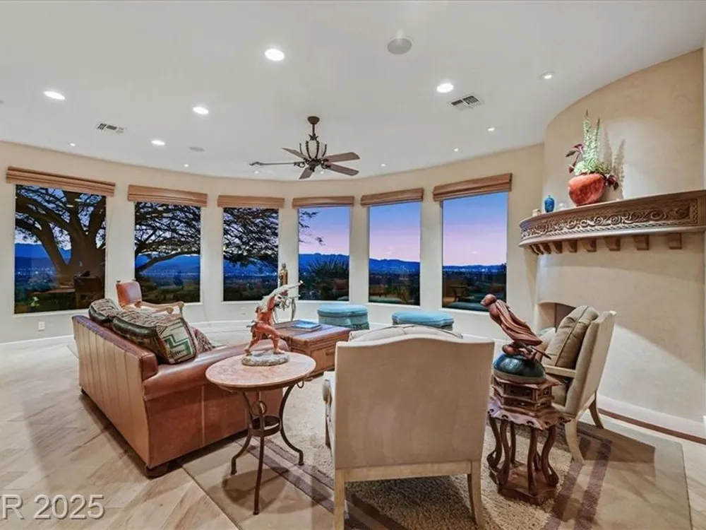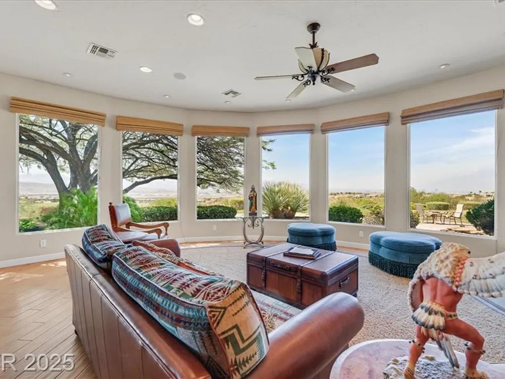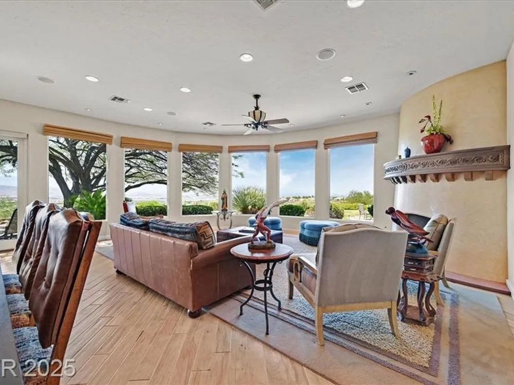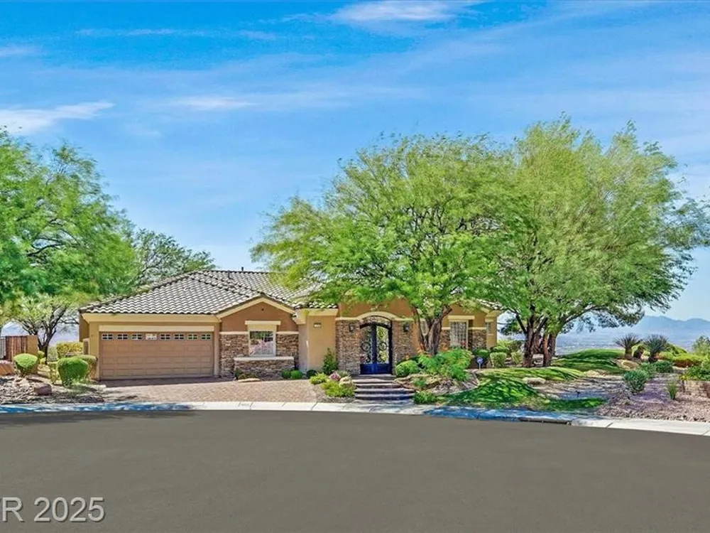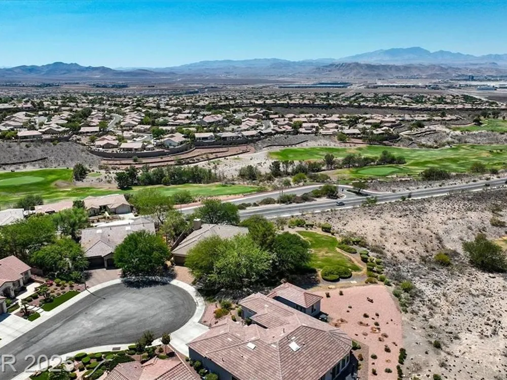 Del Webb Anthem model*Fully customized T/O*Rare enclosed courtyard affords additional patio w/privacy & dramatic entrance to home*$100,000 HVAC systems installed Nov. 2023*3 Dalkin zoned split system units*(1)3-ton 19.2 seer unit+(2)4-ton 19.2 seer units+gas furnaces*High-end kitchen w/Miele coffee system,stainless-steel appliances inc. Fisher-Paykel double dishwasher,built-in ice maker,Viking Refrigerator*Decor Microwave*Decor 6 burner Gas Range w/griddle & electric double oven*Full fan system*Top line granite counters w/full solid granite backsplash*Huge island breakfast bar w/Redrock quarried stone w/skylight*Extensive kitchen ceiling height cabinetry/shelves w/rolling ladder access*Breakfast rm w/bay windows,custom wood ceiling & table w/chairs*Unsurpassed 180° views of the Las Vegas Valley from the southern Mt Charleston Range to the LV Strip & magnificent view of the Sphere*Perched above the Gorgeous Revere Golf Course*NOTE: Please look at attachments for extensive features list*