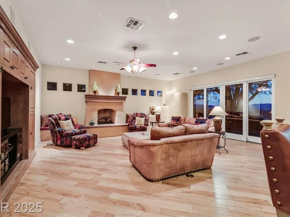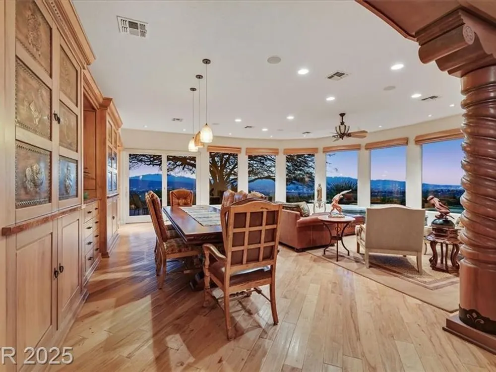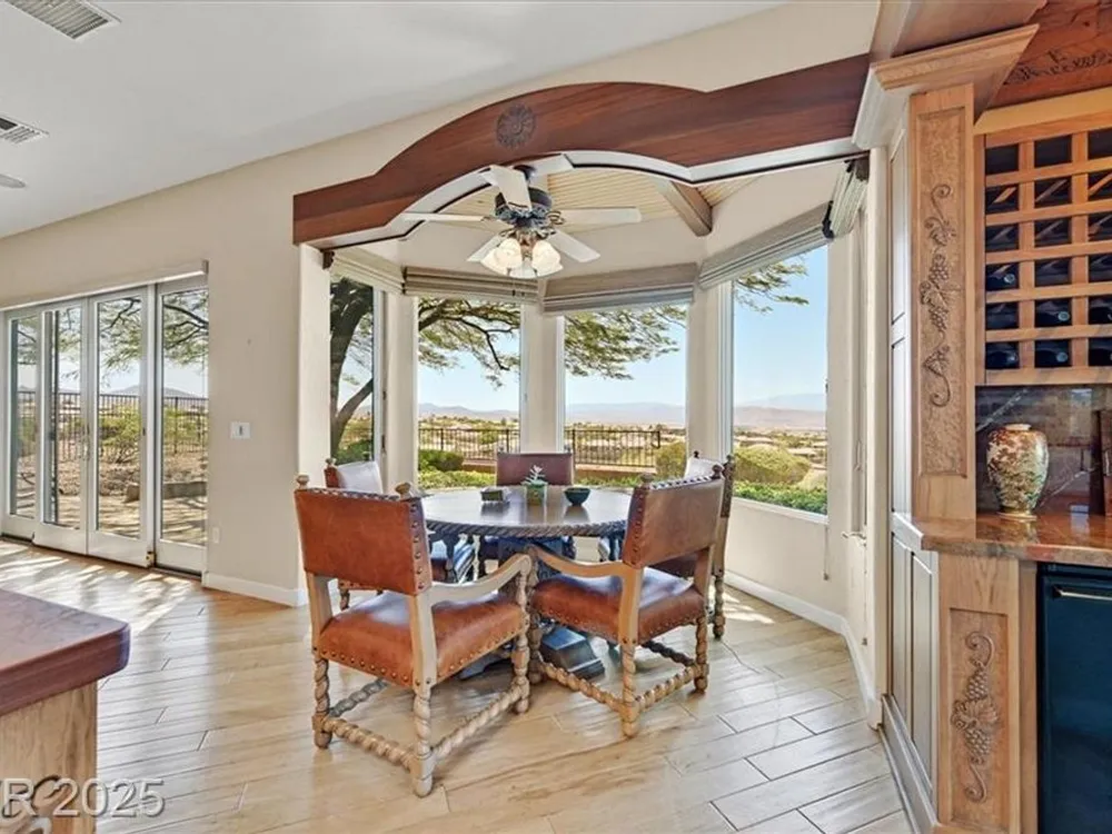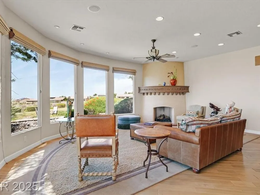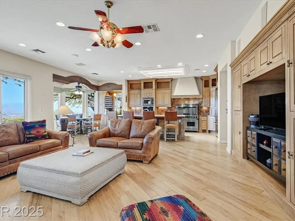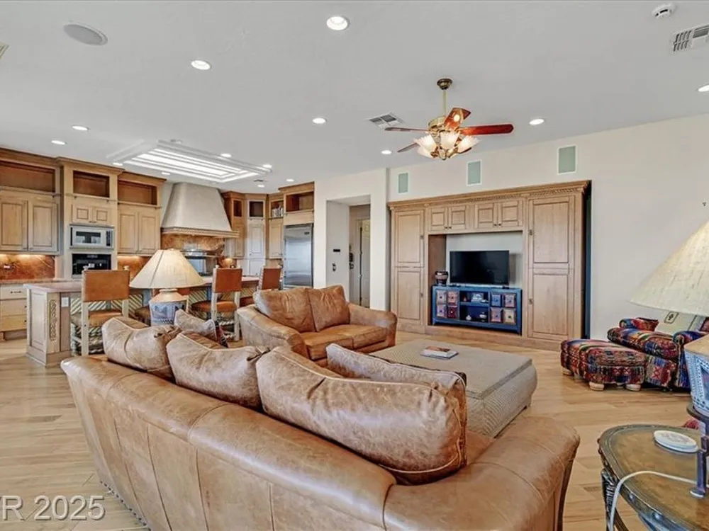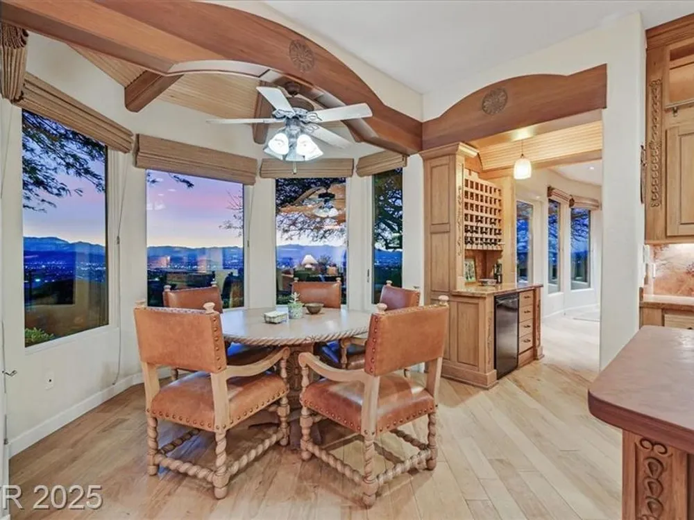 Del Webb Anthem model*Fully customized T/O*Rare enclosed courtyard affords additional patio w/privacy & dramatic entrance to home*$100,000 HVAC systems installed Nov. 2023*3 Dalkin zoned split system units*(1)3-ton 19.2 seer unit+(2)4-ton 19.2 seer units+gas furnaces*High-end kitchen w/Miele coffee system,stainless-steel appliances inc. Fisher-Paykel double dishwasher,built-in ice maker,Viking Refrigerator*Decor Microwave*Decor 6 burner Gas Range w/griddle & electric double oven*Full fan system*Top line granite counters w/full solid granite backsplash*Huge island breakfast bar w/Redrock quarried stone w/skylight*Extensive kitchen ceiling height cabinetry/shelves w/rolling ladder access*Breakfast rm w/bay windows,custom wood ceiling & table w/chairs*Unsurpassed 180° views of the Las Vegas Valley from the southern Mt Charleston Range to the LV Strip & magnificent view of the Sphere*Perched above the Gorgeous Revere Golf Course*NOTE: Please look at attachments for extensive features list*