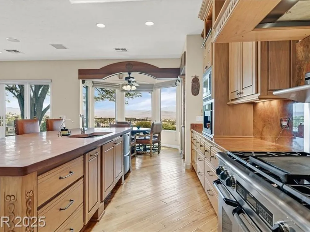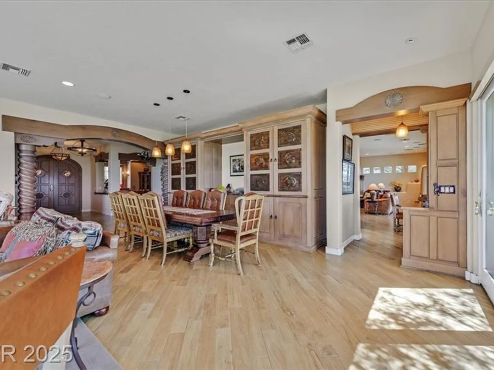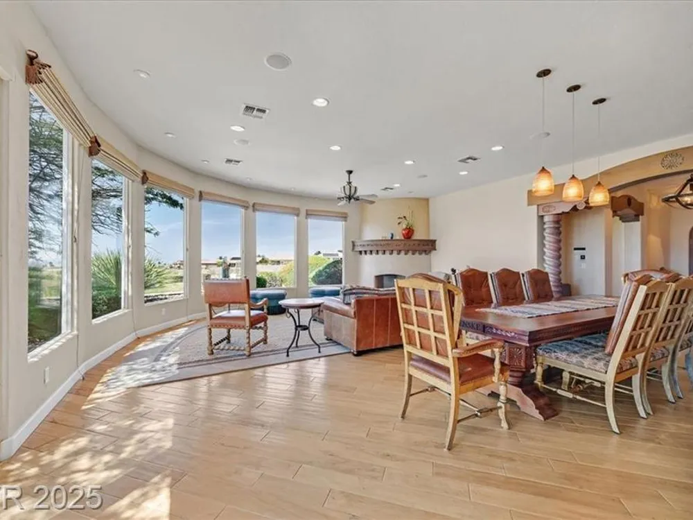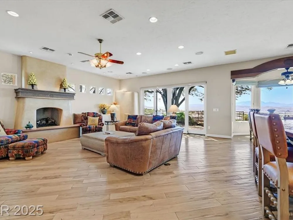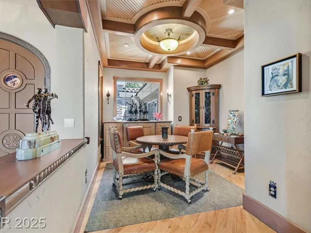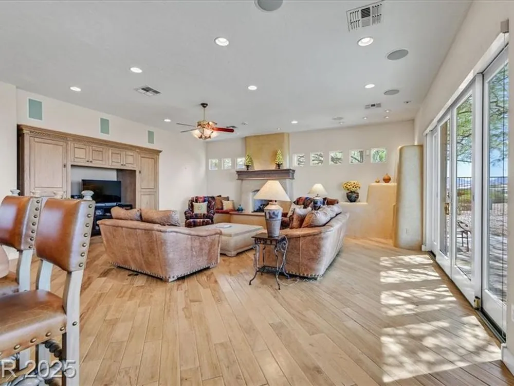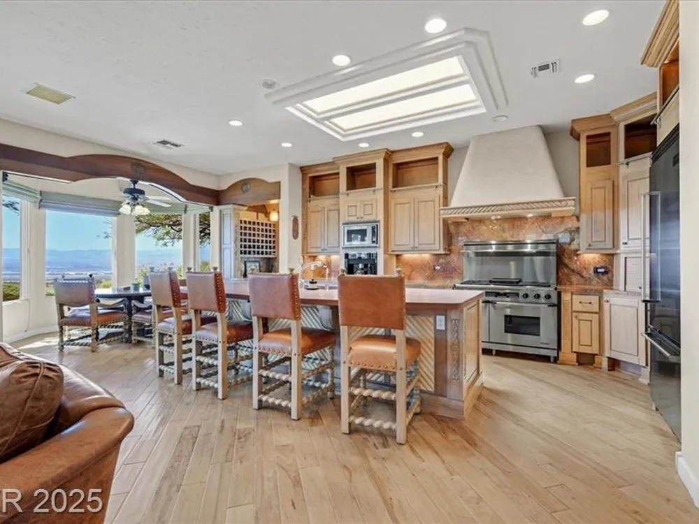 Del Webb Anthem model*Fully customized T/O*Rare enclosed courtyard affords additional patio w/privacy & dramatic entrance to home*$100,000 HVAC systems installed Nov. 2023*3 Dalkin zoned split system units*(1)3-ton 19.2 seer unit+(2)4-ton 19.2 seer units+gas furnaces*High-end kitchen w/Miele coffee system,stainless-steel appliances inc. Fisher-Paykel double dishwasher,built-in ice maker,Viking Refrigerator*Decor Microwave*Decor 6 burner Gas Range w/griddle & electric double oven*Full fan system*Top line granite counters w/full solid granite backsplash*Huge island breakfast bar w/Redrock quarried stone w/skylight*Extensive kitchen ceiling height cabinetry/shelves w/rolling ladder access*Breakfast rm w/bay windows,custom wood ceiling & table w/chairs*Unsurpassed 180° views of the Las Vegas Valley from the southern Mt Charleston Range to the LV Strip & magnificent view of the Sphere*Perched above the Gorgeous Revere Golf Course*NOTE: Please look at attachments for extensive features list*
