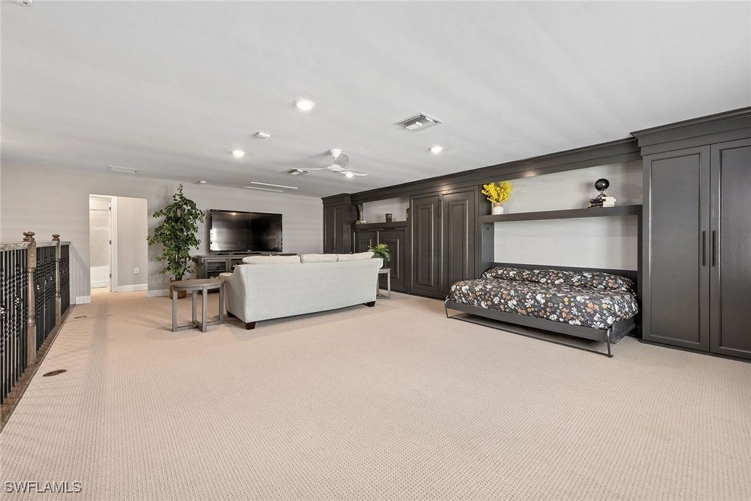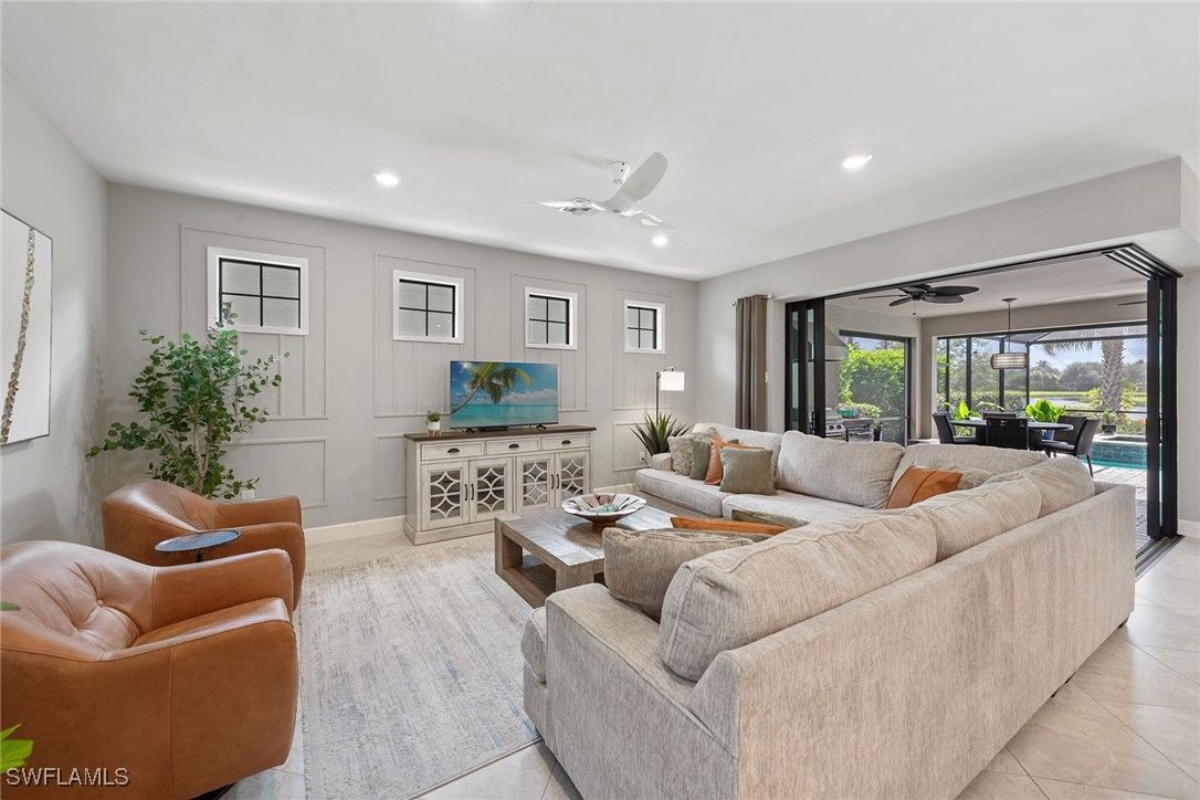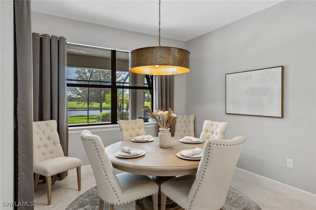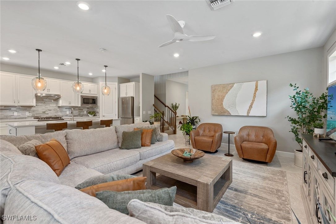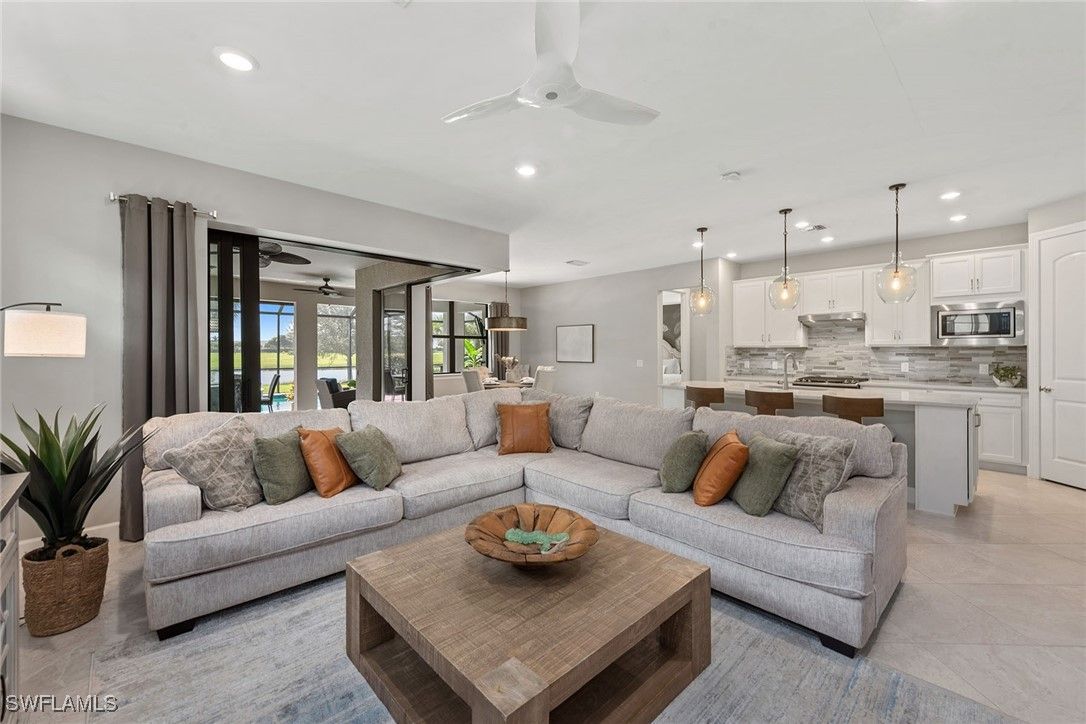 Enjoy beautiful water views framed by tropical palms and the warmth of the morning sun from this furnished, custom-upgraded home in Amaranda in the well-regarded Fiddler’s Creek community. Built in 2019, this two-story residence offers three bedrooms plus a den, three full baths and a two-car garage, combining refined design with exceptional indoor-outdoor living. The open-concept main level features diagonal porcelain tile flooring, recessed lighting, an upgraded entry door, and a spacious living area enhanced by custom wall molding and upgraded zero-corner sliding doors that open fully to the lanai. The open kitchen is beautifully appointed with white cabinetry, quartz counters, natural stone backsplash, a large island with pendant lighting and bar seating, and a walk-in pantry with custom shelving. Stainless appliances include a five-burner natural gas range with hood, built-in microwave, dishwasher and a new Samsung French door refrigerator. An adjacent dining area enjoys picturesque water views. A private den with French doors provides the ideal office or study. The owner’s suite is a tranquil retreat with tray ceilings, a lakeview window framed by plantation shutters, a custom hand-painted accent wall, and wood-look porcelain tile floors. Pocket doors lead to a spa-like bath with dual quartz vanities, an expansive walk-in shower with multiple shower heads, floor-to-ceiling tile, a built-in bench and niche, and a large walk-in closet with built-ins. A guest suite with bay windows and plantation shutters plus an adjacent full bath with a glass-enclosed walk-in shower offers comfort for family and friends. Upstairs, a flexible media or game room is equipped with a custom Murphy bed system featuring one queen and two full beds, generous storage and an additional guest room with a full bath. The extended covered lanai was designed for entertaining, featuring Storm Smart shutters, and a Bull summer kitchen with flat cooktop gas grill, backsplash and hood, sink and mini-refrigerator. A heated saltwater pool/spa with waterfall feature are complemented by an Intellichlor salt system, variable-speed pump and app-controlled pool equipment. Additional upgrades include impact doors/windows, Cummins 20-kilowatt natural gas generator, epoxy-finished garage with storage and FPL EV charger, Google Nest thermostats, Google cameras, and a well-appointed laundry room with utility sink, counter space, cabinetry, newer Samsung top-load washer and front-load gas dryer with steam function. Residents enjoy an expansive clubhouse with fine and casual dining, resort-style pool, fitness center with classes, active tennis and pickleball, bocce, spa services and a full social calendar. Optional memberships are available for The Tarpon Club with beach and marina access and The Golf Club with its newly renovated course and new clubhouse. Minutes from Marco Island, downtown Naples and white-sand beaches, this home offers the best of resort-style Florida living.