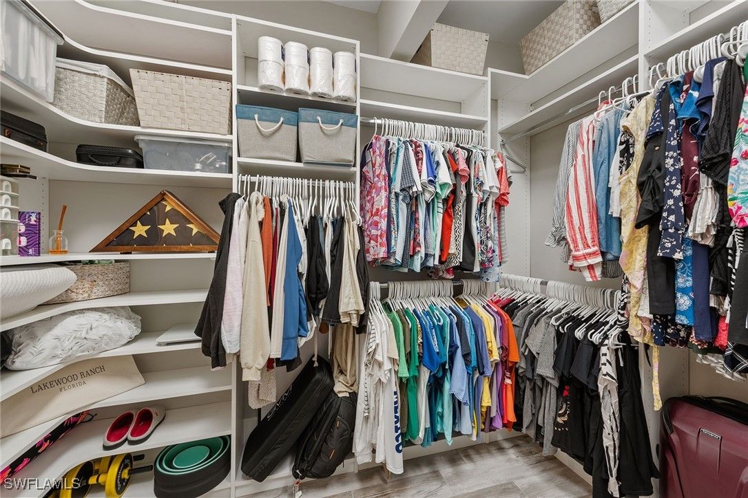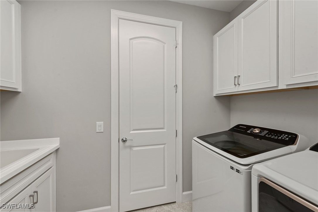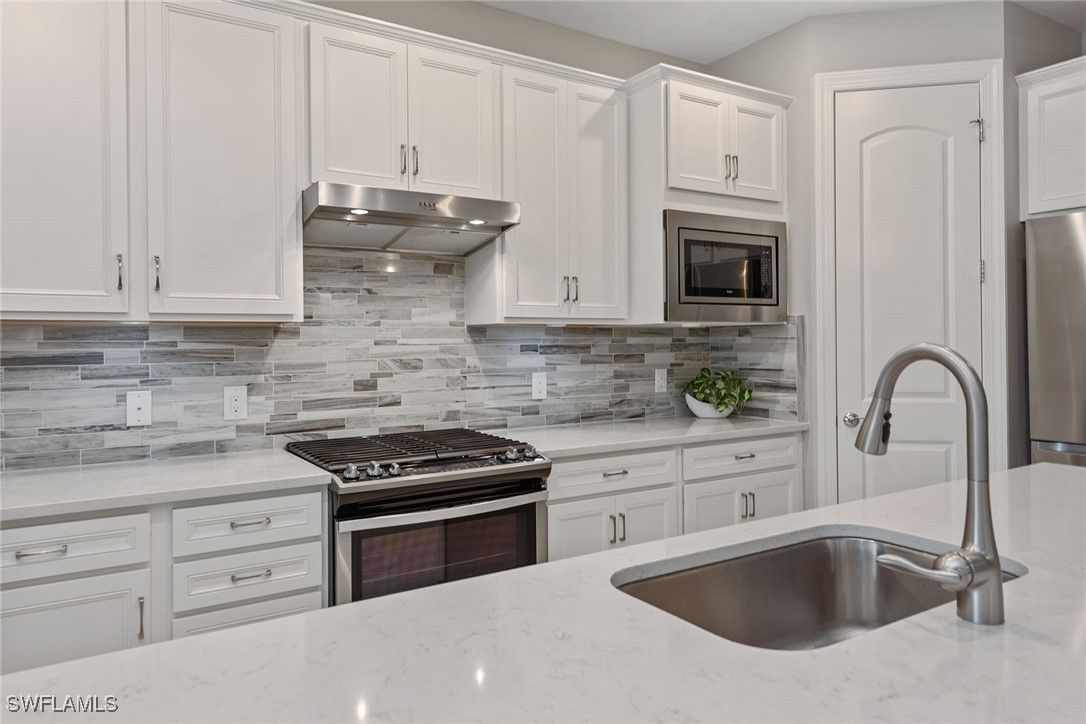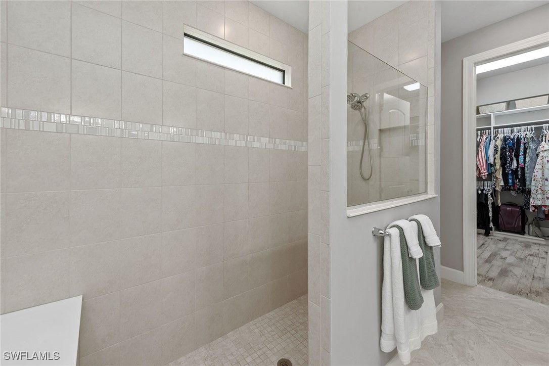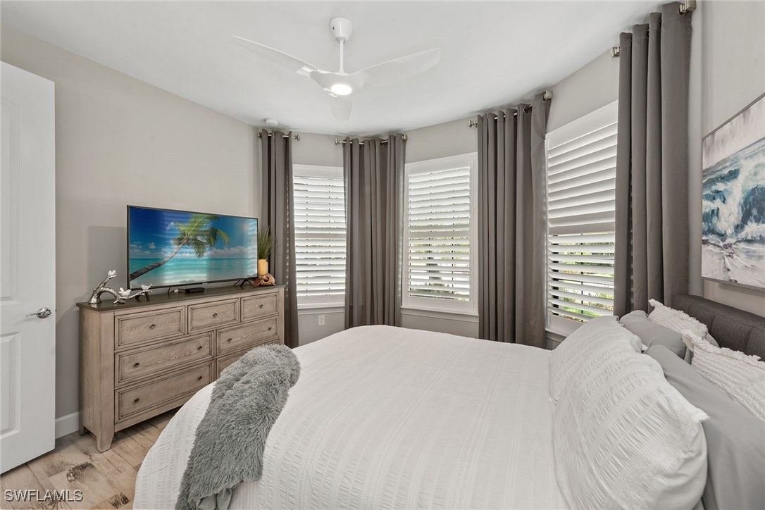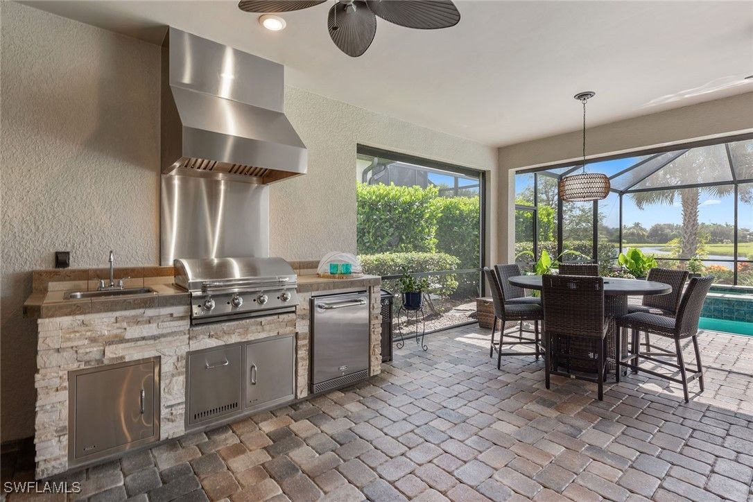 Enjoy beautiful water views framed by tropical palms and the warmth of the morning sun from this furnished, custom-upgraded home in Amaranda in the well-regarded Fiddler’s Creek community. Built in 2019, this two-story residence offers three bedrooms plus a den, three full baths and a two-car garage, combining refined design with exceptional indoor-outdoor living. The open-concept main level features diagonal porcelain tile flooring, recessed lighting, an upgraded entry door, and a spacious living area enhanced by custom wall molding and upgraded zero-corner sliding doors that open fully to the lanai. The open kitchen is beautifully appointed with white cabinetry, quartz counters, natural stone backsplash, a large island with pendant lighting and bar seating, and a walk-in pantry with custom shelving. Stainless appliances include a five-burner natural gas range with hood, built-in microwave, dishwasher and a new Samsung French door refrigerator. An adjacent dining area enjoys picturesque water views. A private den with French doors provides the ideal office or study. The owner’s suite is a tranquil retreat with tray ceilings, a lakeview window framed by plantation shutters, a custom hand-painted accent wall, and wood-look porcelain tile floors. Pocket doors lead to a spa-like bath with dual quartz vanities, an expansive walk-in shower with multiple shower heads, floor-to-ceiling tile, a built-in bench and niche, and a large walk-in closet with built-ins. A guest suite with bay windows and plantation shutters plus an adjacent full bath with a glass-enclosed walk-in shower offers comfort for family and friends. Upstairs, a flexible media or game room is equipped with a custom Murphy bed system featuring one queen and two full beds, generous storage and an additional guest room with a full bath. The extended covered lanai was designed for entertaining, featuring Storm Smart shutters, and a Bull summer kitchen with flat cooktop gas grill, backsplash and hood, sink and mini-refrigerator. A heated saltwater pool/spa with waterfall feature are complemented by an Intellichlor salt system, variable-speed pump and app-controlled pool equipment. Additional upgrades include impact doors/windows, Cummins 20-kilowatt natural gas generator, epoxy-finished garage with storage and FPL EV charger, Google Nest thermostats, Google cameras, and a well-appointed laundry room with utility sink, counter space, cabinetry, newer Samsung top-load washer and front-load gas dryer with steam function. Residents enjoy an expansive clubhouse with fine and casual dining, resort-style pool, fitness center with classes, active tennis and pickleball, bocce, spa services and a full social calendar. Optional memberships are available for The Tarpon Club with beach and marina access and The Golf Club with its newly renovated course and new clubhouse. Minutes from Marco Island, downtown Naples and white-sand beaches, this home offers the best of resort-style Florida living.